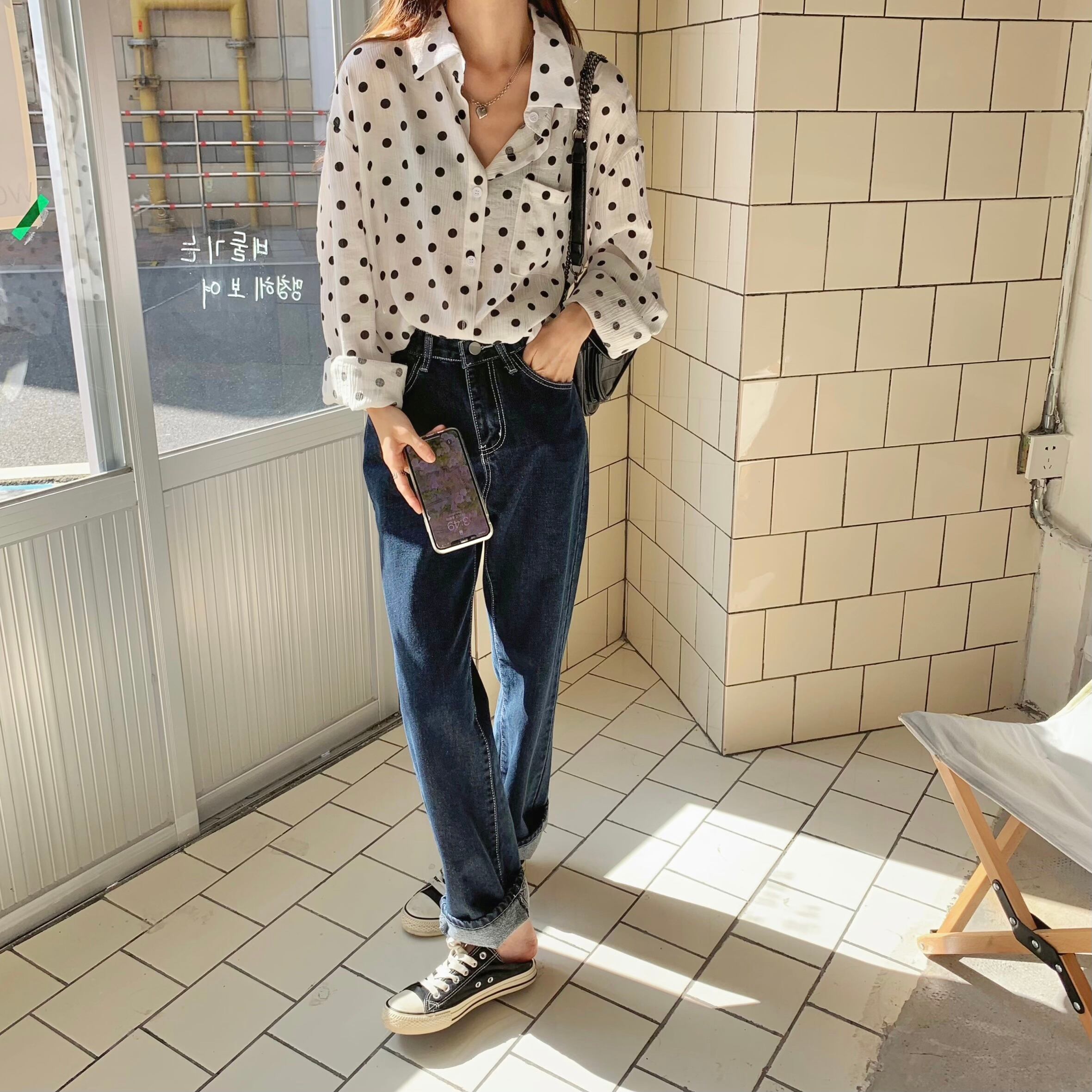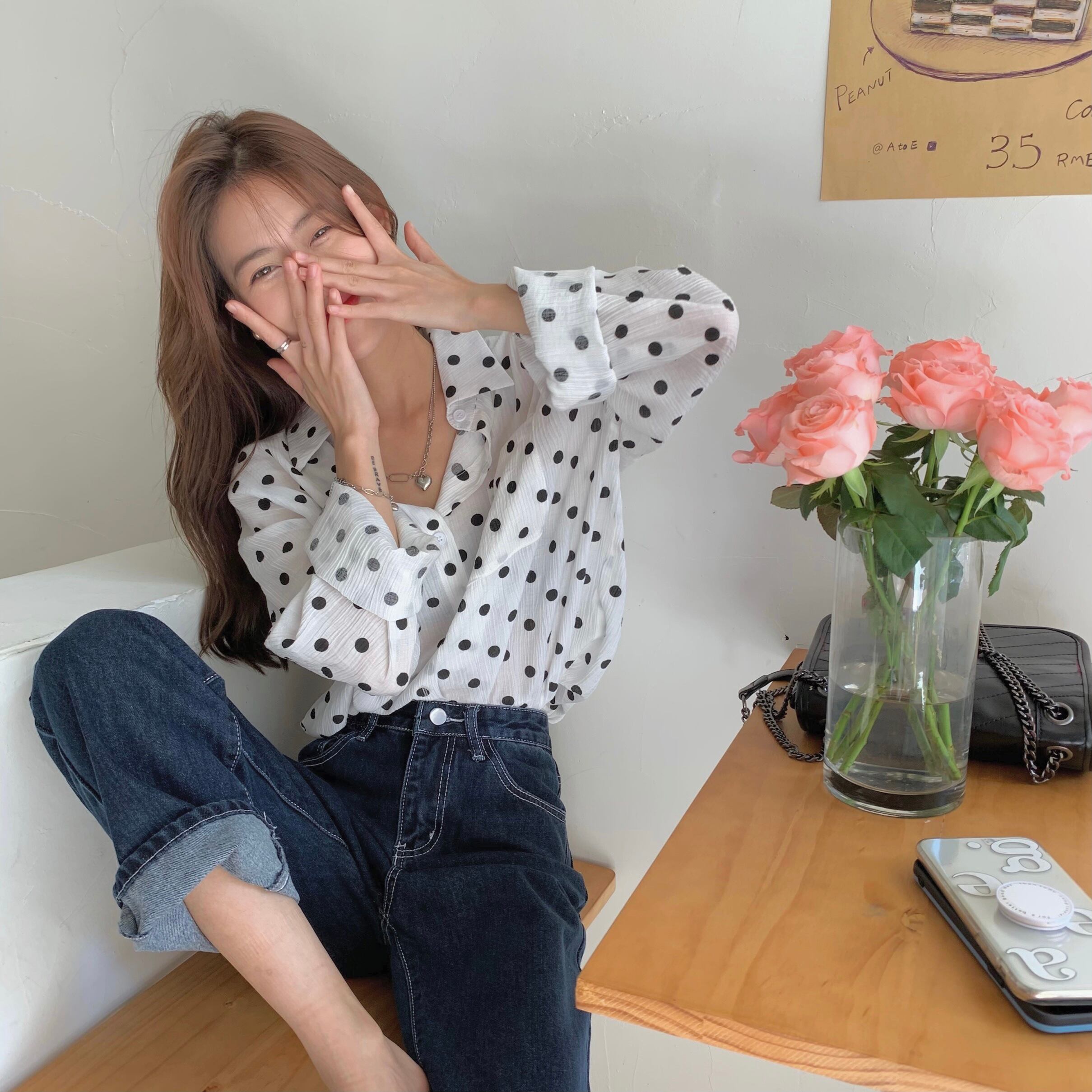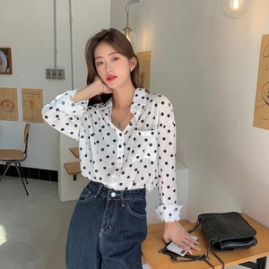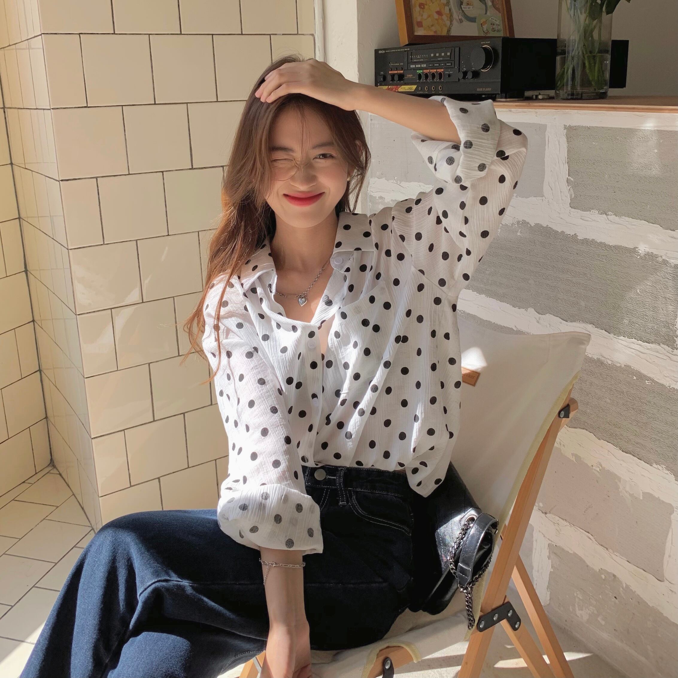 ホワイト水玉シャツ オータム薄手ジャケット サマートップス ロング 夏物 秋物 モンロー17025610687