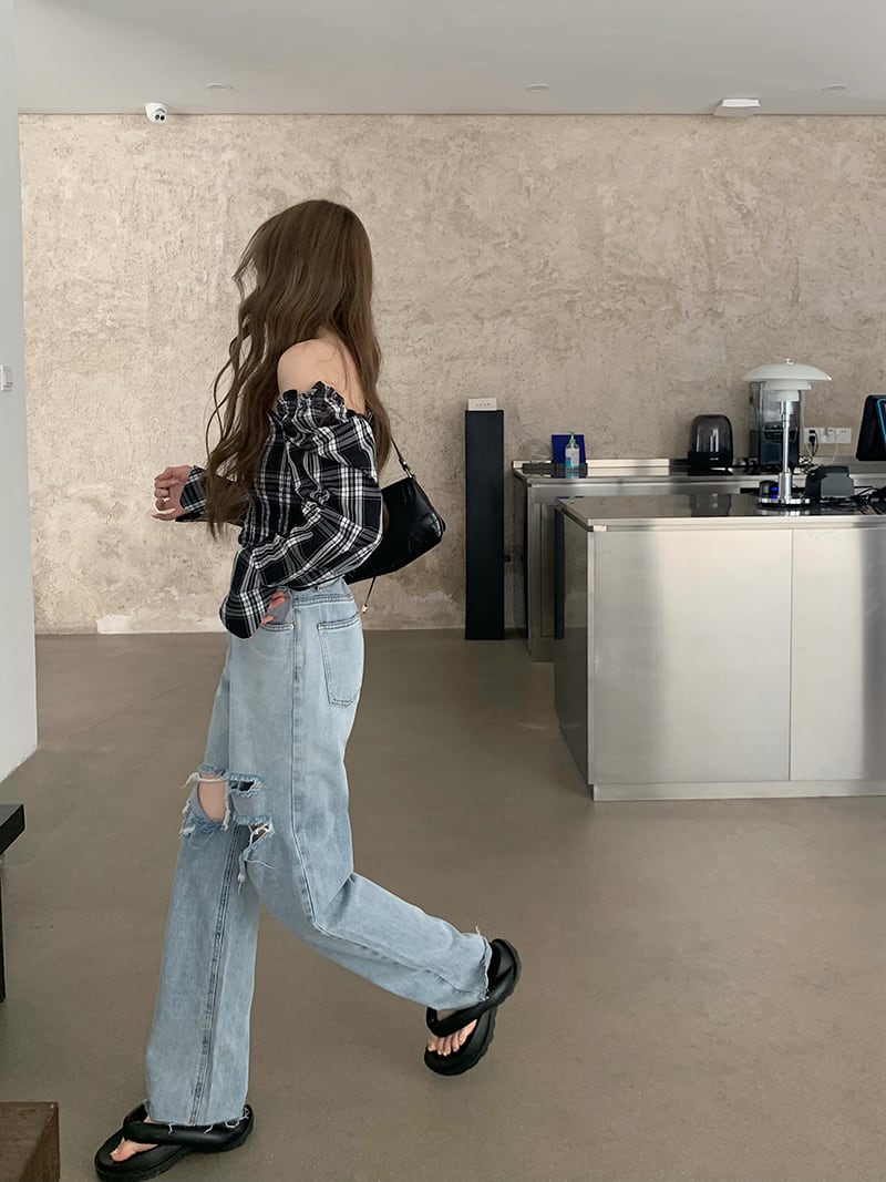 色:ウォッシュドブルージーンズ9551,一言襟チェック柄シャツ11839