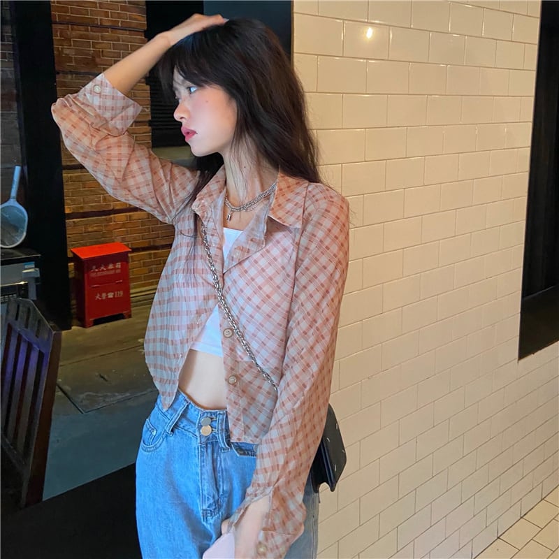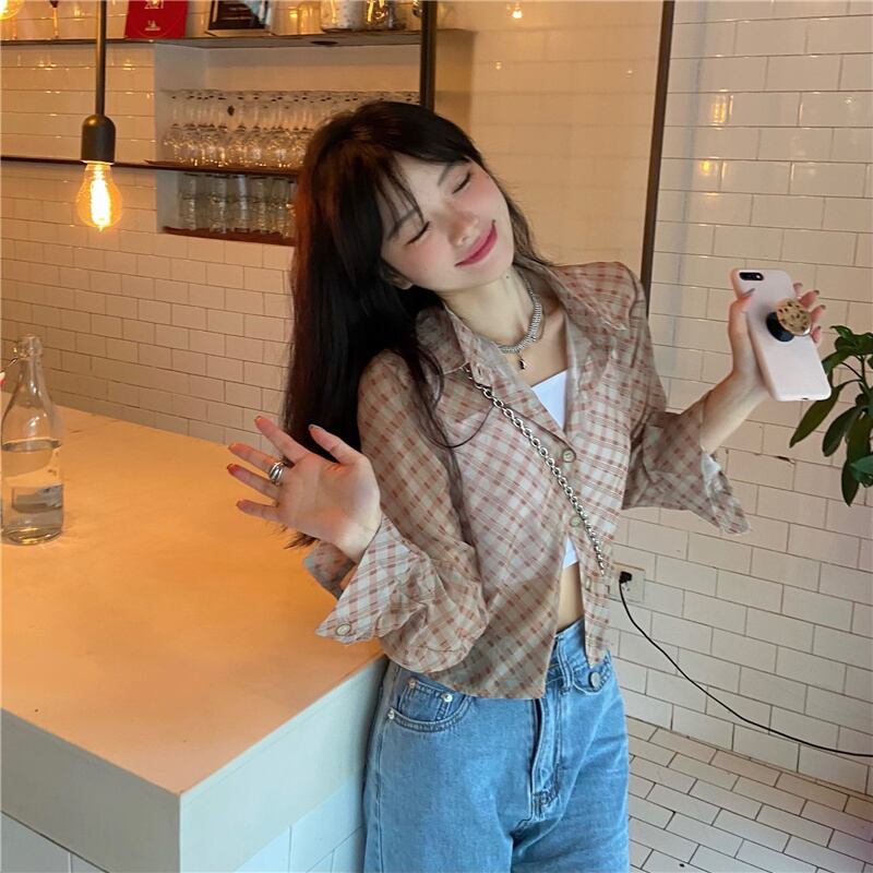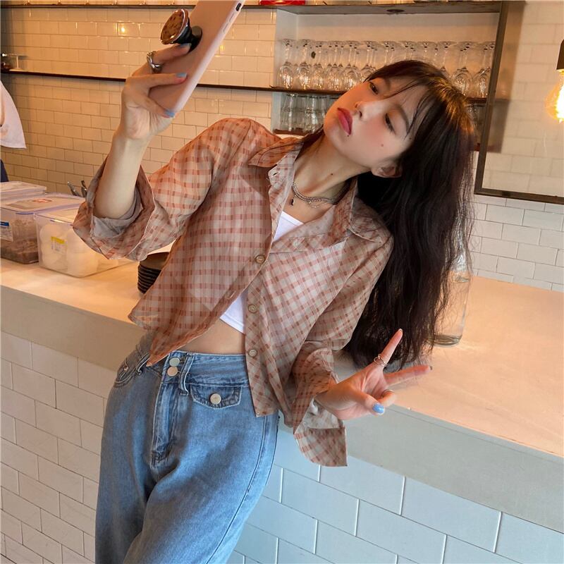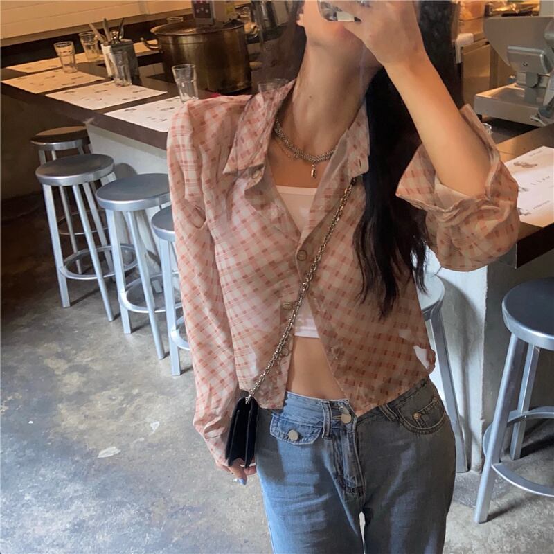 格子柄シャツ サマースタンダードスタイル薄手トップス レトロ 夏物 モンロー58916038475