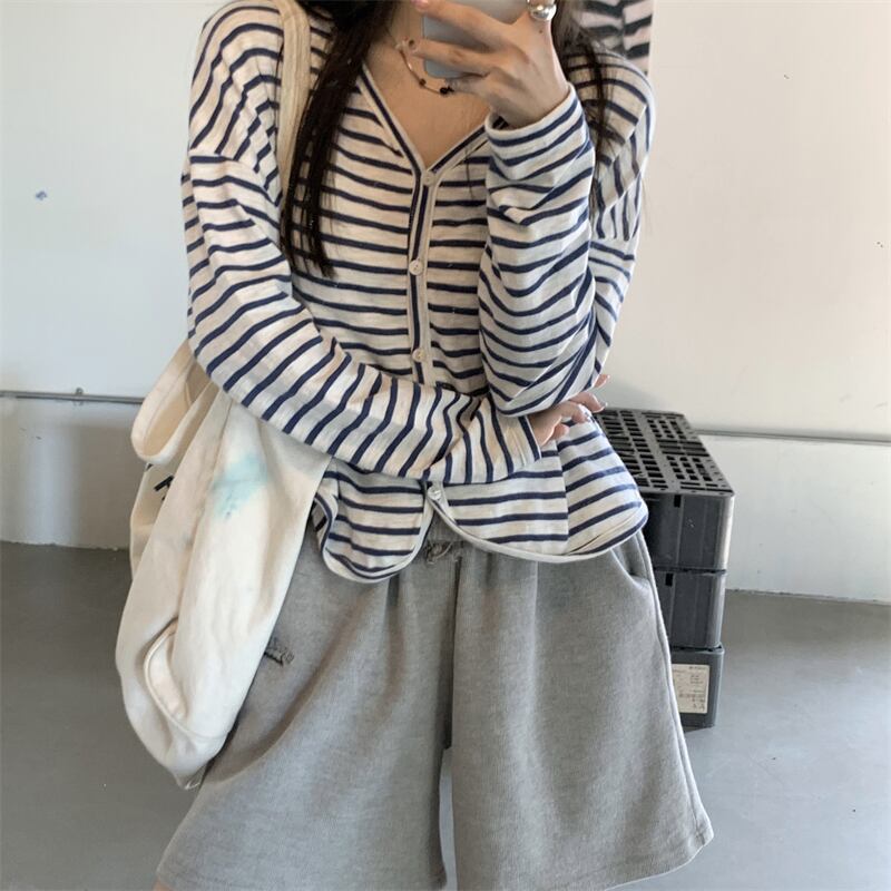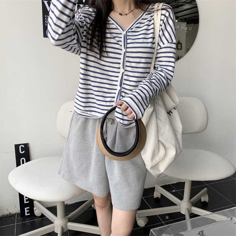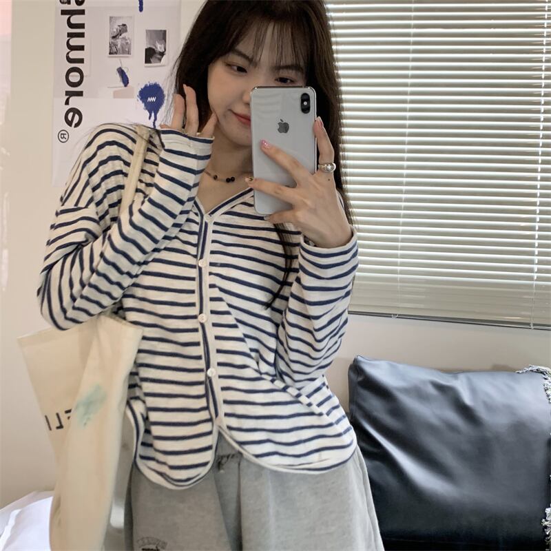 スタイルストライプショートジャケット スプリングオータム薄手サマーVネックトップス ロング 春物 夏物 秋物 モンロー53101450049