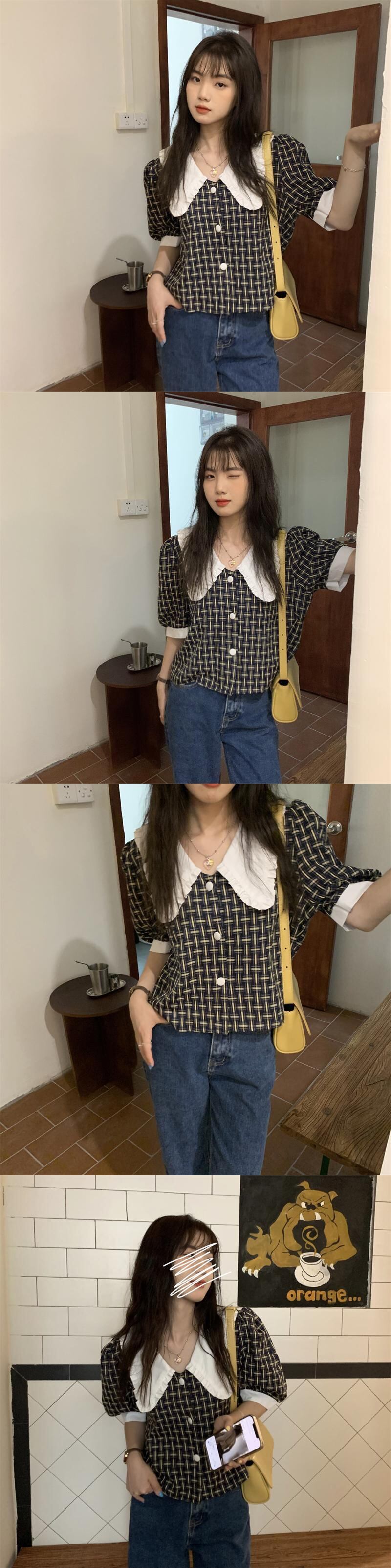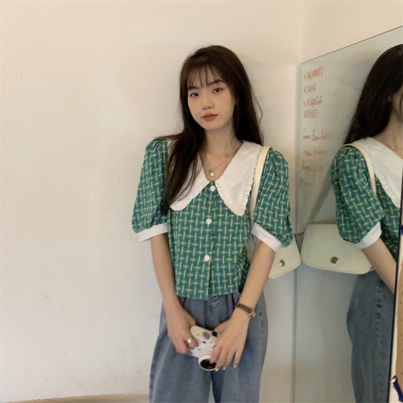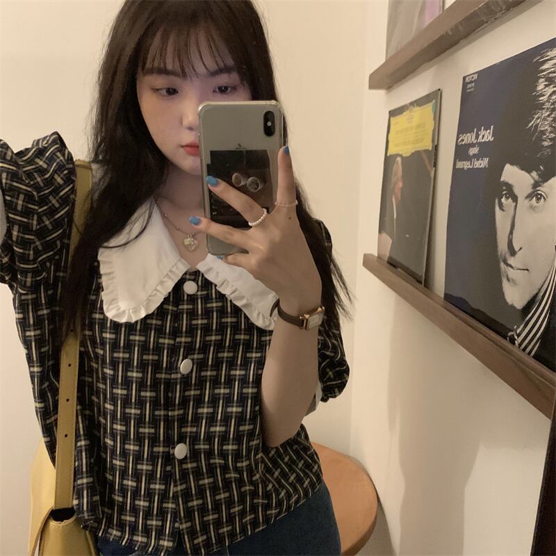 スタンダードショート格子柄シャツ サマーカラー半袖スリーブ レトロ ハーフスリーブ 夏物 モンロー81113245204