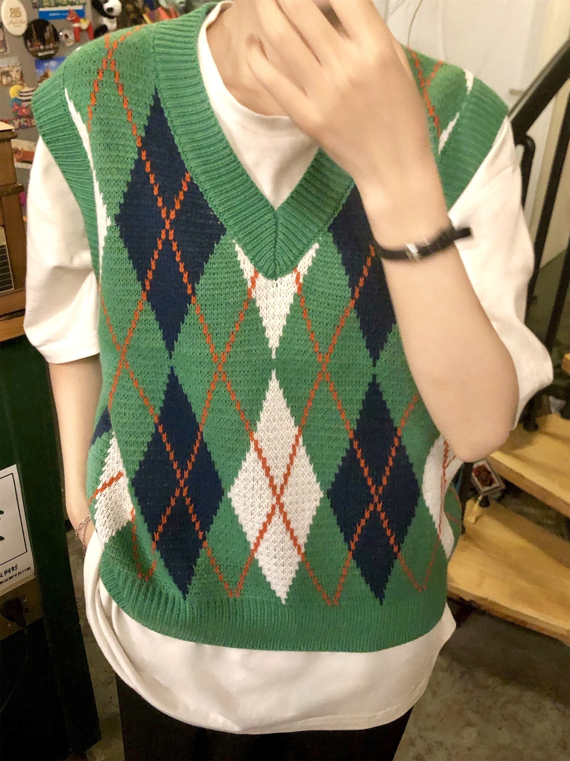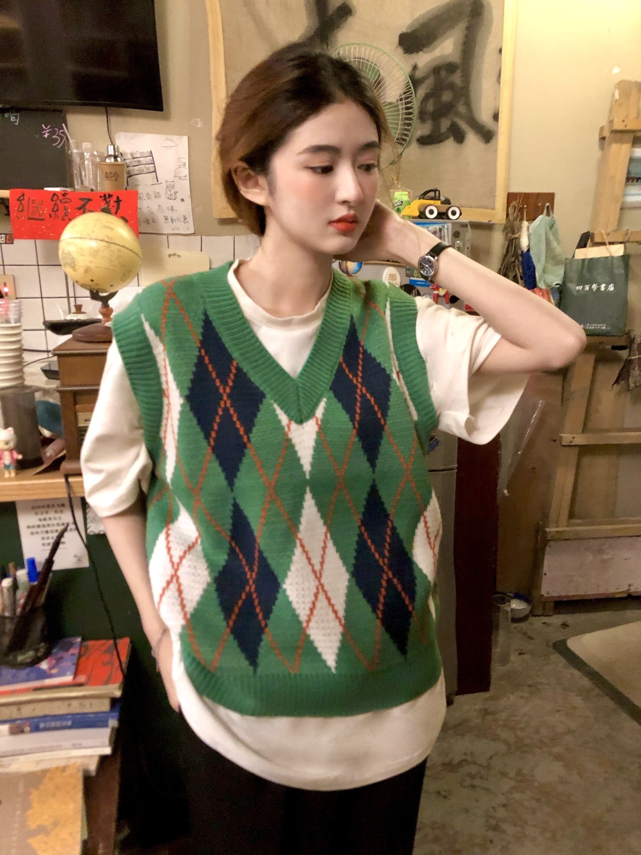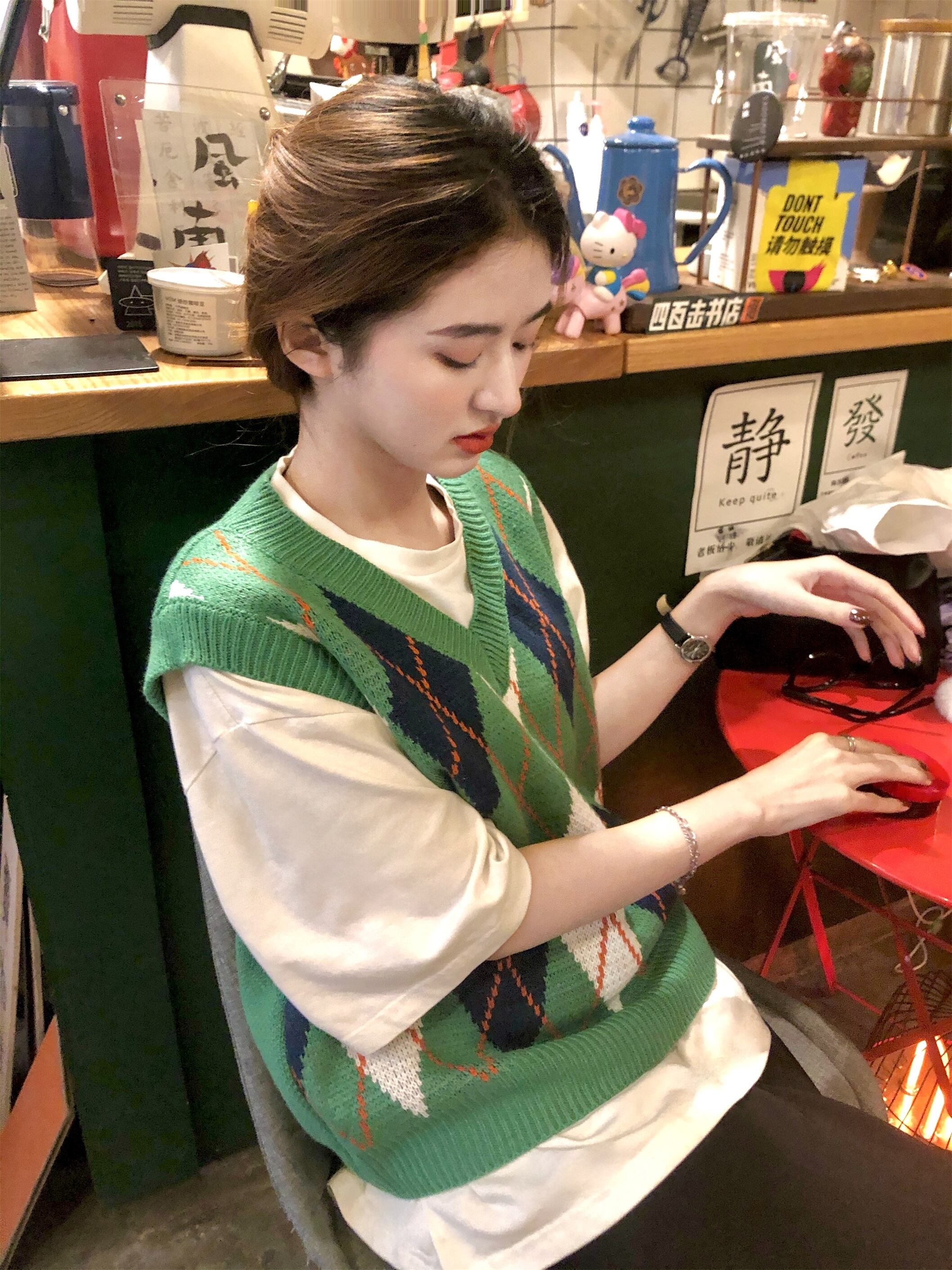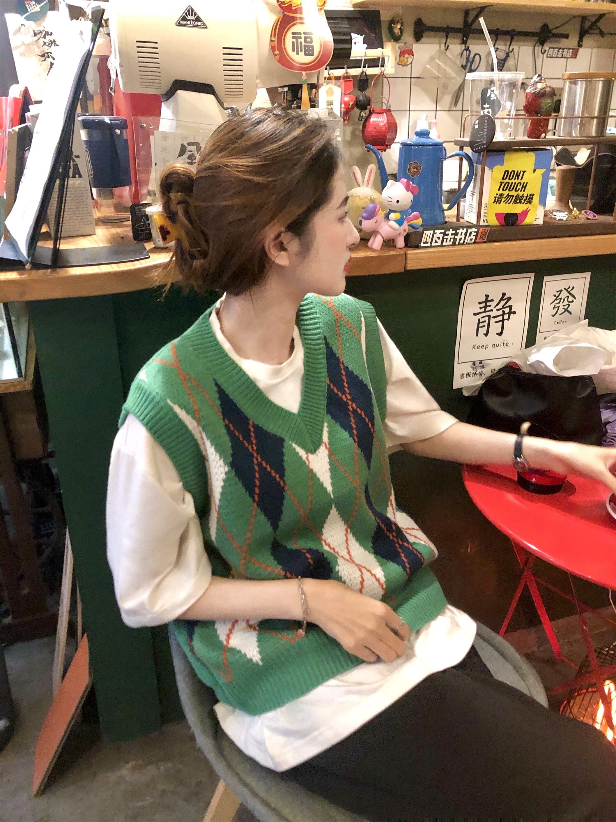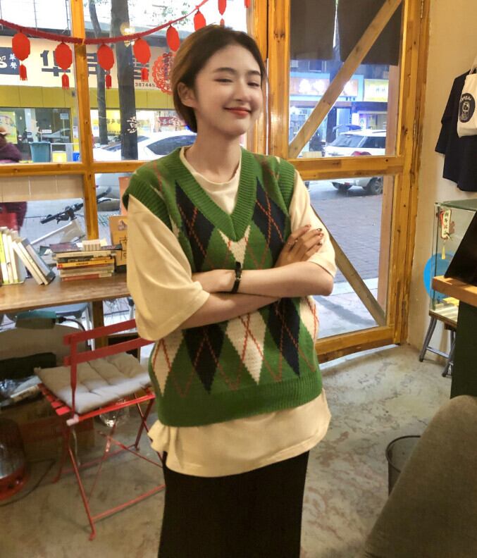 スタンダードグリーンVネックニットオータム薄手スタイルサマーショートノースリーブトップス レトロ 半袖 ハーフスリーブ 夏物 秋物 モンロー92844355759