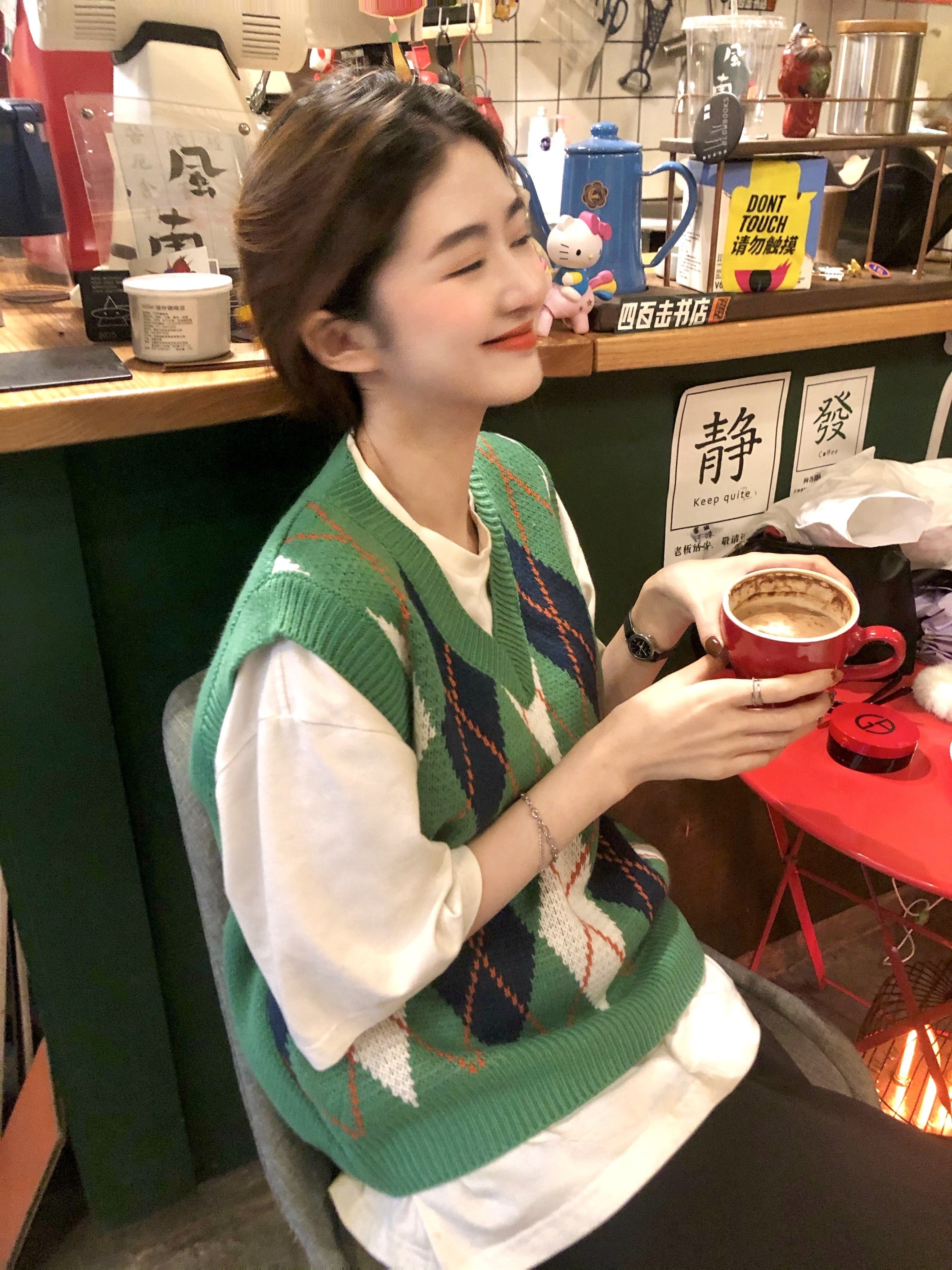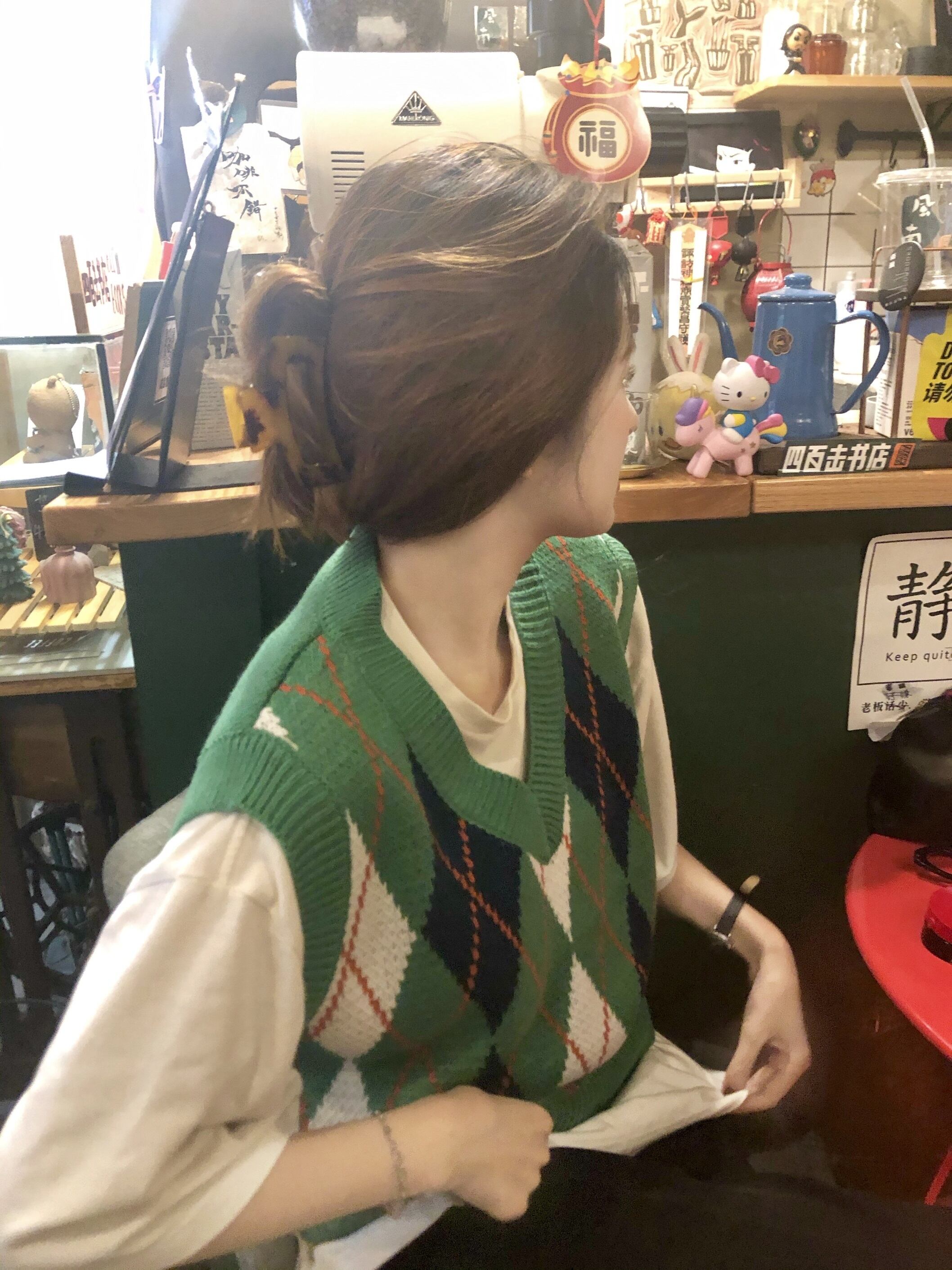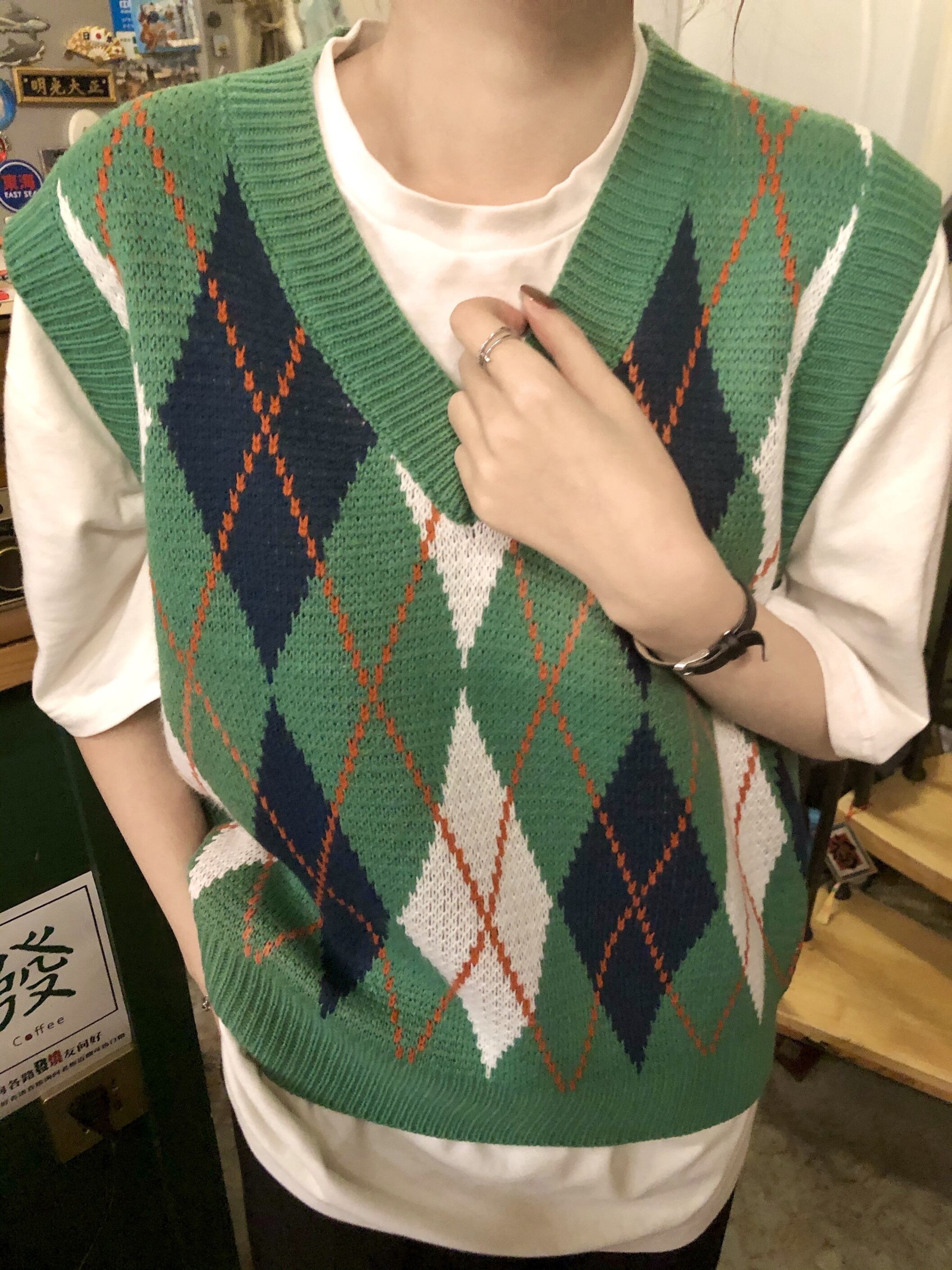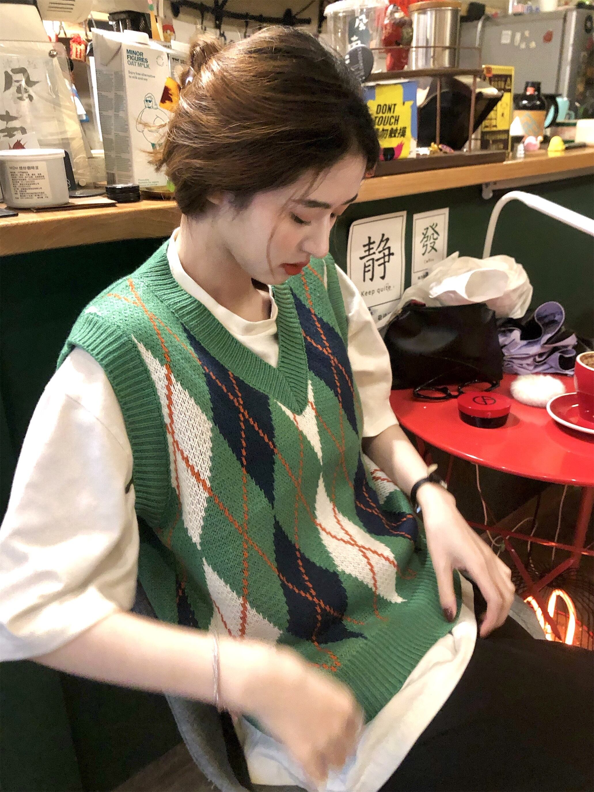 スタンダードグリーンVネックニットオータム薄手スタイルサマーショートノースリーブトップス レトロ 半袖 ハーフスリーブ 夏物 秋物 モンロー92844355759