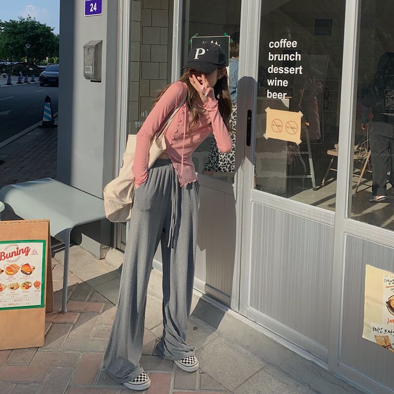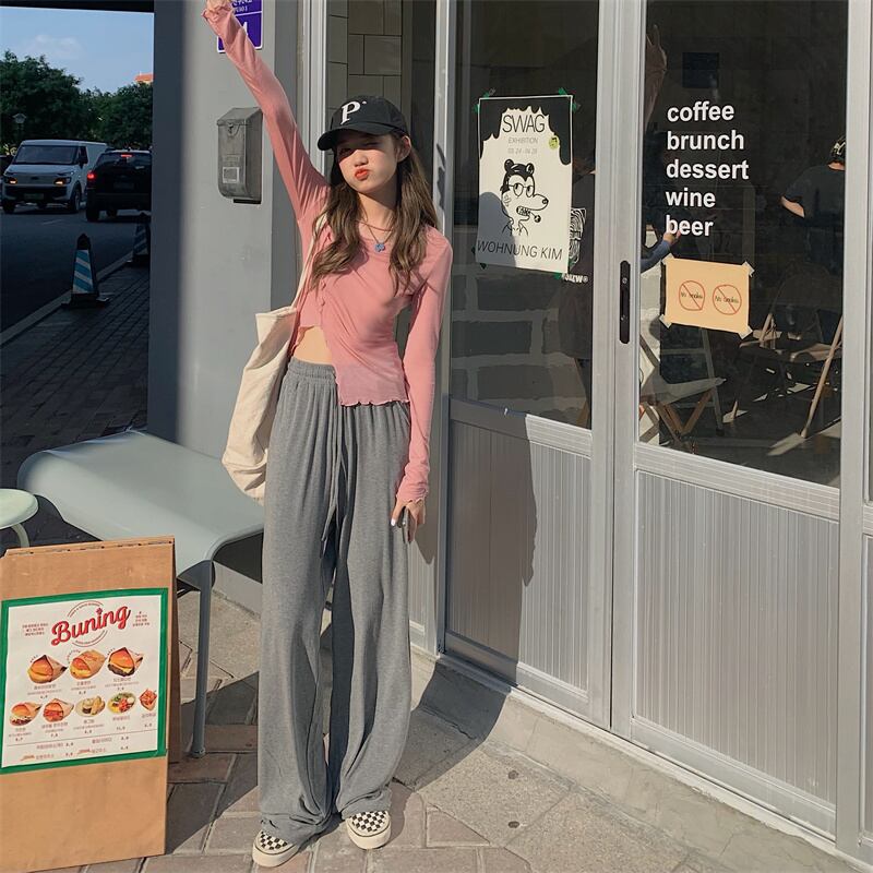 色:ピンクのTシャツ,黒いTシャツ,白いTシャツ,グレーのワイドレッグパンツ,黒のワイドレッグパンツ