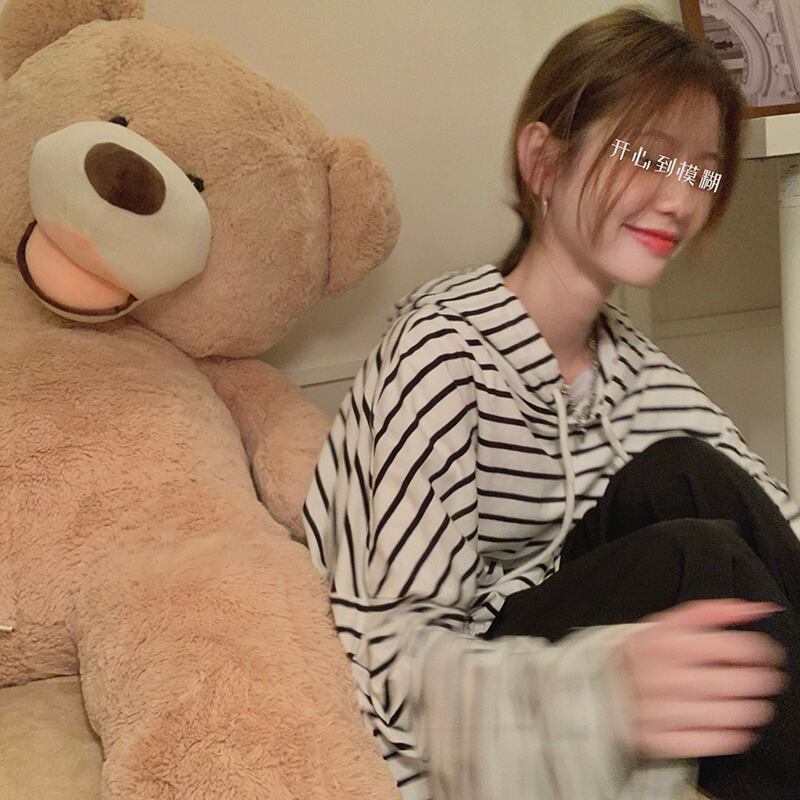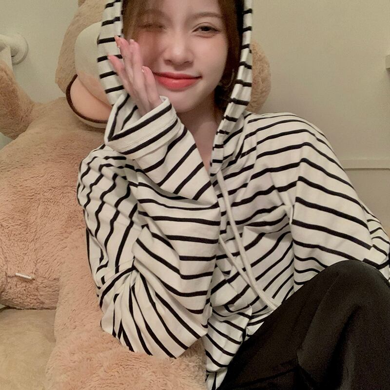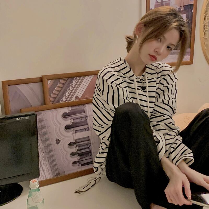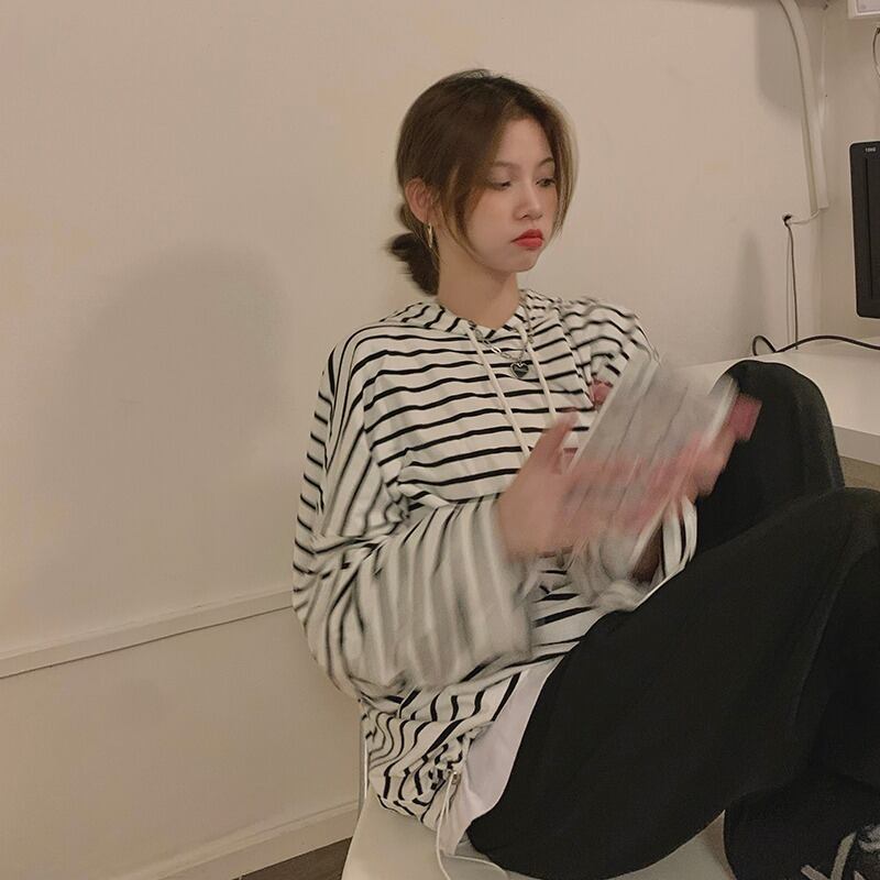 スタイルルーズ薄手ストライプフードセーター ジャケット スプリングオータムトップス ロング 春物 秋物 モンロー27544856531