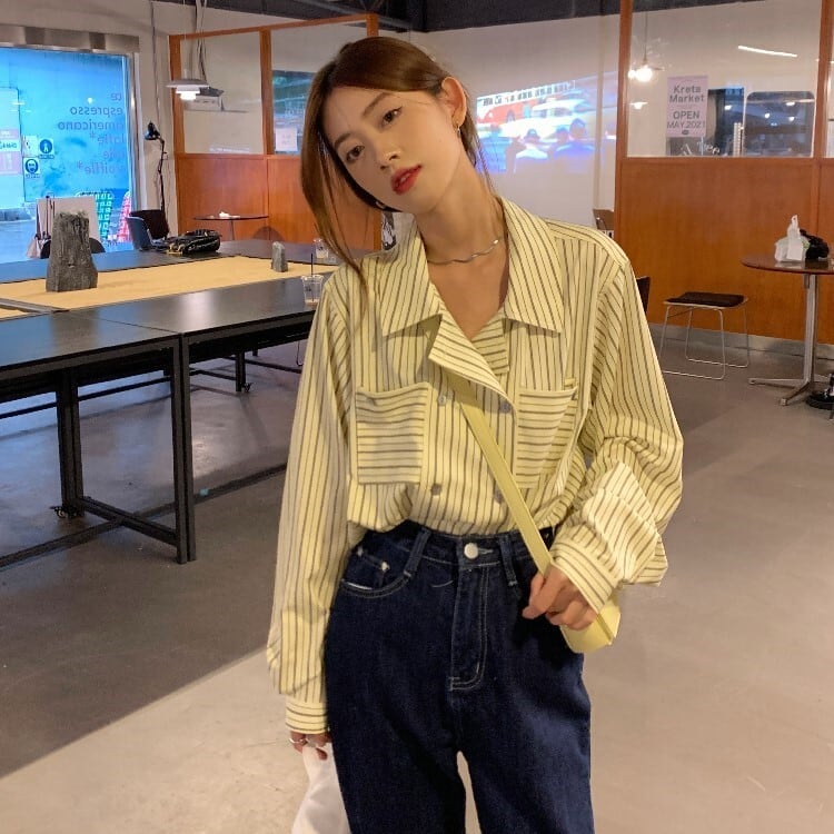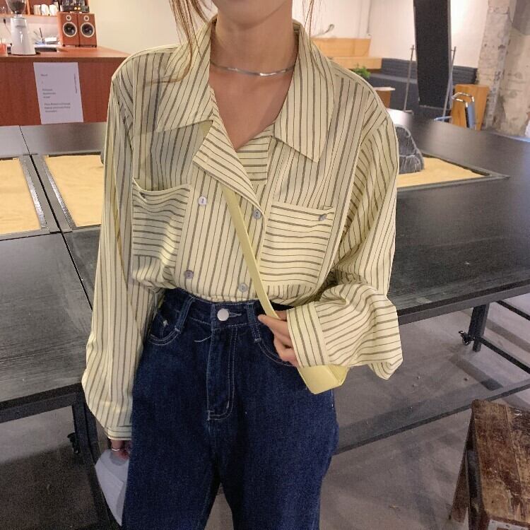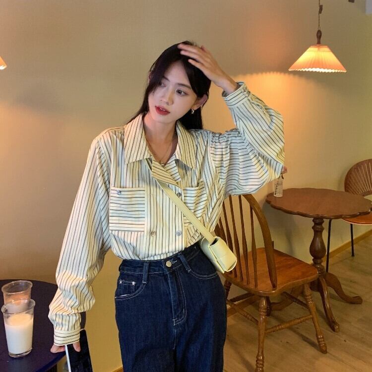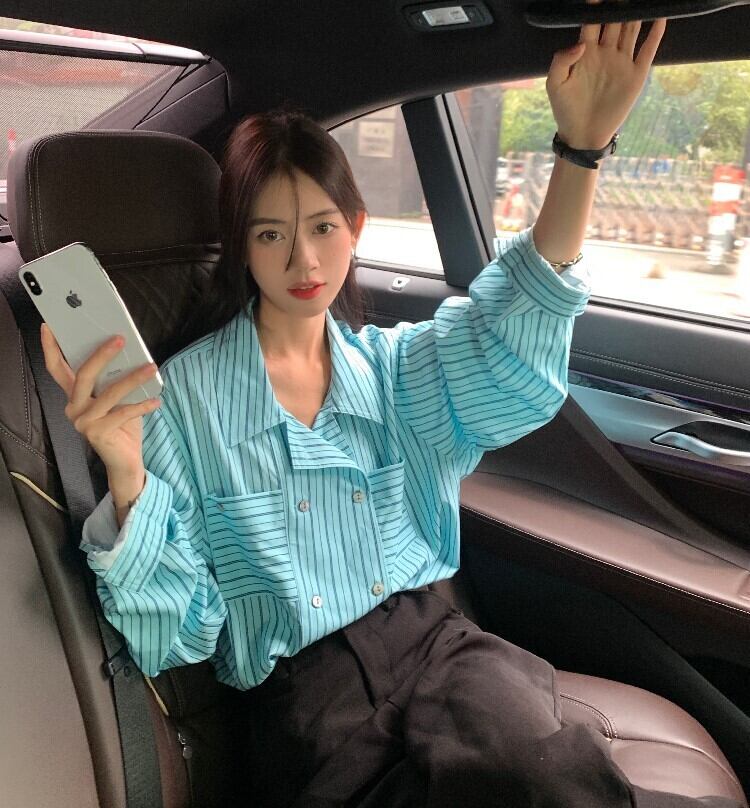 ブルーストライプシャツ オータム薄手ジャケット トップス ロング 秋物 モンロー25733856003