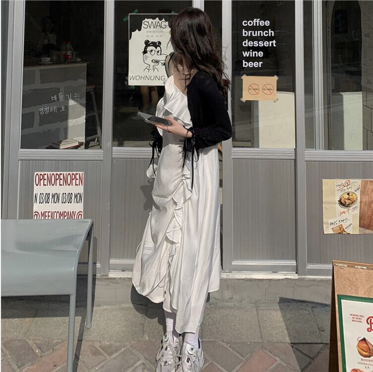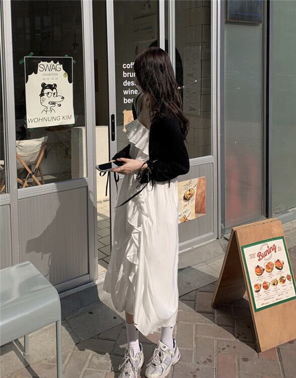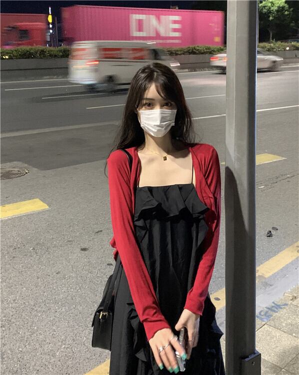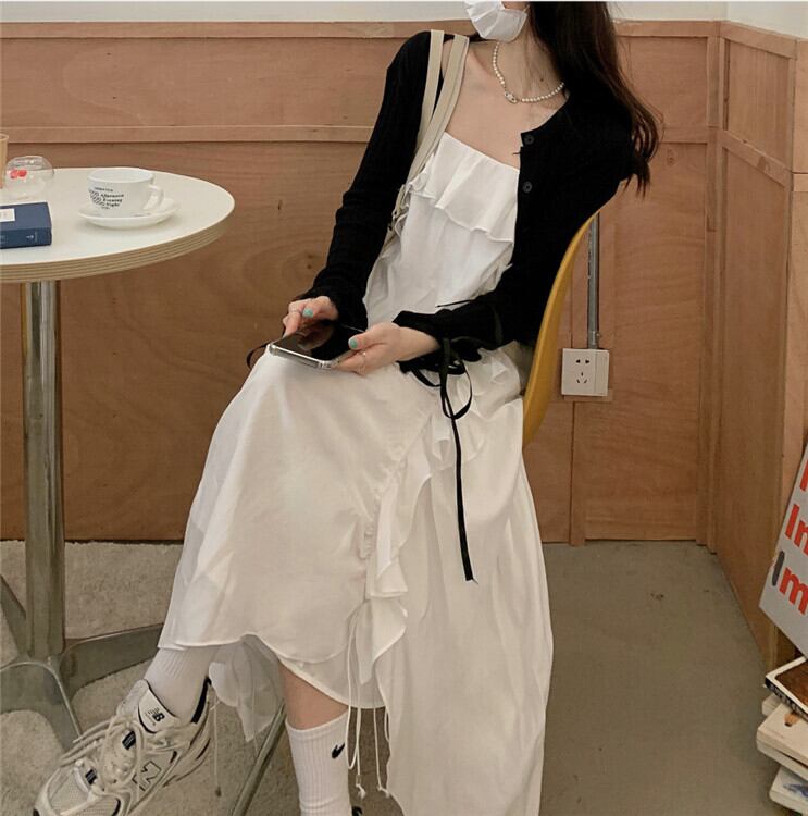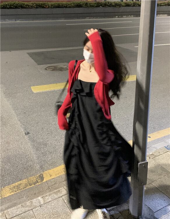 色:白いドレス,ブラックサスペンダースカート,ブラックニットカーディガン,レトロな赤いカーディガン