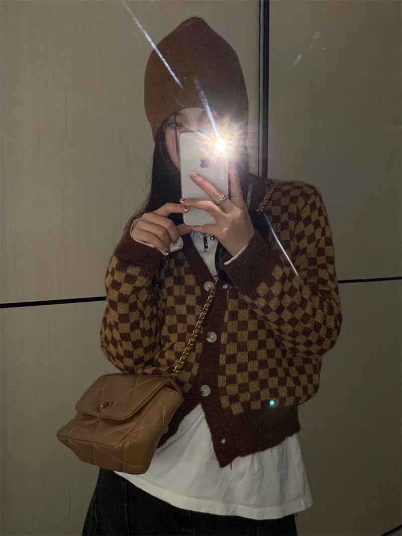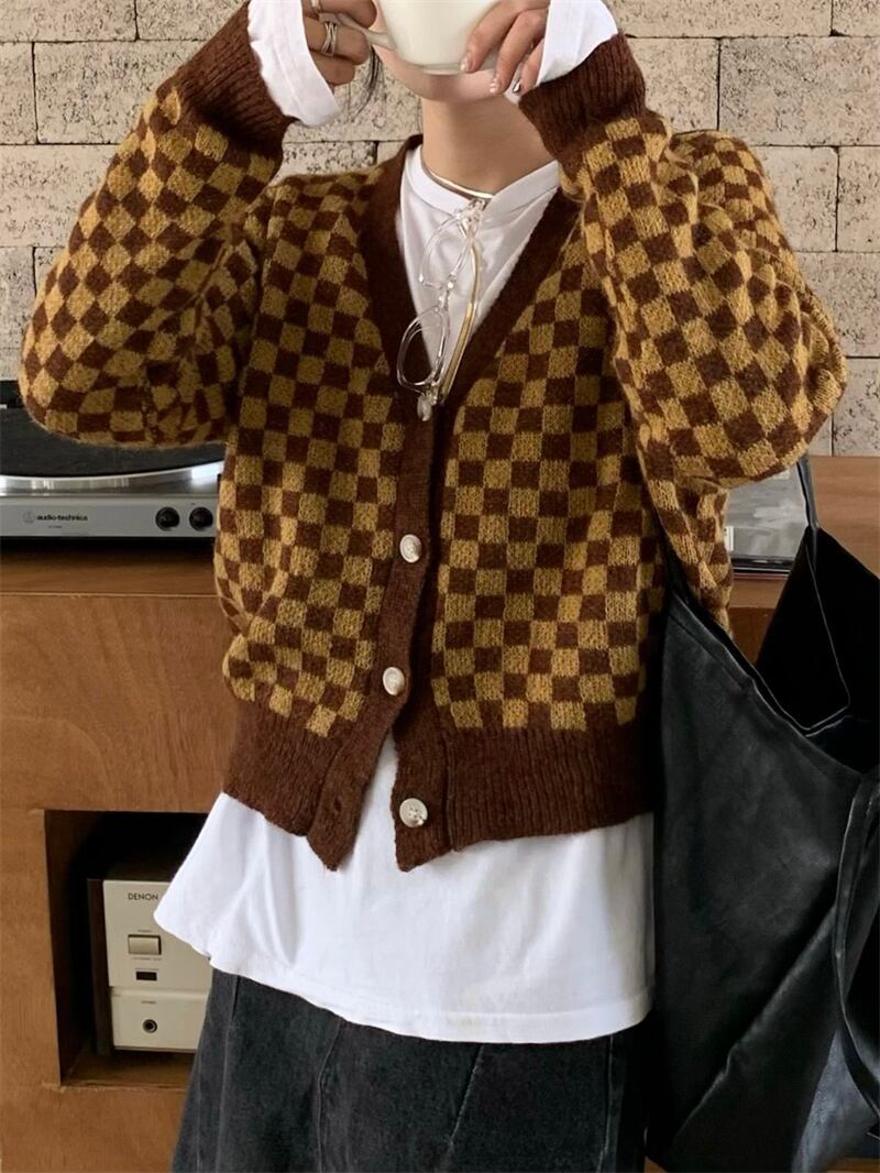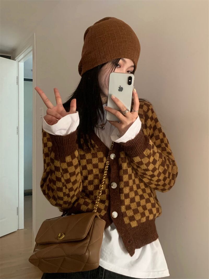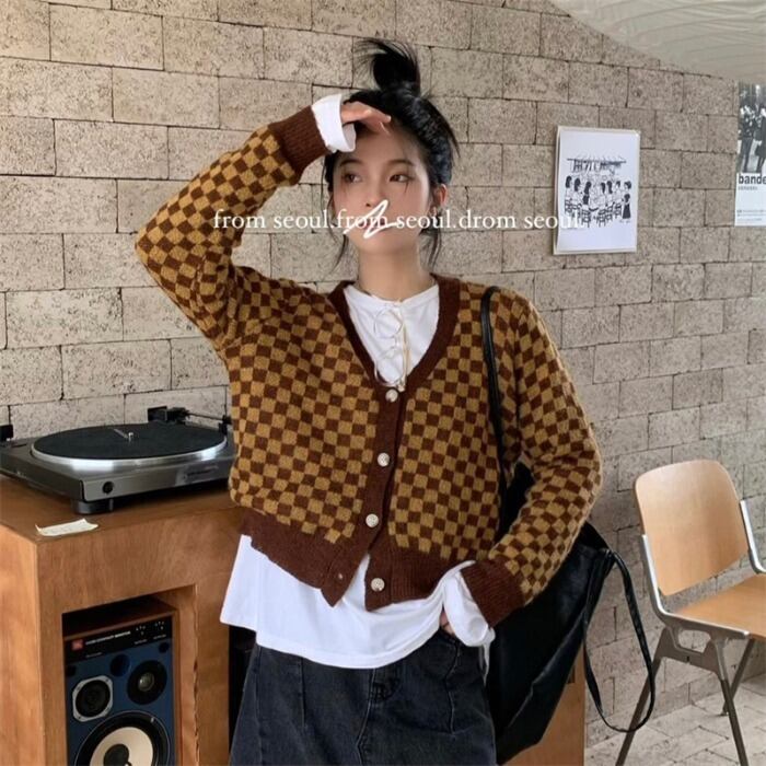 スタンダードVネックニットカーディガンオータム薄手セーター コート クロップドトップス ロング レトロ 秋物 モンロー75423708904