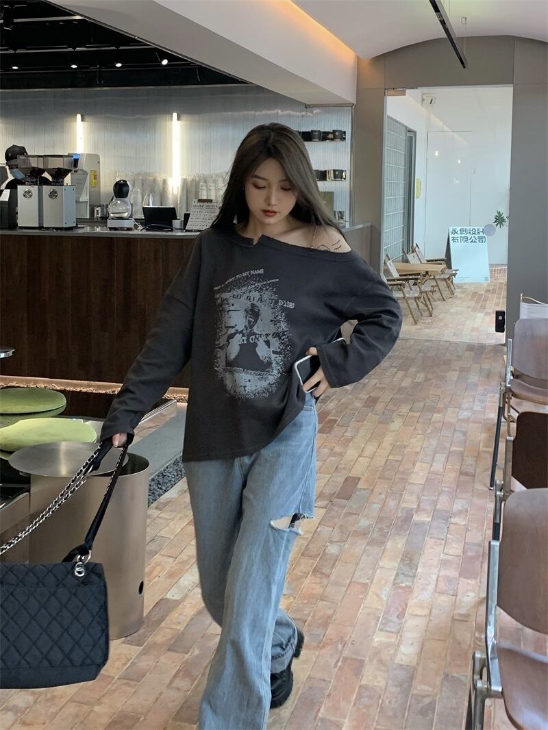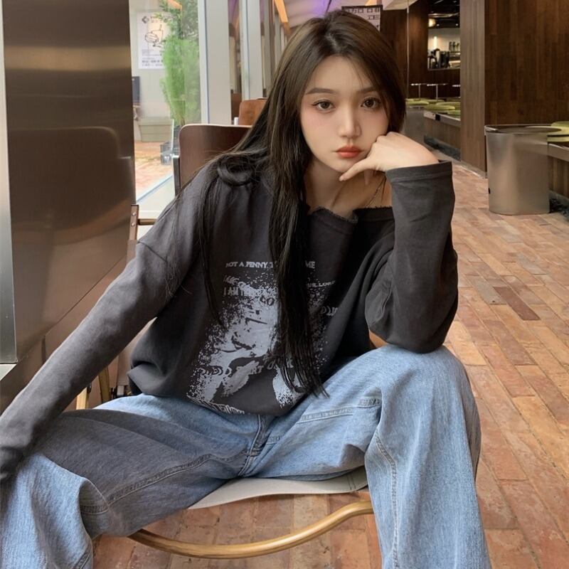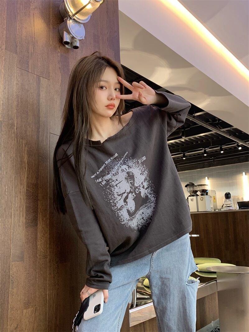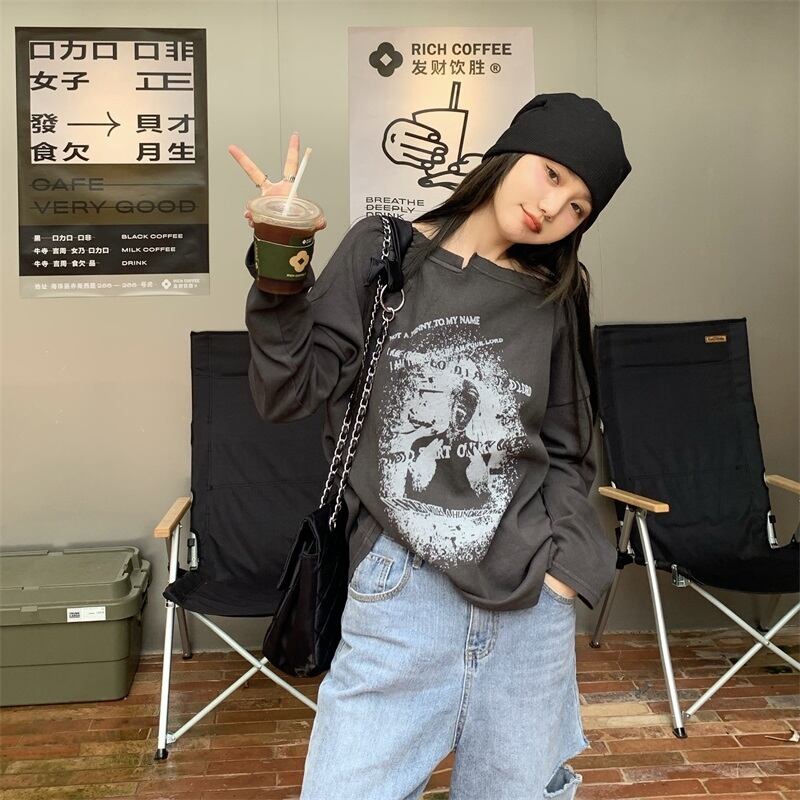 スタンダードグレープリント柄ルーズTシャツ シャツ オータム薄手トップス ロング レトロ 秋物 モンロー83386509270