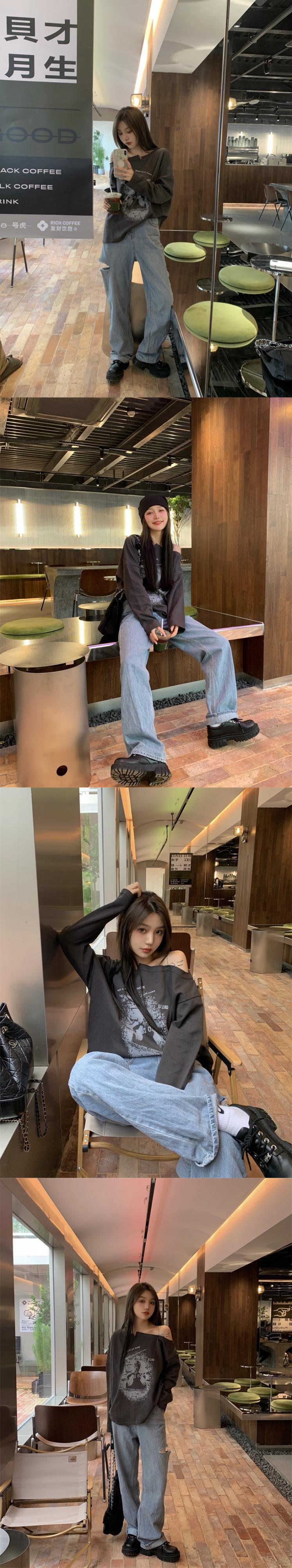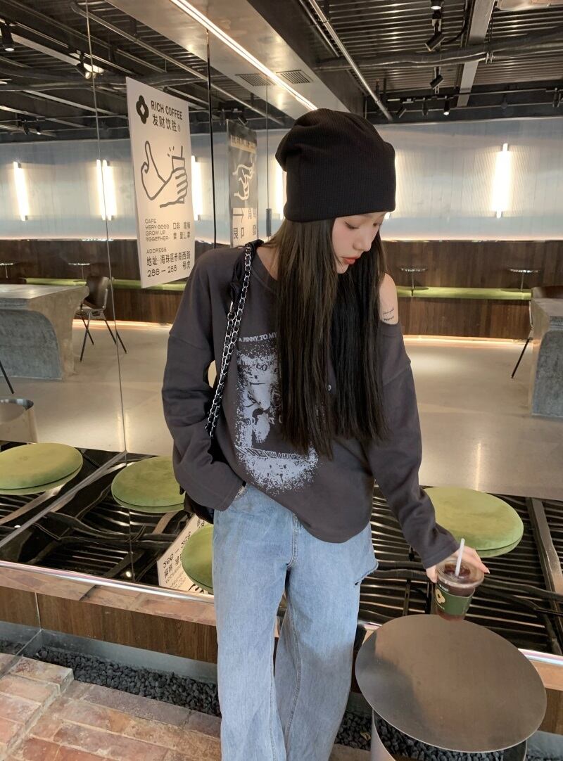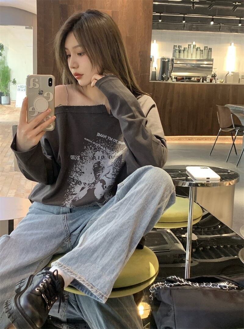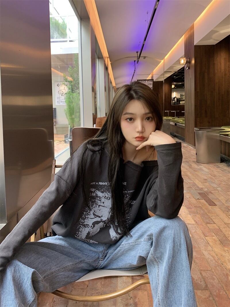 スタンダードグレープリント柄ルーズTシャツ シャツ オータム薄手トップス ロング レトロ 秋物 モンロー83386509270