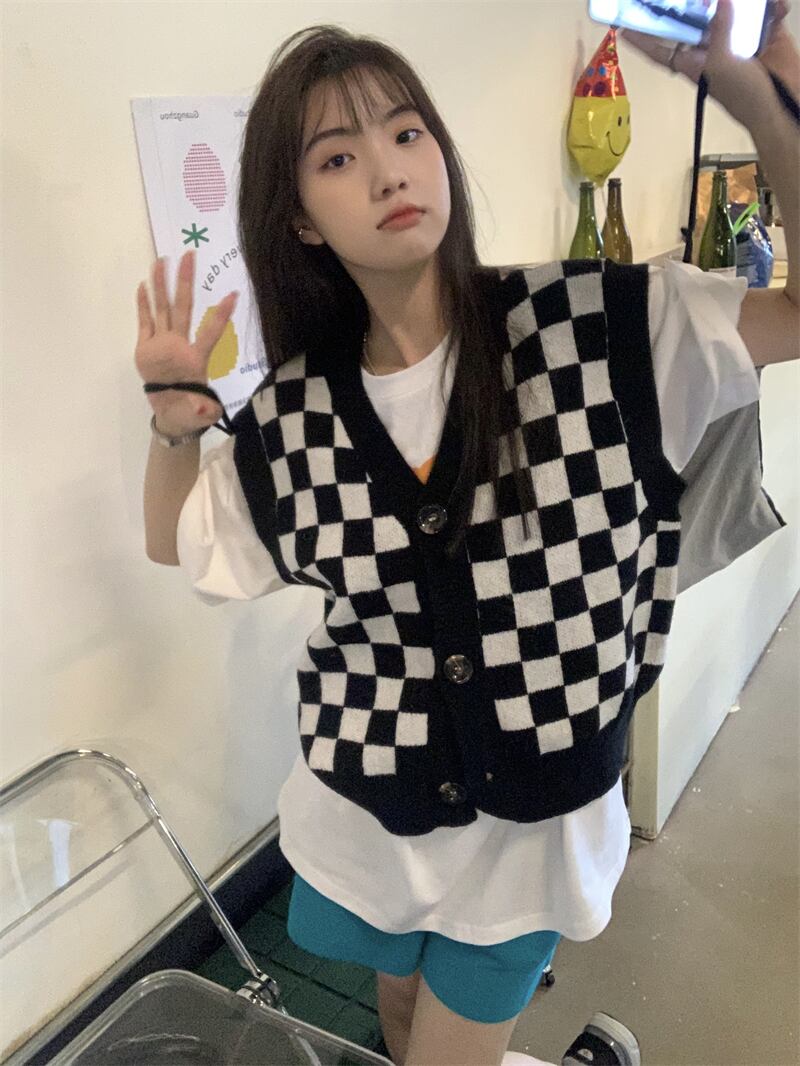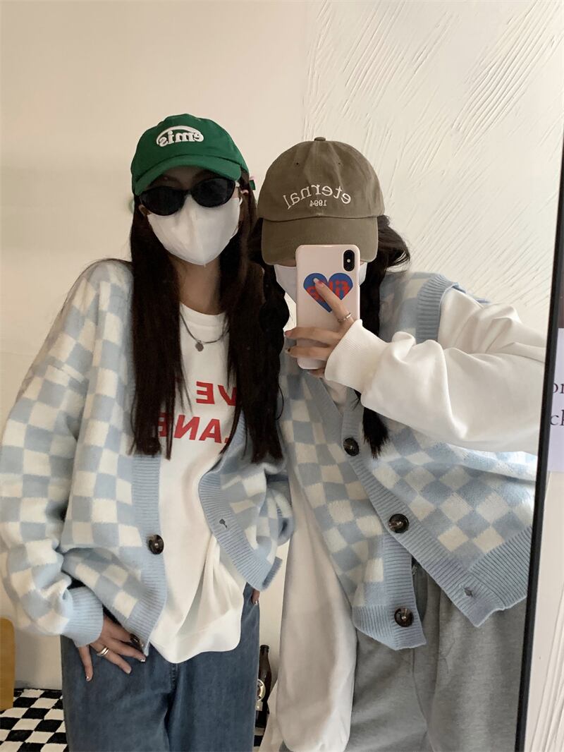 スタイルVネック格子柄ニットカーディガンオータム薄手セーター コート ルーズトップス ロング 秋物 モンロー90066489442