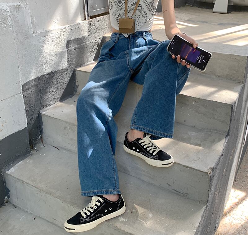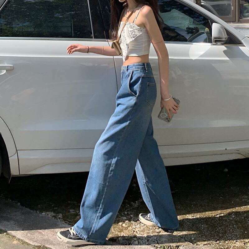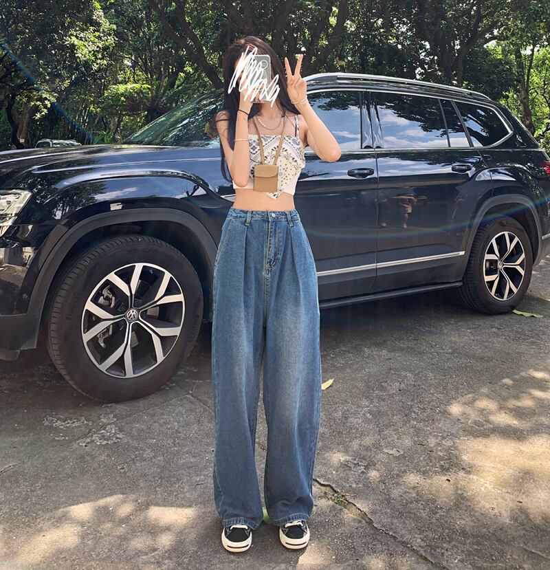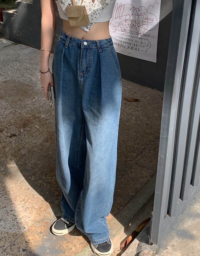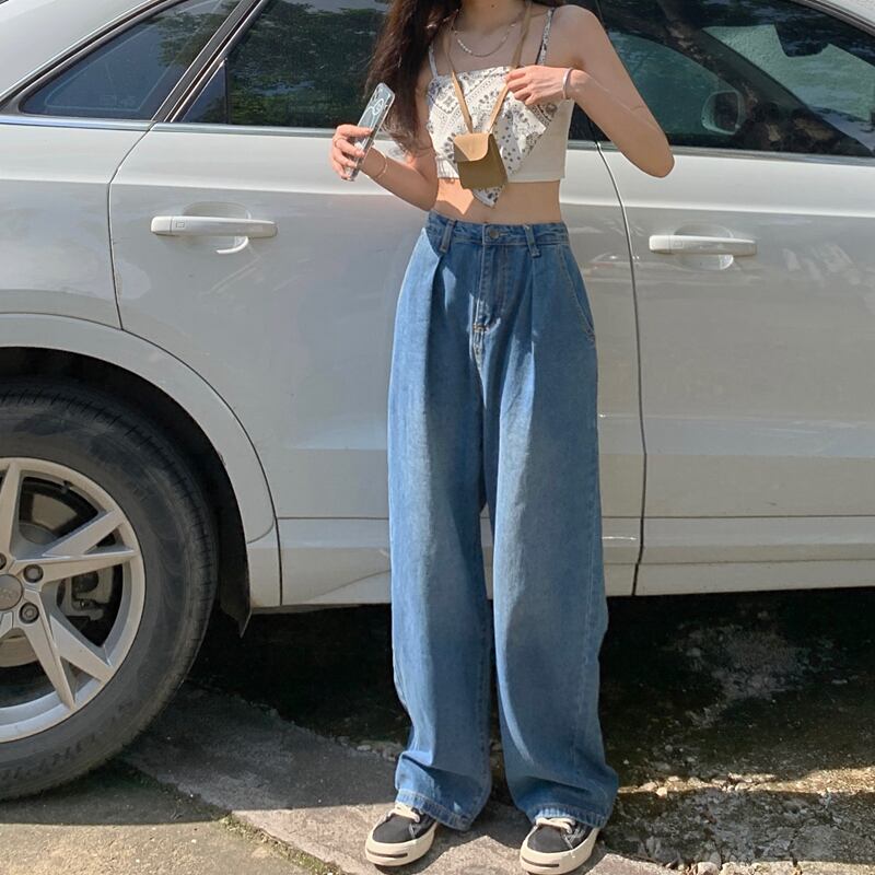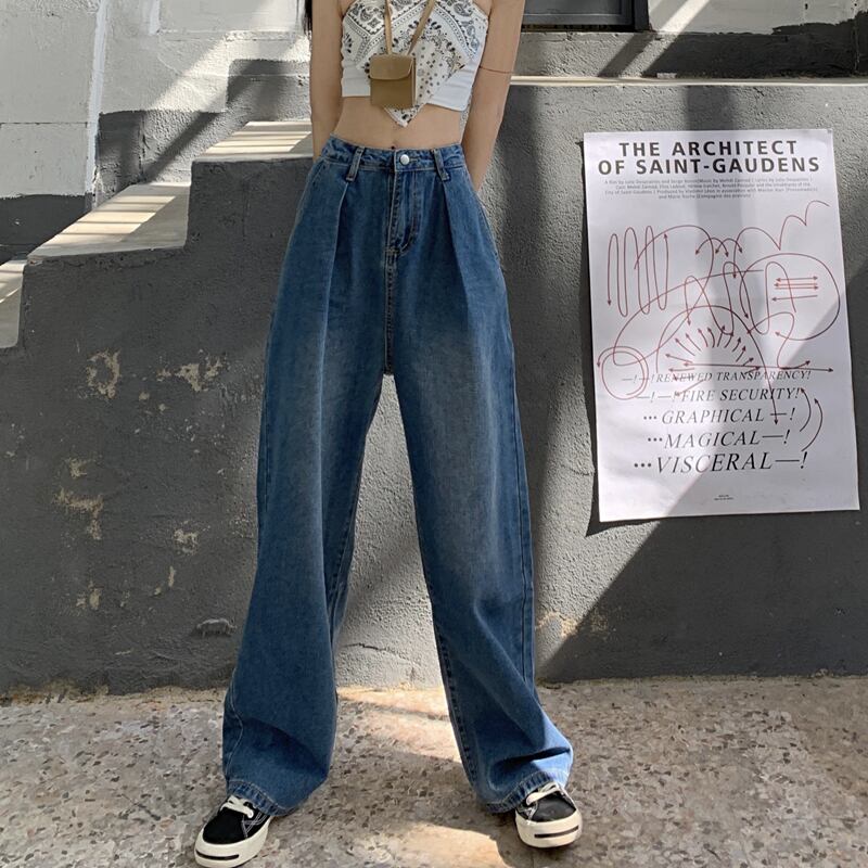 スタンダードハイウェストウェストブルーパンツ スプリングオータム薄手ルーズ レトロ 春物 秋物 モンロー50168973525