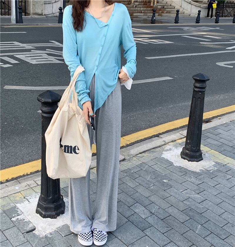 色:白いTシャツ,青いTシャツ,グレーのTシャツ,黒いTシャツ,グレーのワイドレッグパンツ