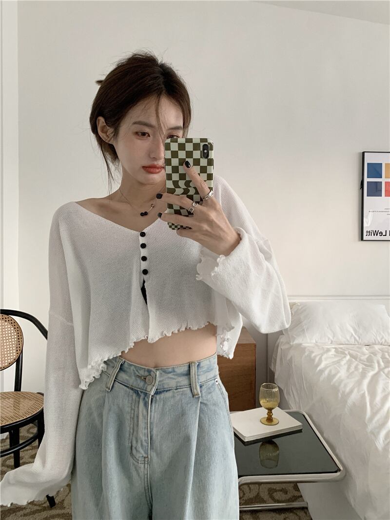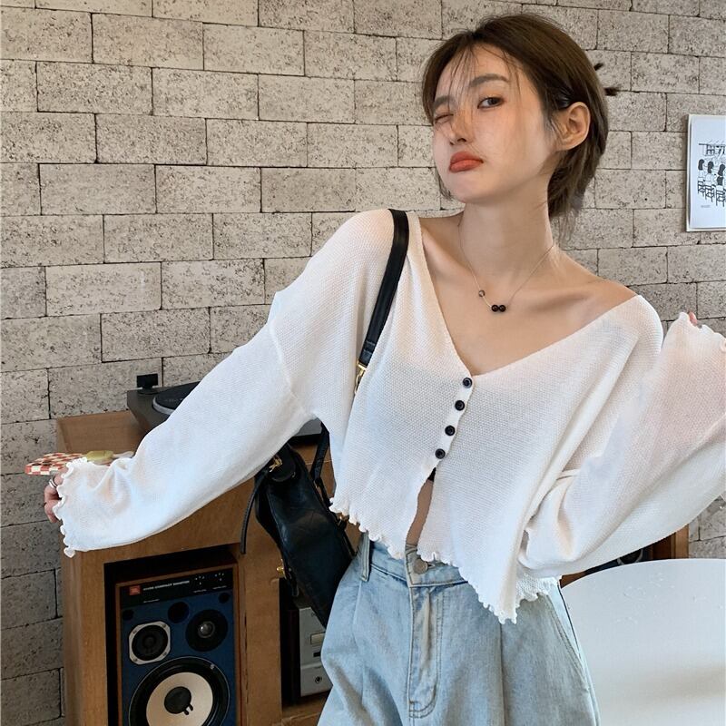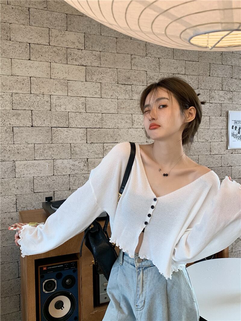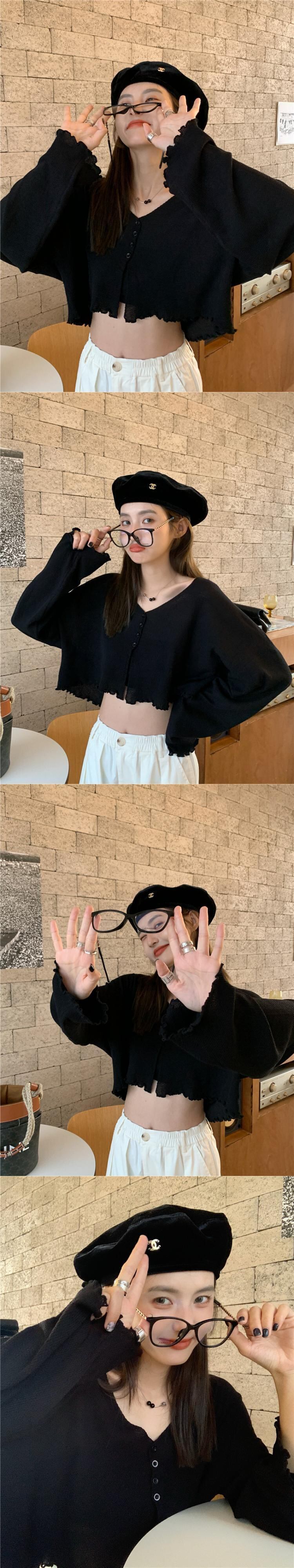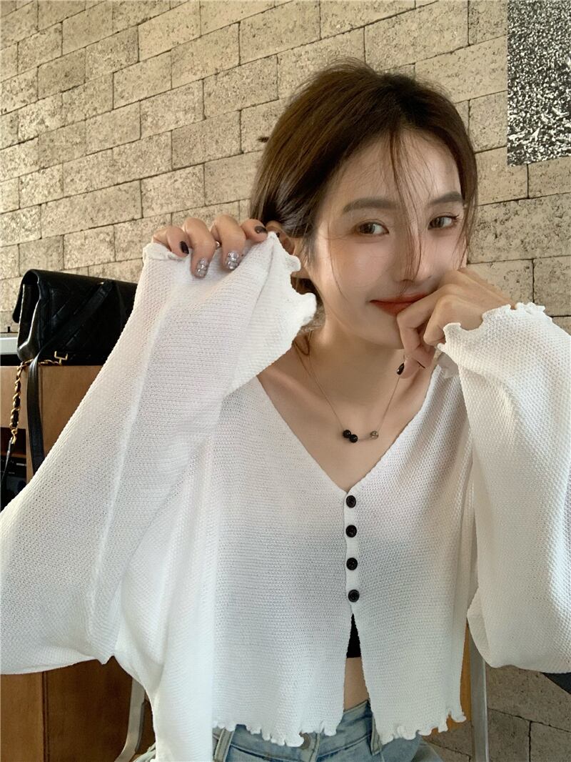スタイルブラックVネックニットカーディガンオータム薄手セーター コート ショートクロップトップ トップス ロング 秋物 モンロー12639299908