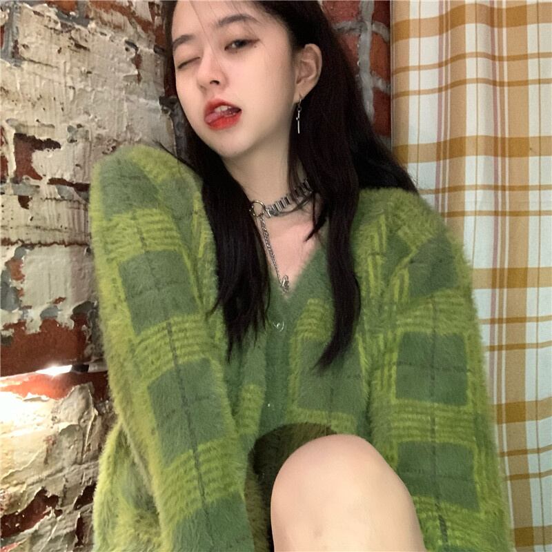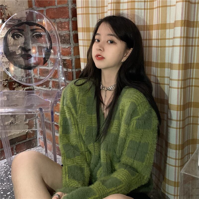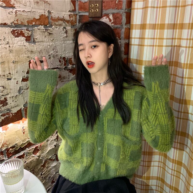 グリーンニットカーディガンオータム薄手Vネックルーズスタンダードセーター コート クロップドトップス ロング レトロ 秋物 モンロー16297607633