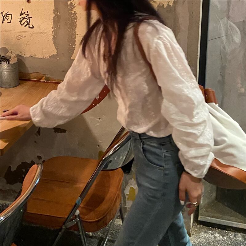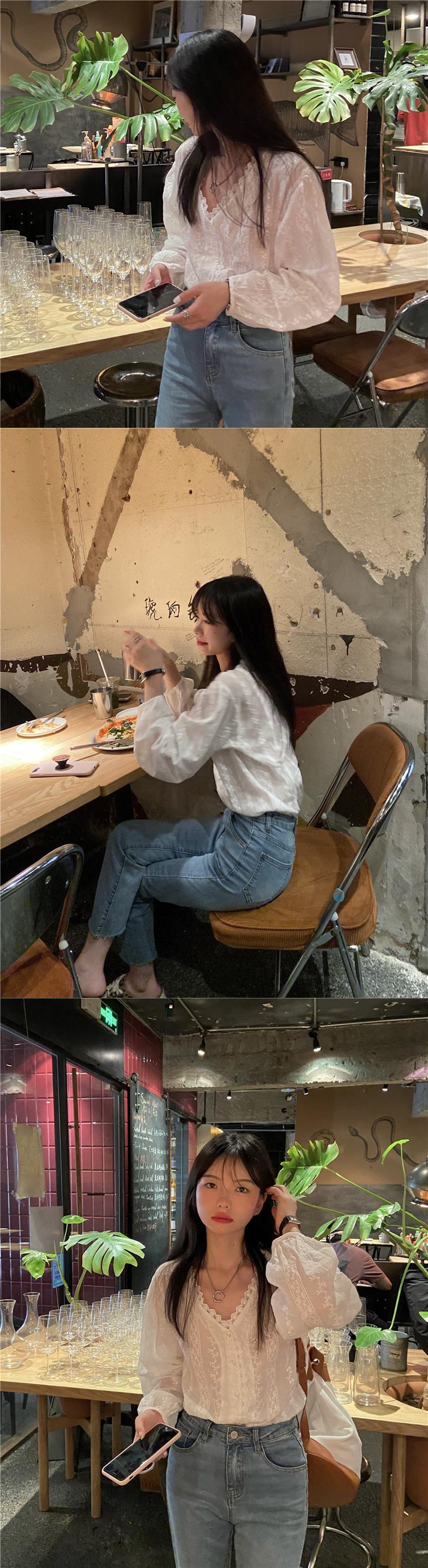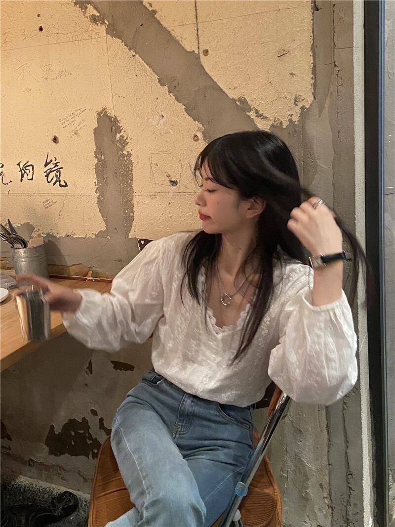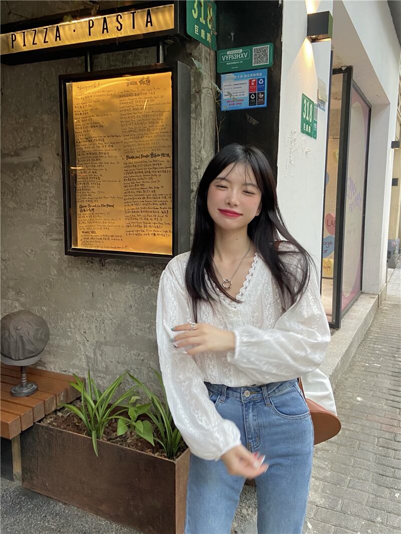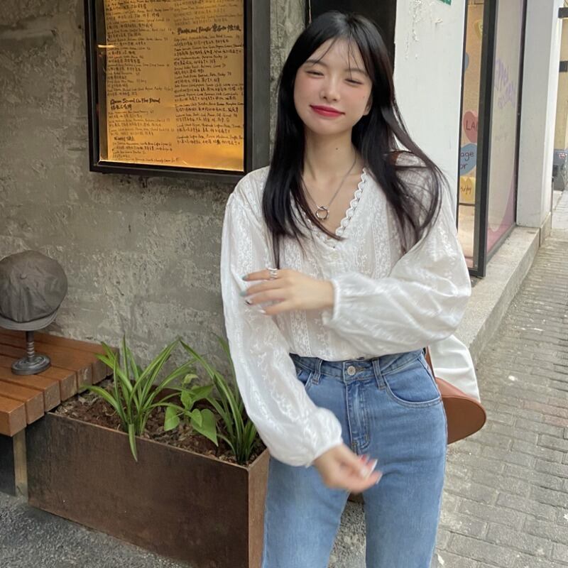 レースサイドホワイトシャツ オータム薄手サマーVネックトップス ロング 大人ガーリー スウィート キュート カジュアル 夏物 秋物 モンロー51760424617