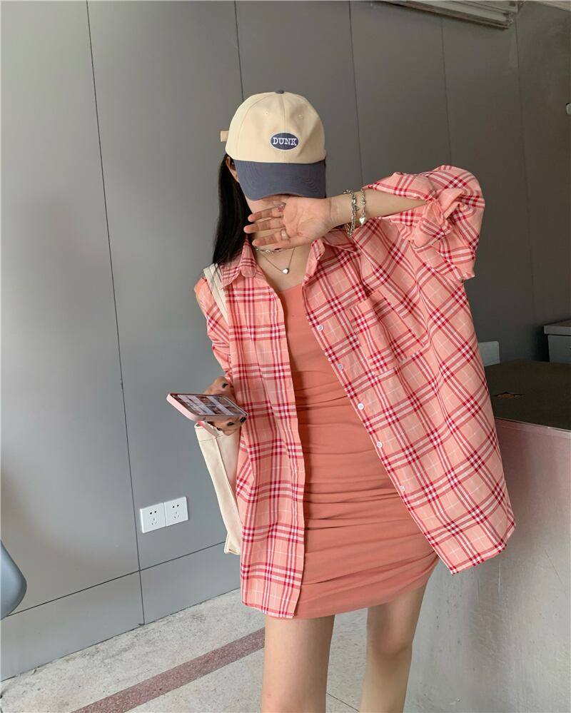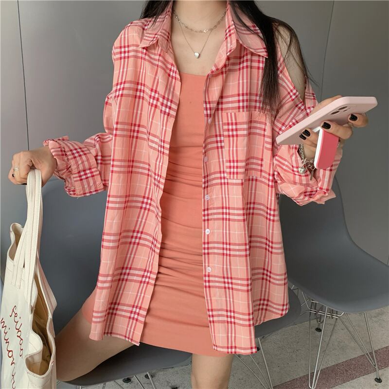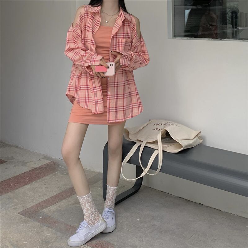 格子柄シャツ オータム薄手ジャケット サマー ロング ピンク 大人ガーリー スウィート キュート カジュアル 夏物 秋物 オフショルダー モンロー98655980704