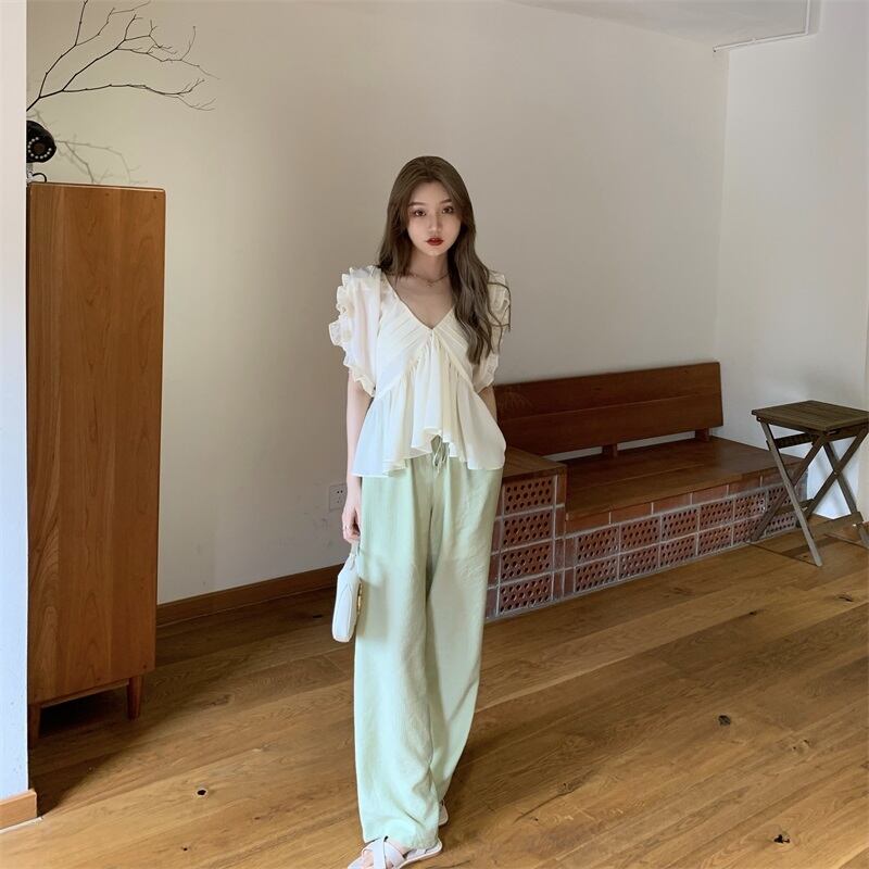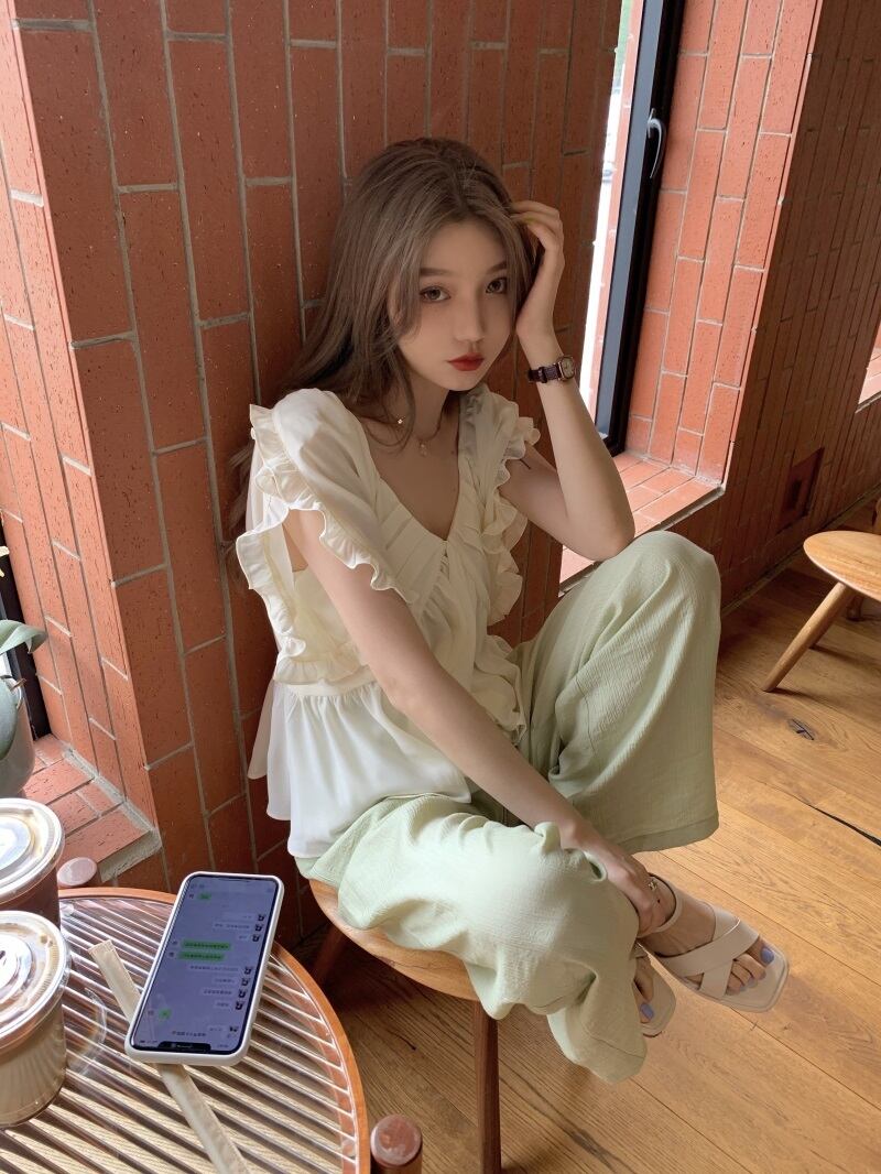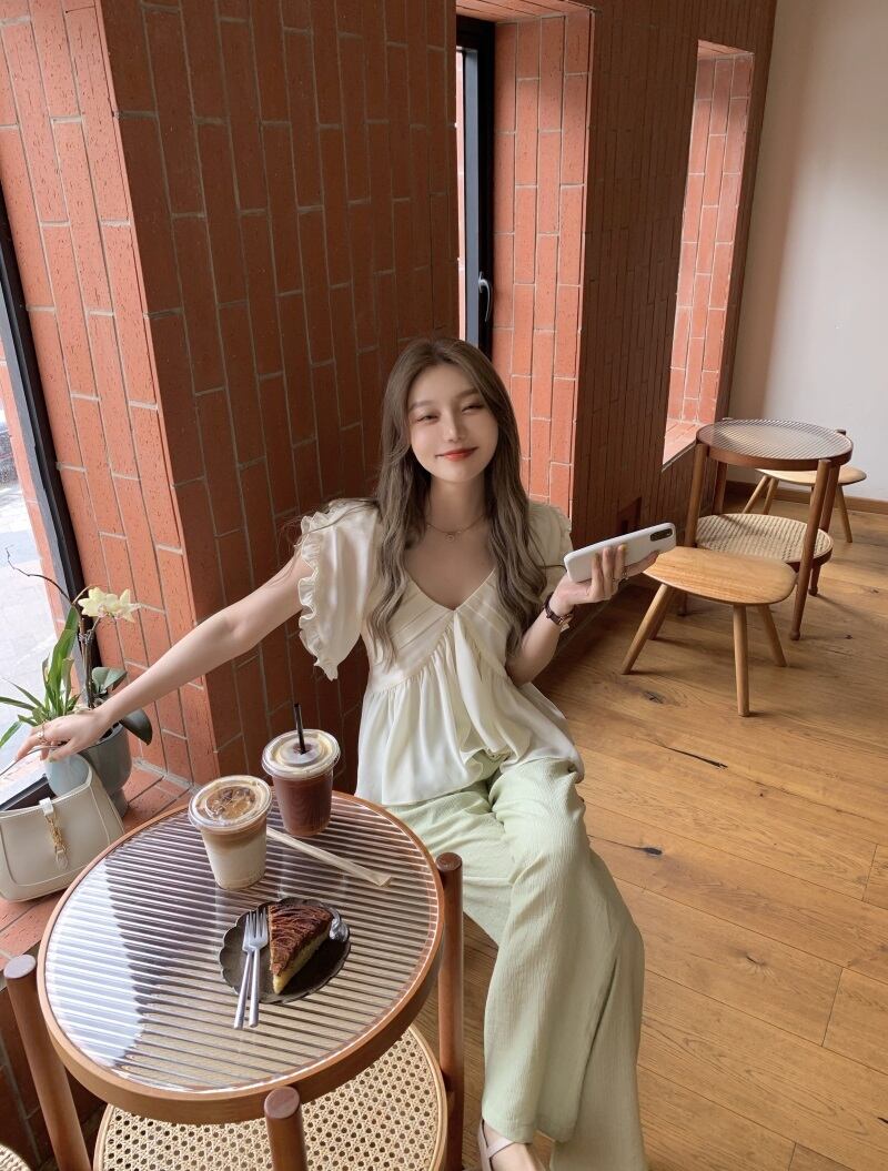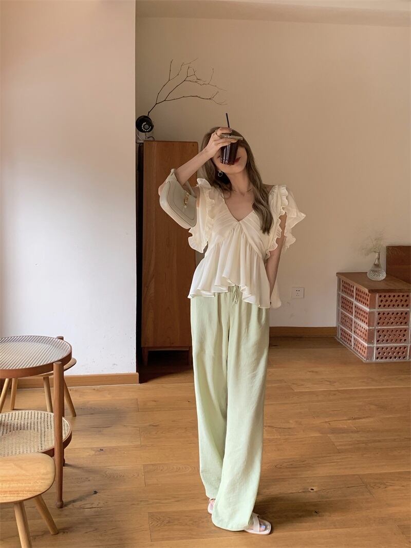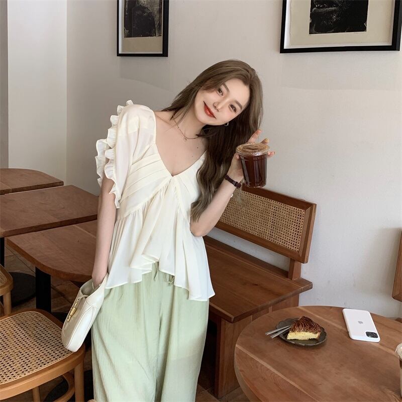 スリムVネックシフォンシャツ サマートップス 大人ガーリー スウィート キュート カジュアル 夏物 モンロー9626523722