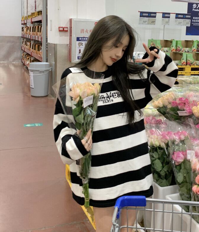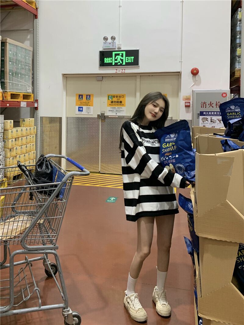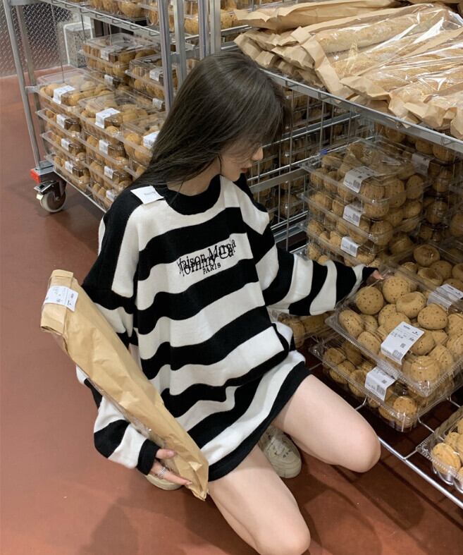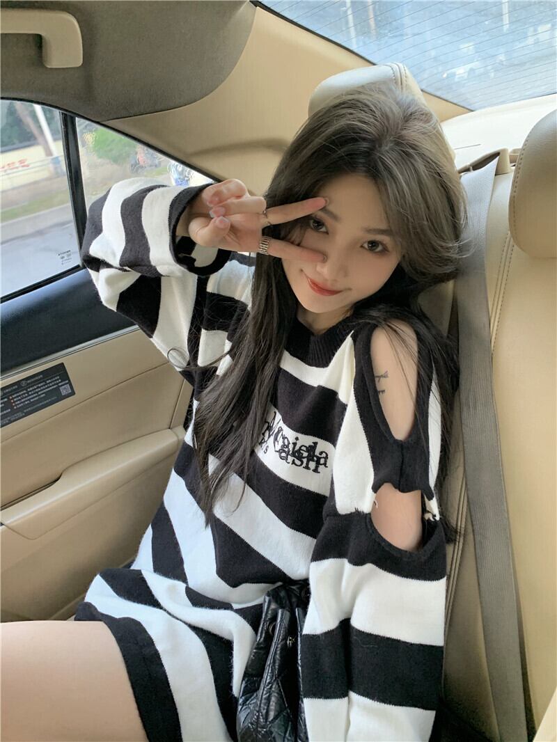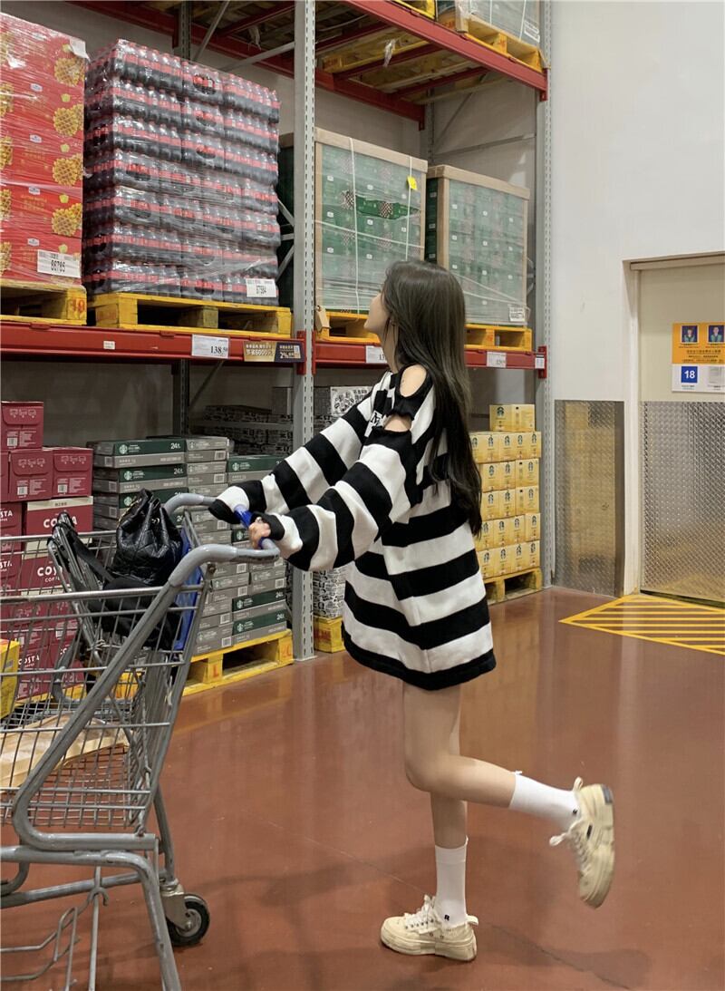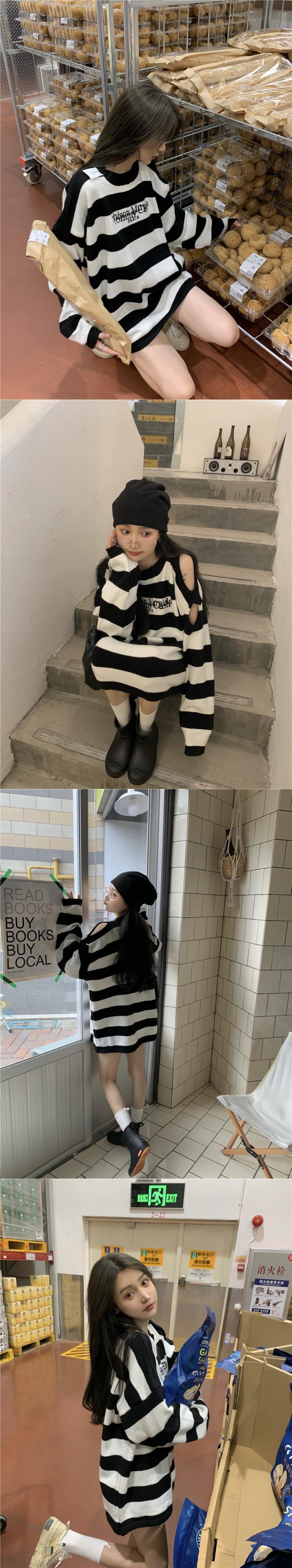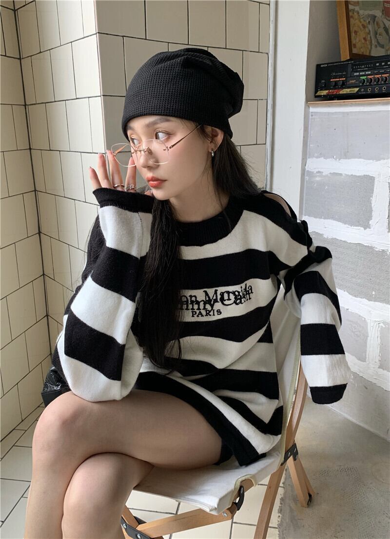 ストライプセーター ジャケット レディースオータムウィンタースタイルルーズトップス ロング 秋物 冬物 オフショルダー モンロー31687171125