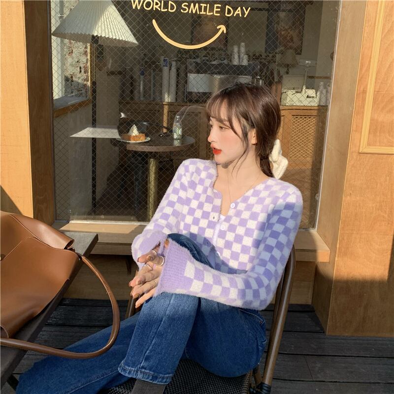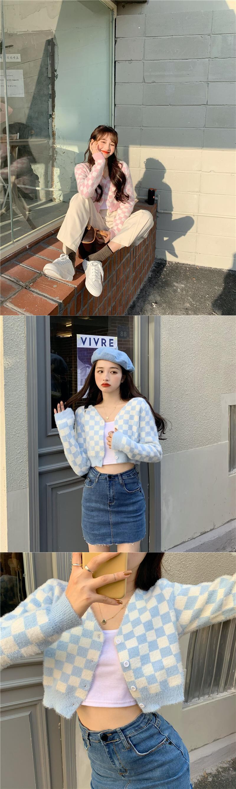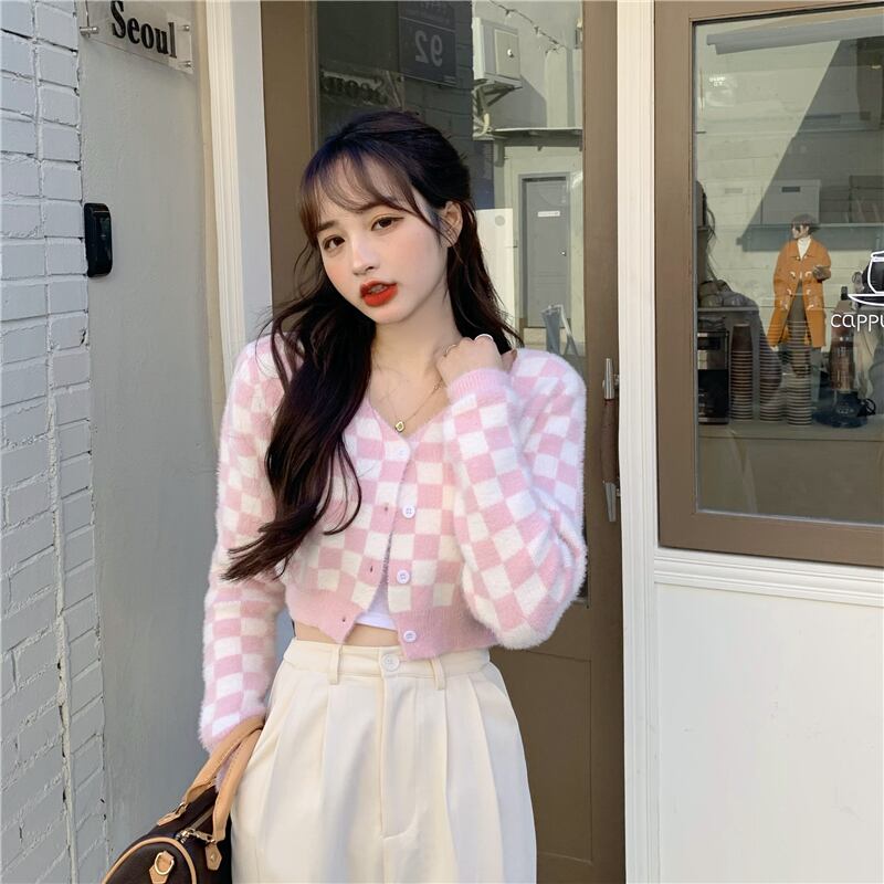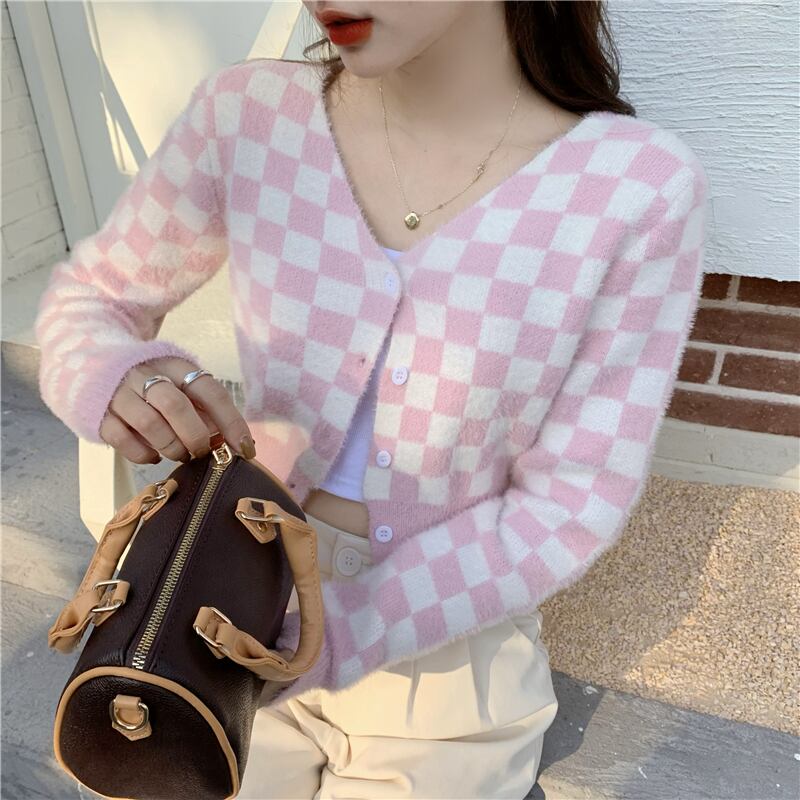 長袖スリーブVネック格子柄ニットカーディガンオータム薄手セーター ジャケット ショートトップス ロング 大人ガーリー スウィート キュート カジュアル 秋物 モンロー76867036000