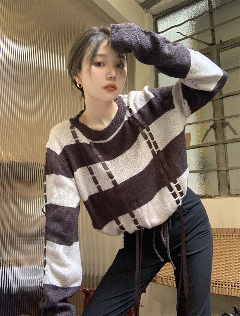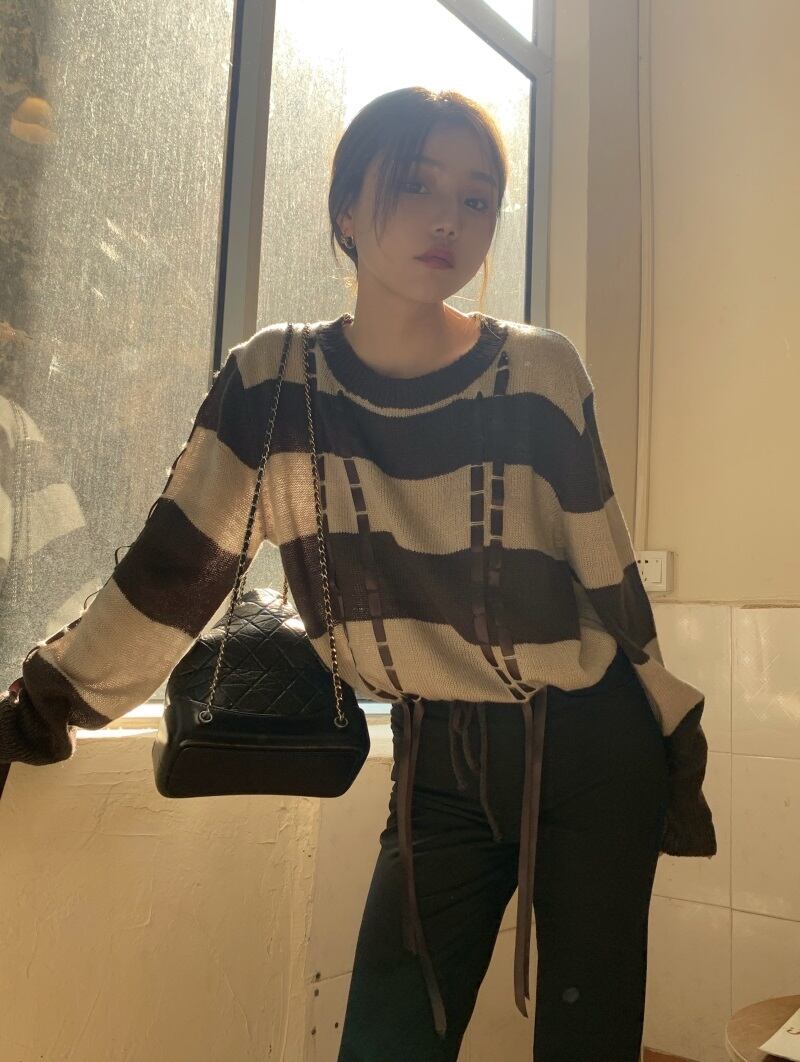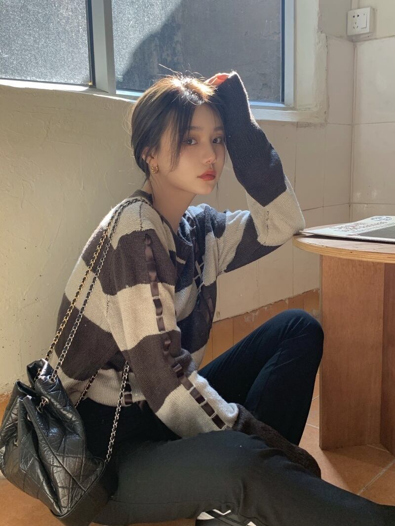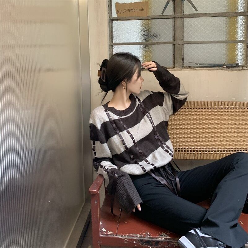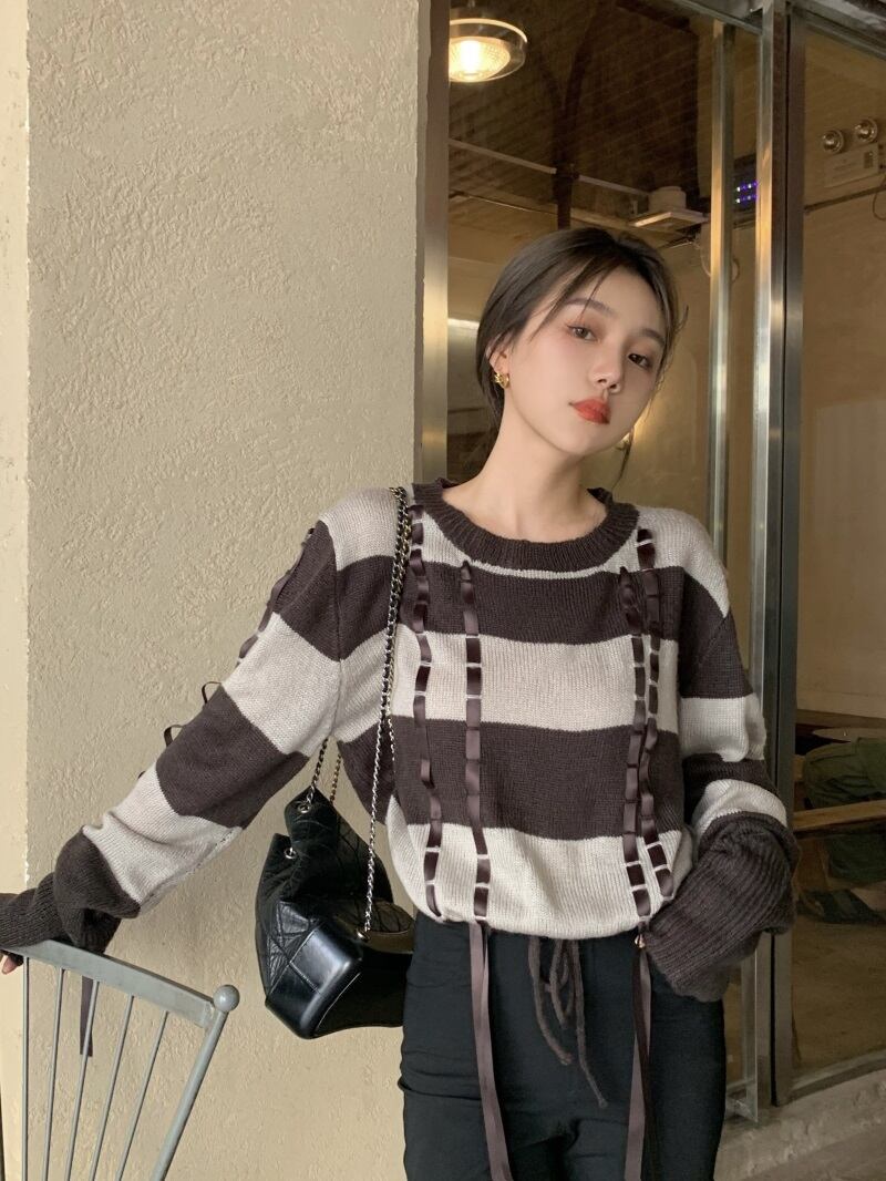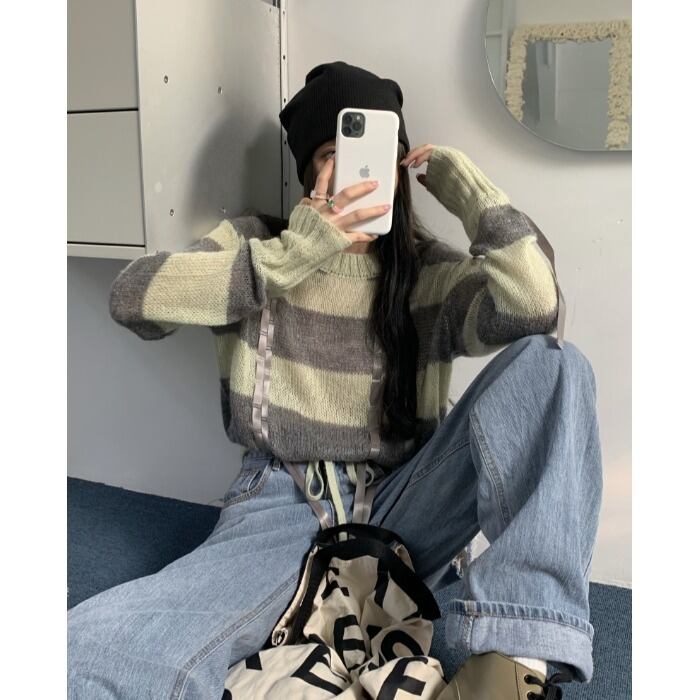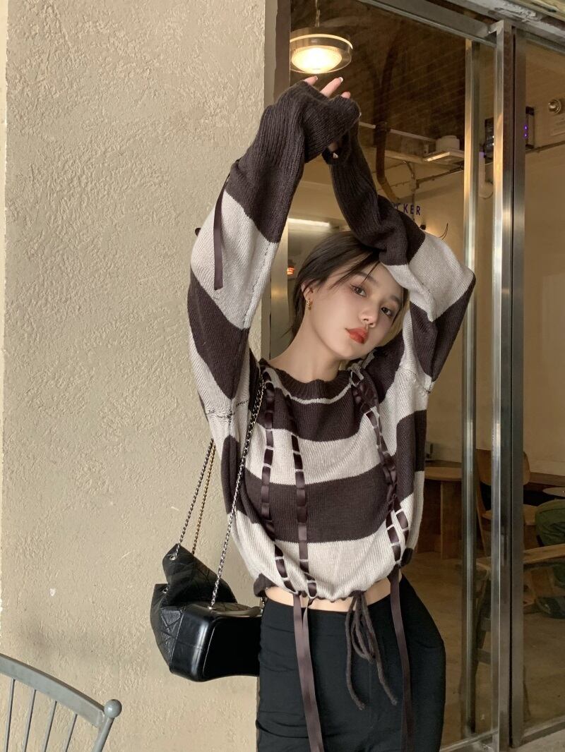 ルーズ薄手ストライプニットセーター サマープルオーバー ジャケット ロング 夏物 モンロー10850893907
