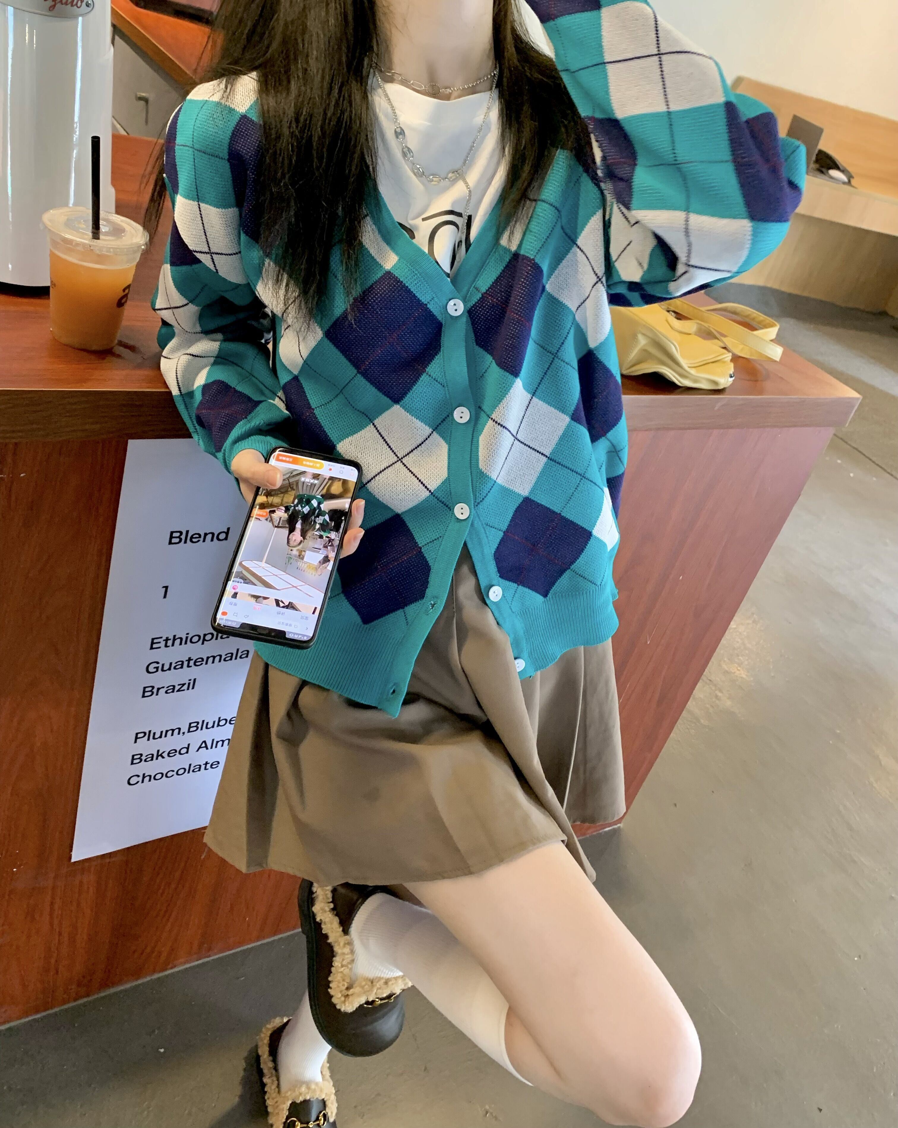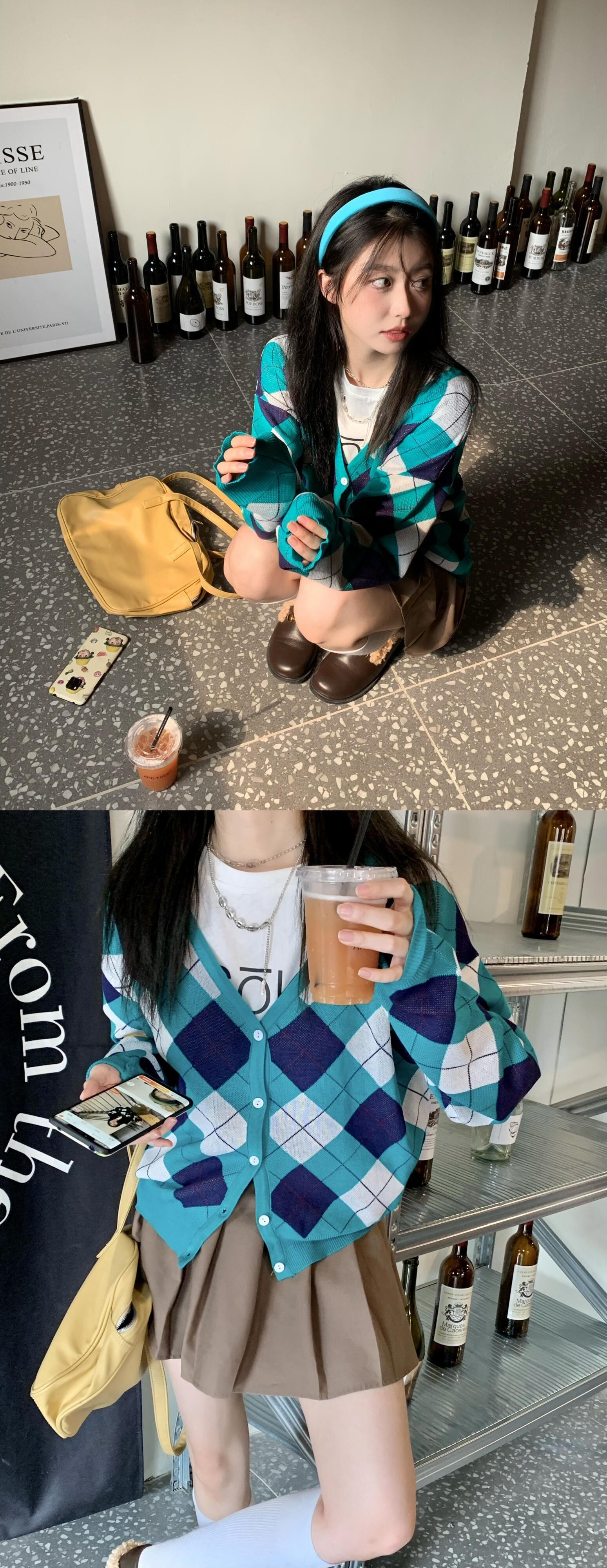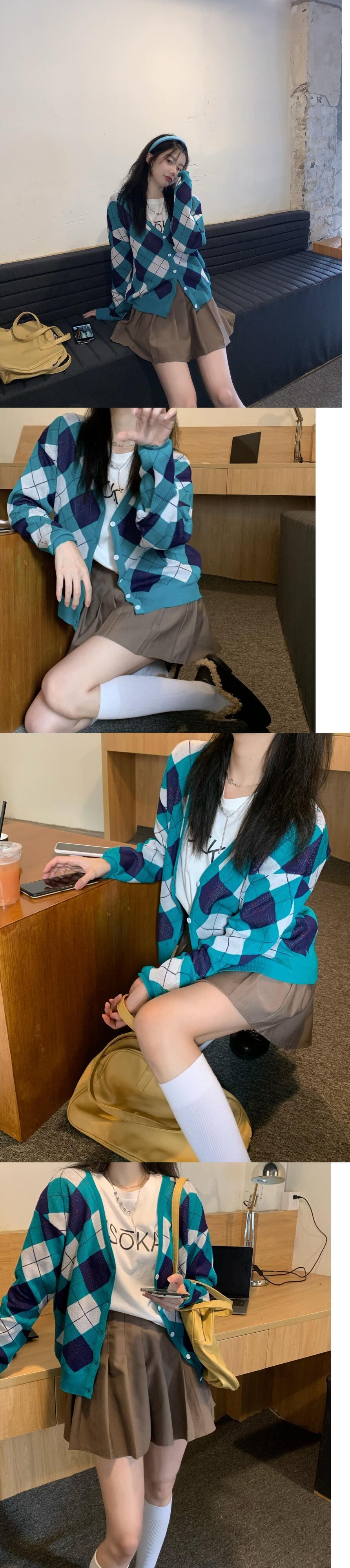 色:レターTシャツ,ダイヤモンドカーディガン,カーキ色のスカート