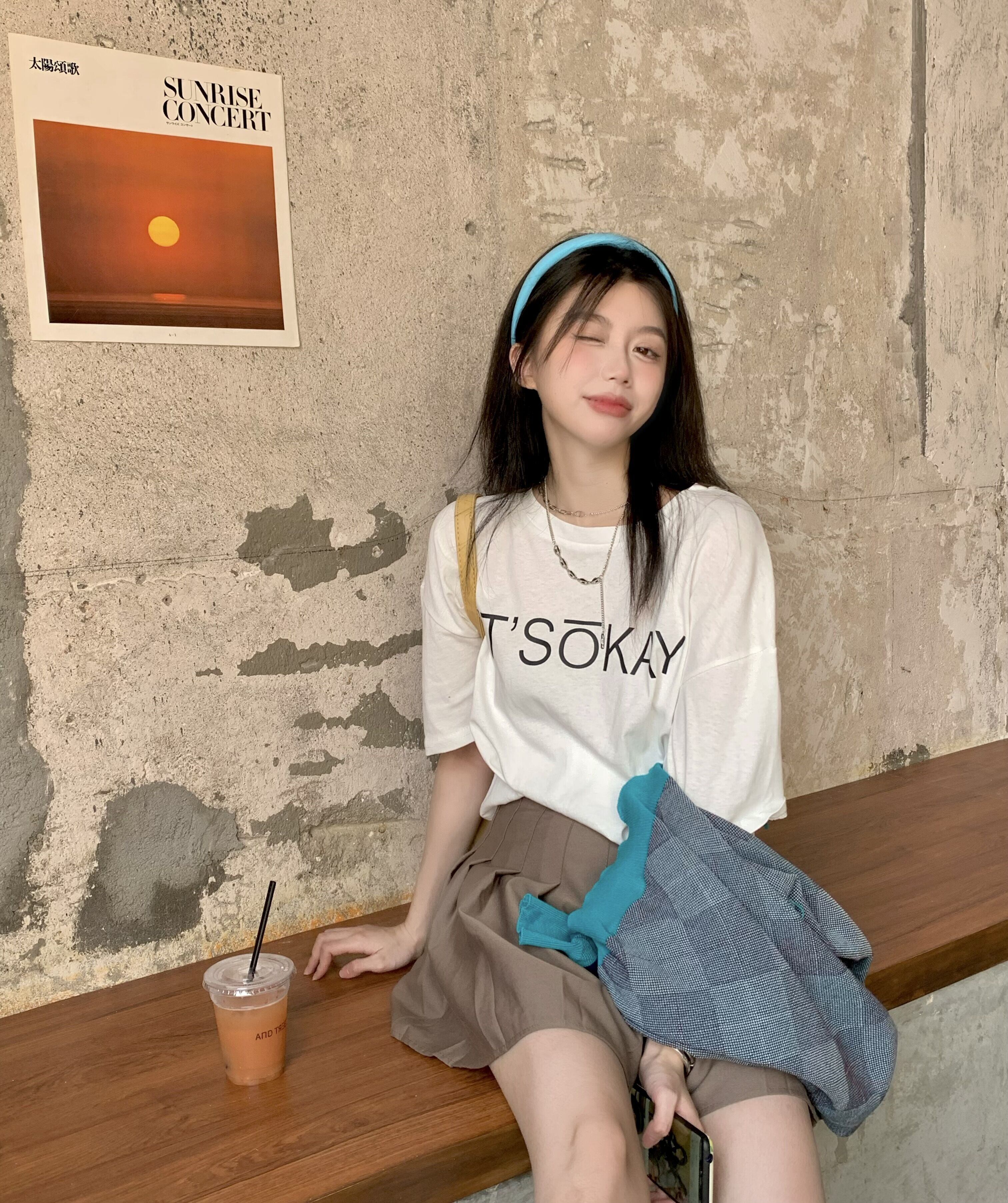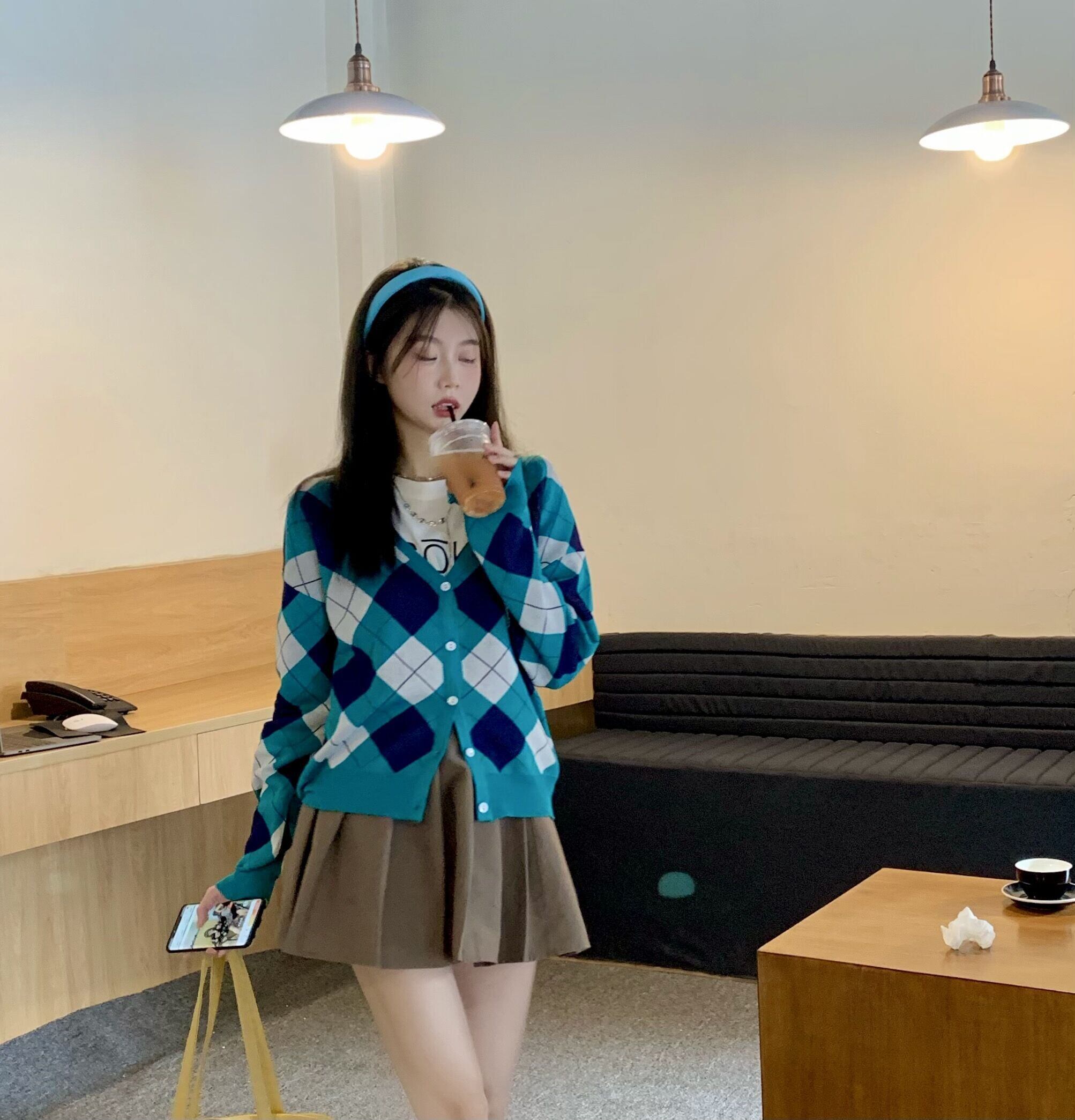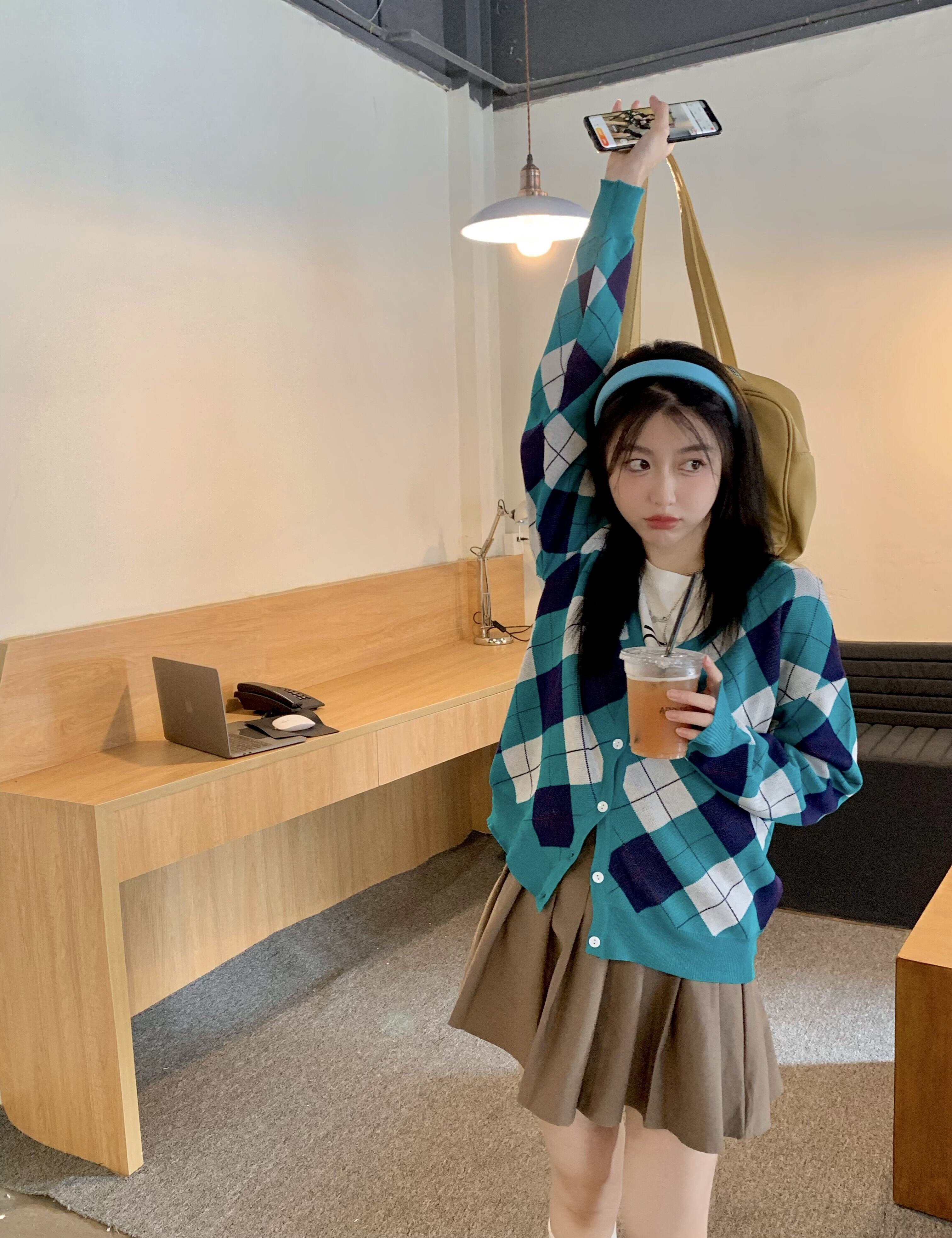 色:レターTシャツ,ダイヤモンドカーディガン,カーキ色のスカート