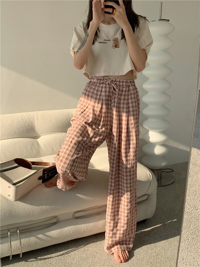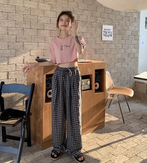 色:ピーチピンクTシャツ,乳白色のTシャツ,ピーチピンクパンツ,黒とグレーのパンツ