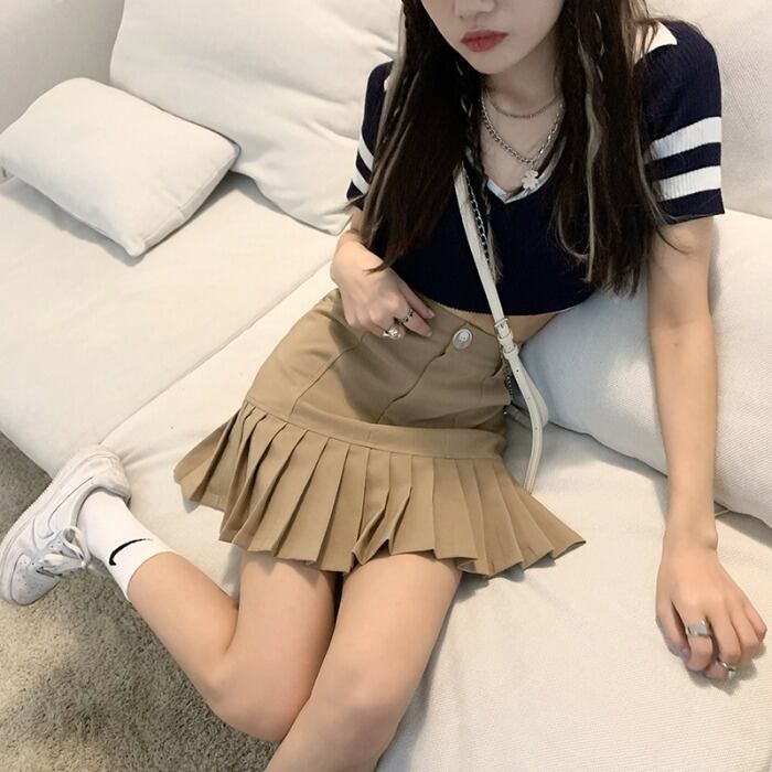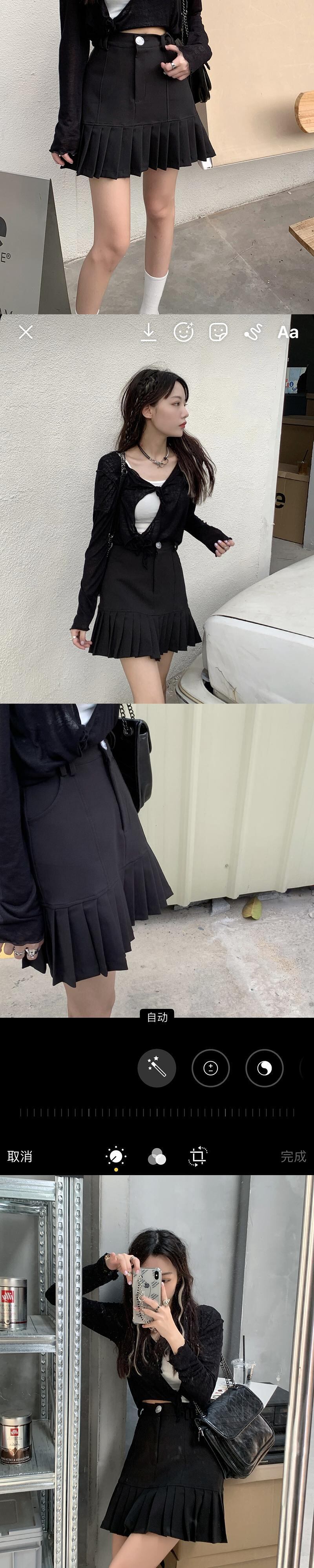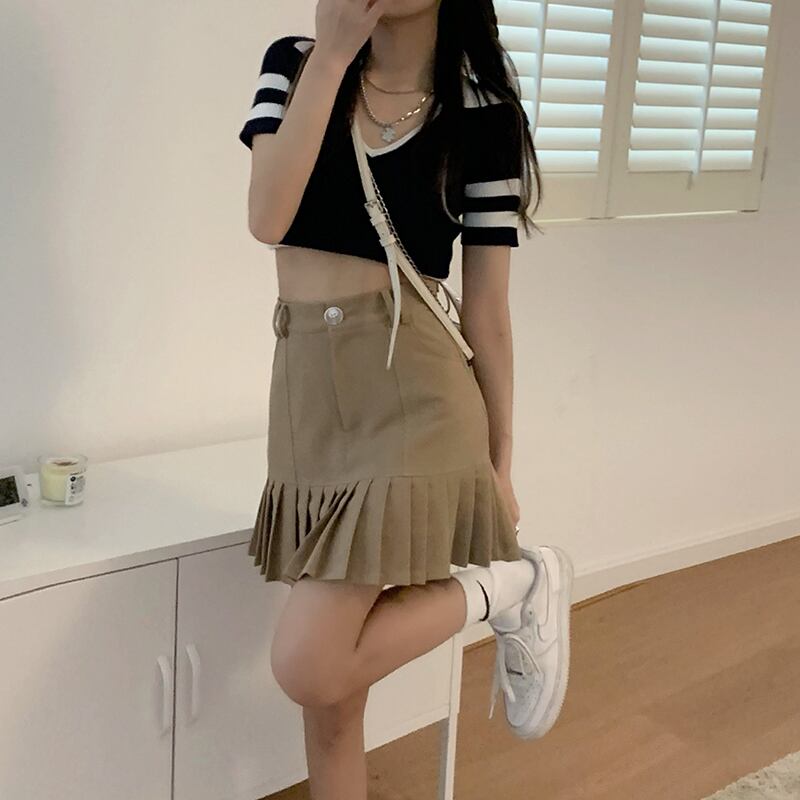 ブラックスカート サマーショート薄手Aラインハイウェストウェストプリーツ 夏物 モンロー18736010698
