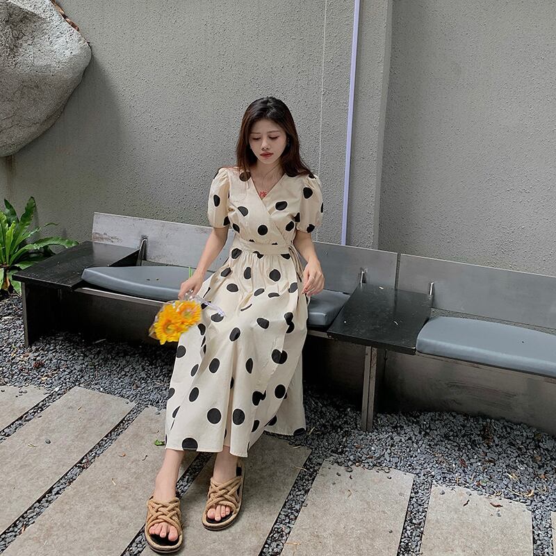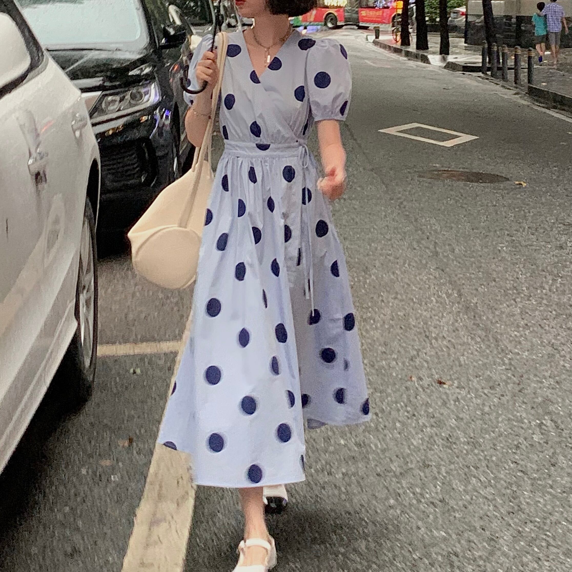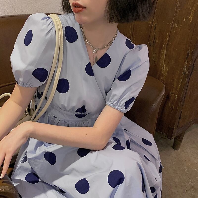 水玉スリーブVネックドレス サマーウェストAラインロングスカート 大人ガーリー スウィート キュート カジュアル 夏物 モンロー57868131578