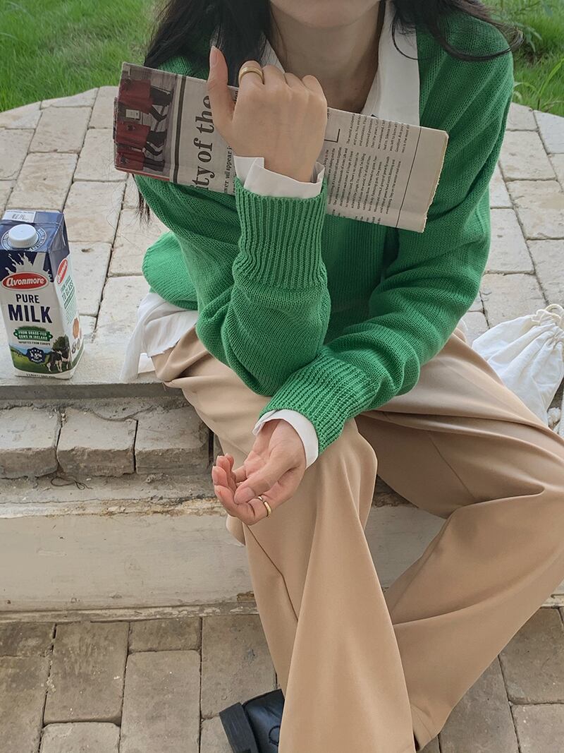 ルーズ薄手セーター ジャケット オータムグリーンカジュアルプルオーバー トップス ロング 秋物 モンロー40077896623
