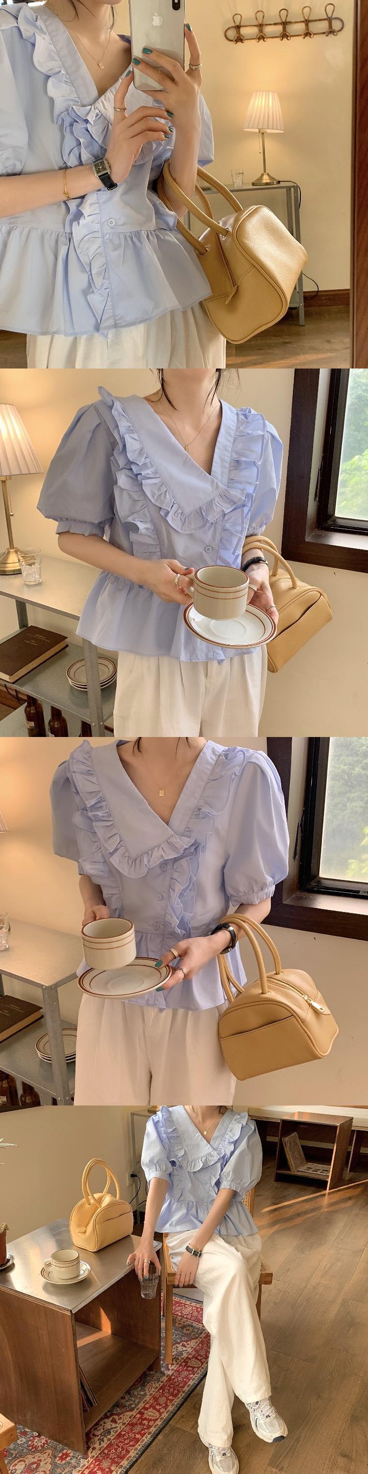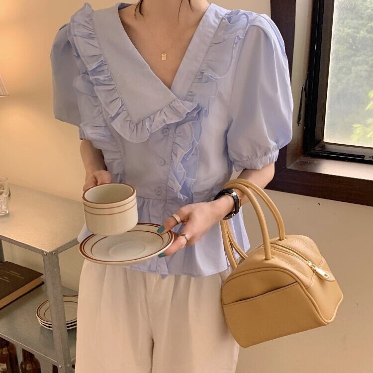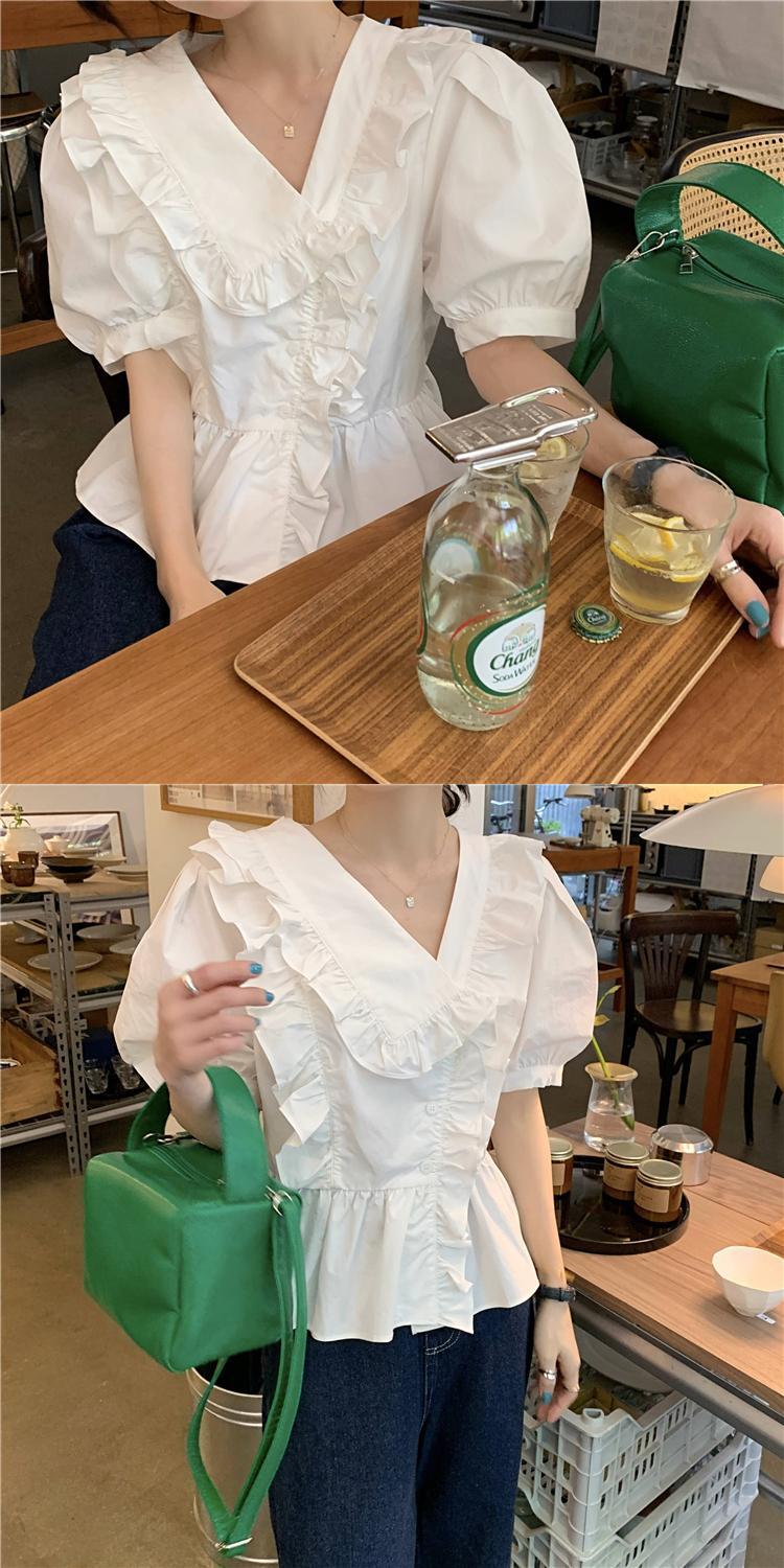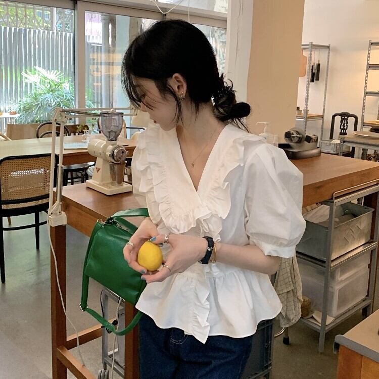 ホワイトVネックスリーブシャツ ショートサマートップス 大人ガーリー スウィート キュート カジュアル 夏物 モンロー93962531490