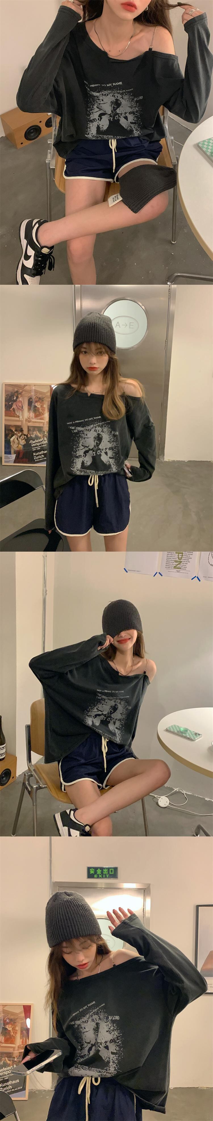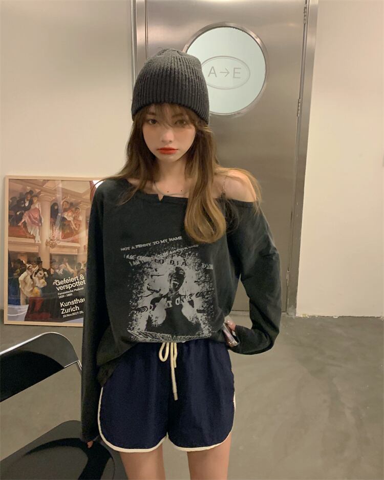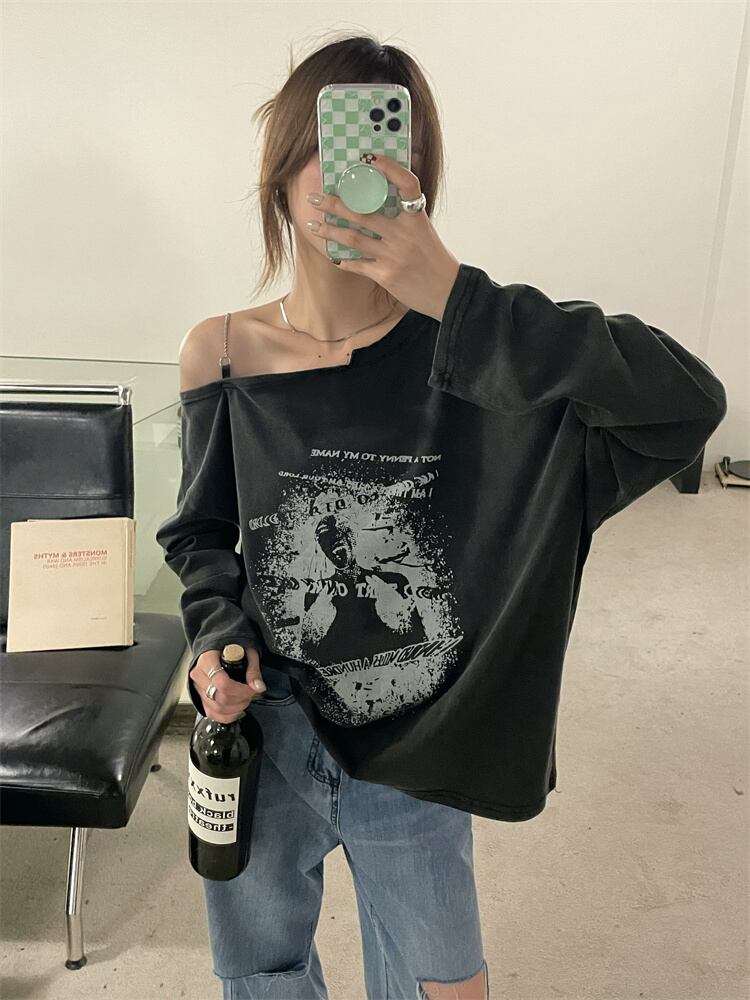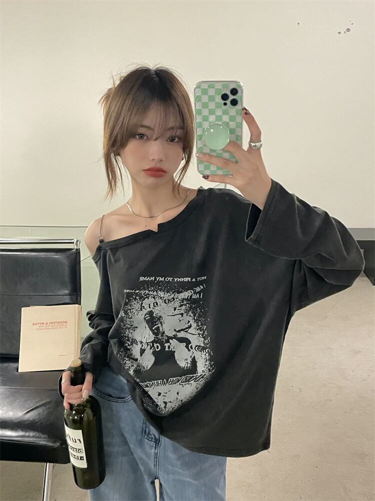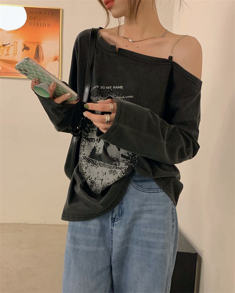 スタンダードストラップレスルーズTシャツ シャツ オータム薄手 ロング レトロ 秋物 モンロー82567987195