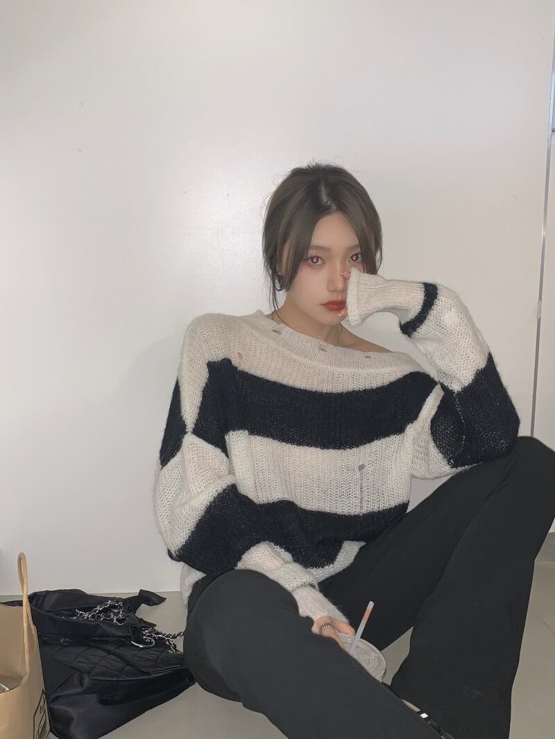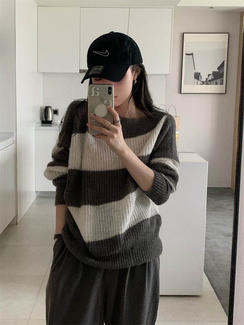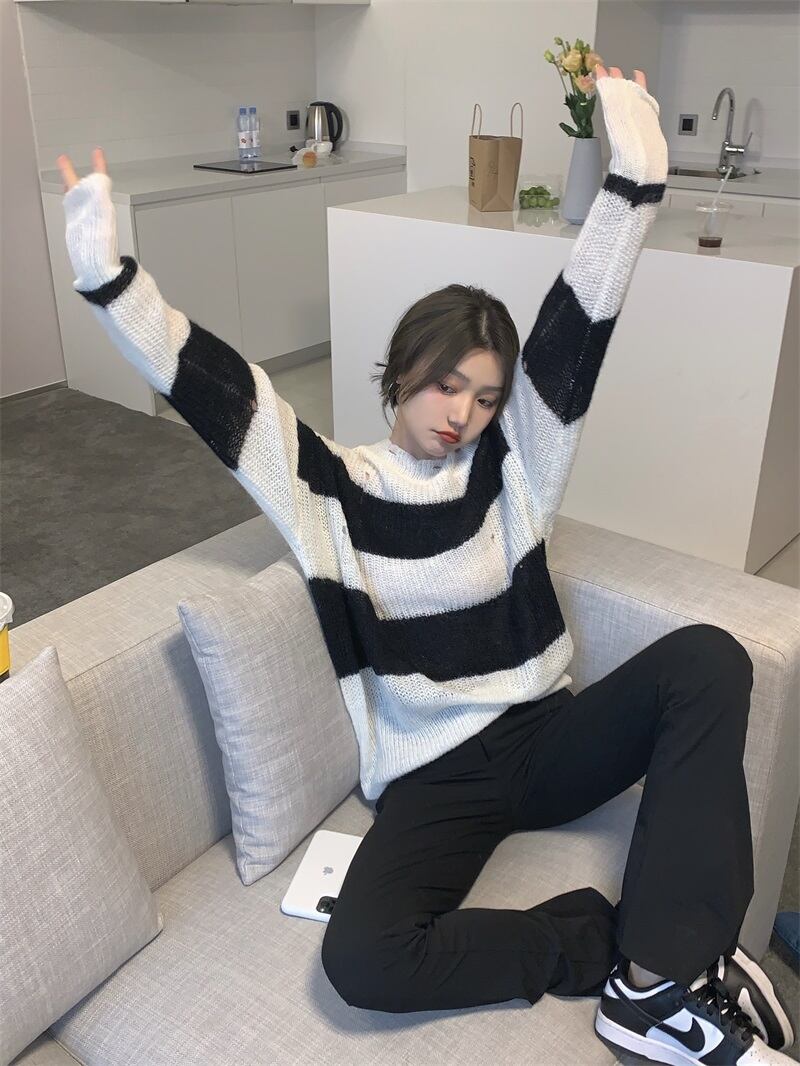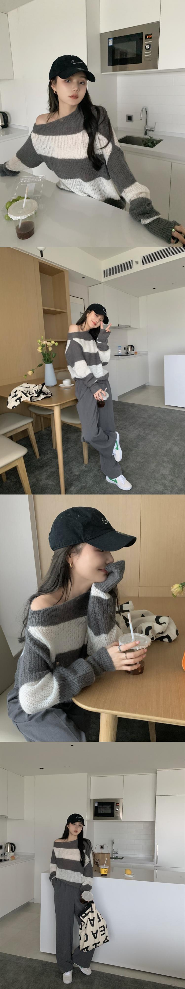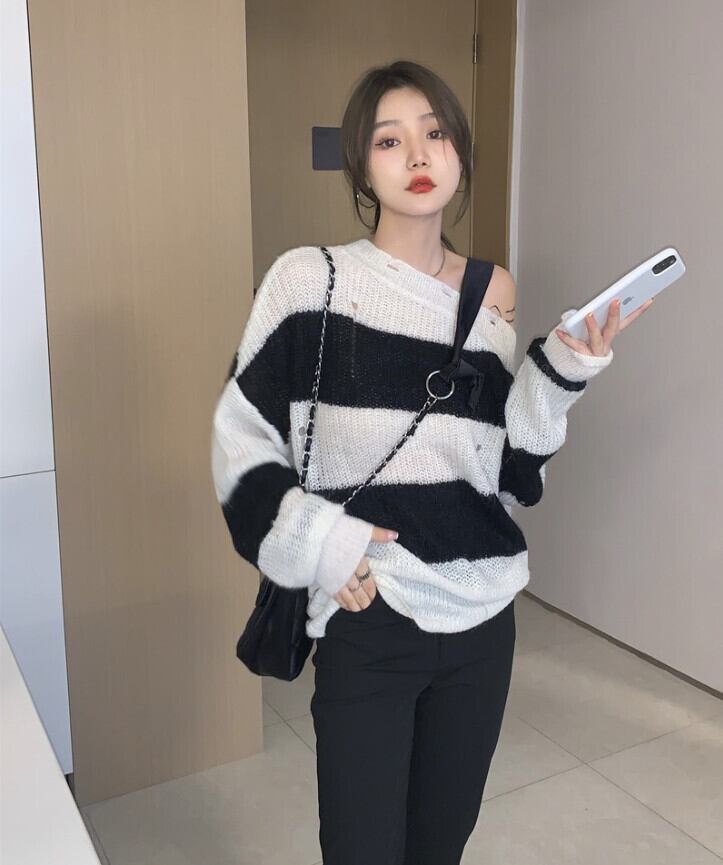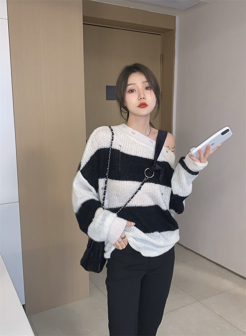ストライプニットセーター オータム薄手コート ルーズトップス 大人ガーリー スウィート キュート カジュアル 秋物 オフショルダー モンロー56985553966