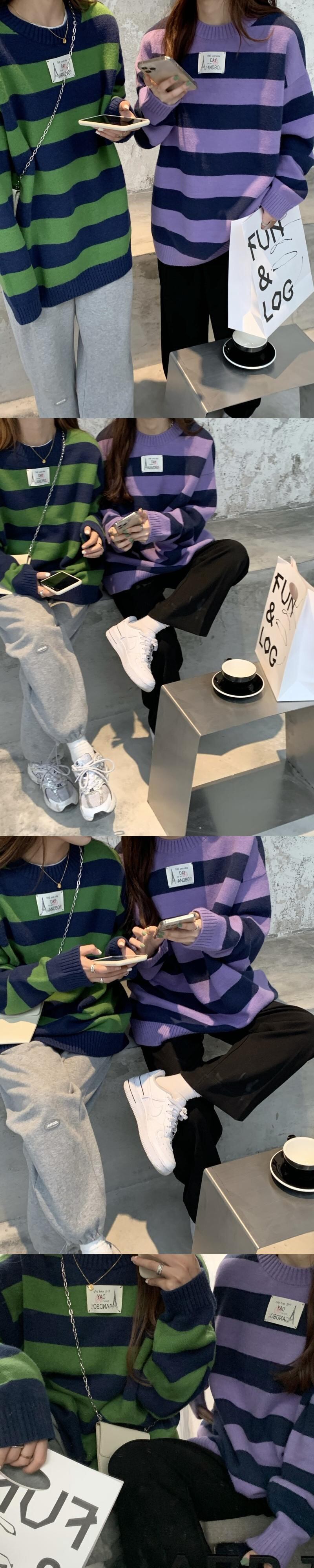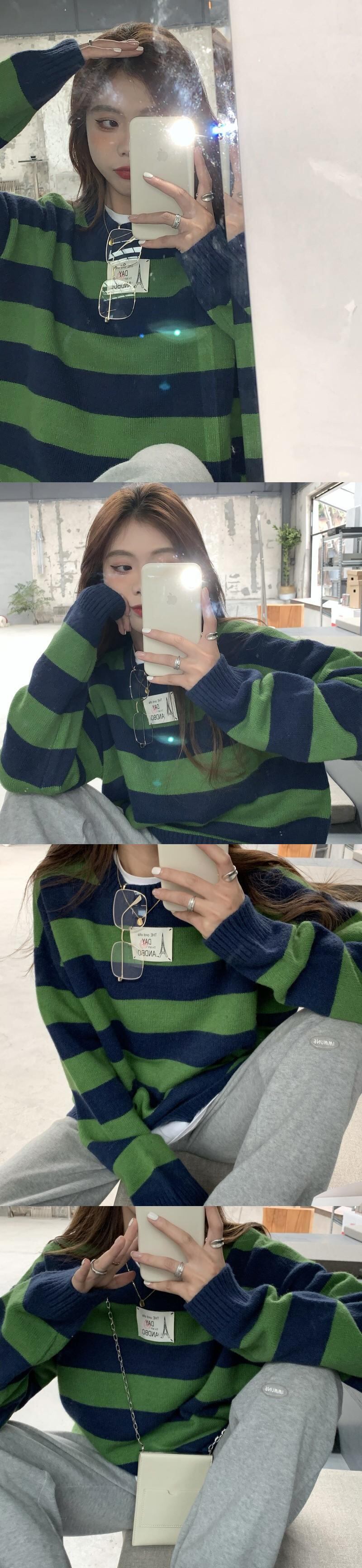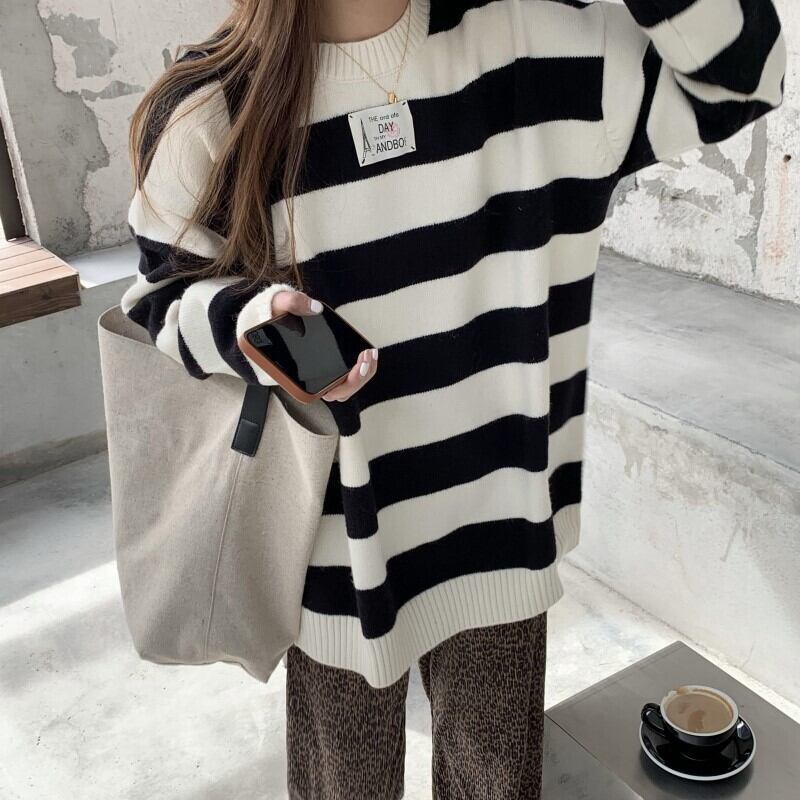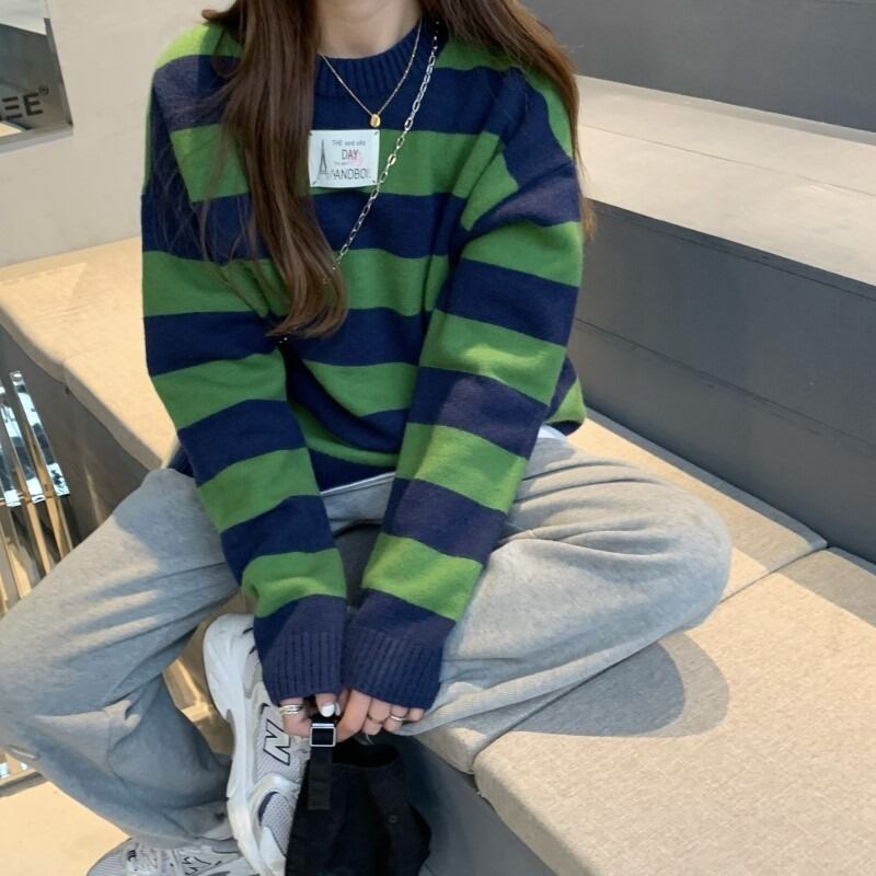 スタイルストライププルオーバー ニットセーター オータムルーズ薄手コート トップス 秋物 モンロー49935537497