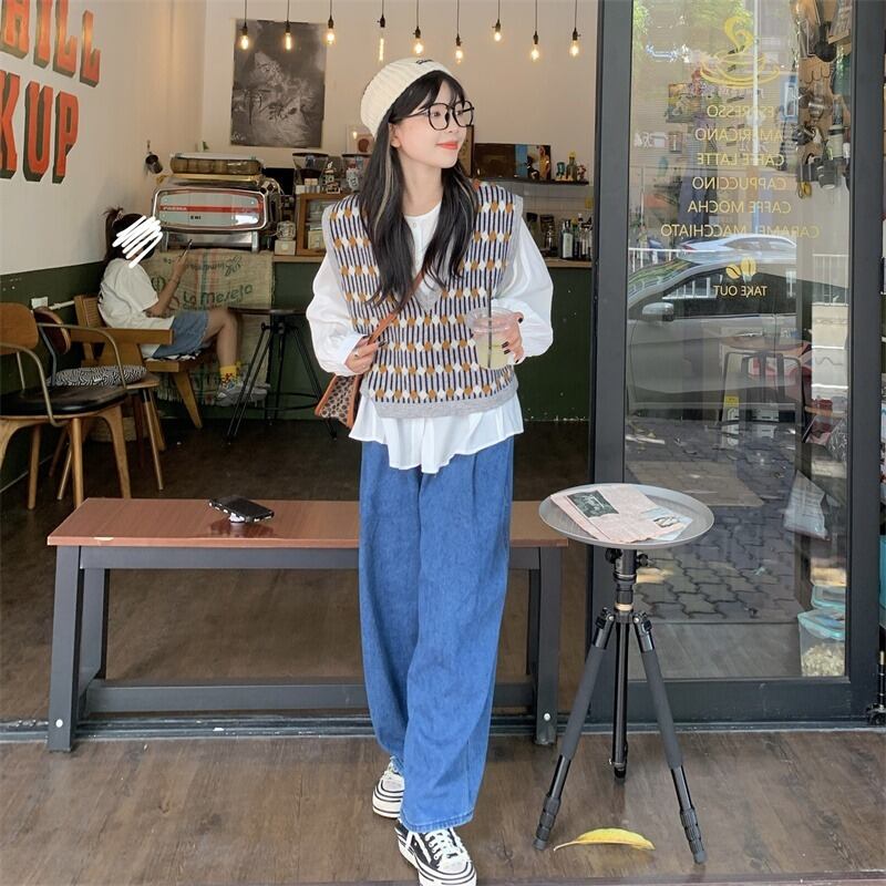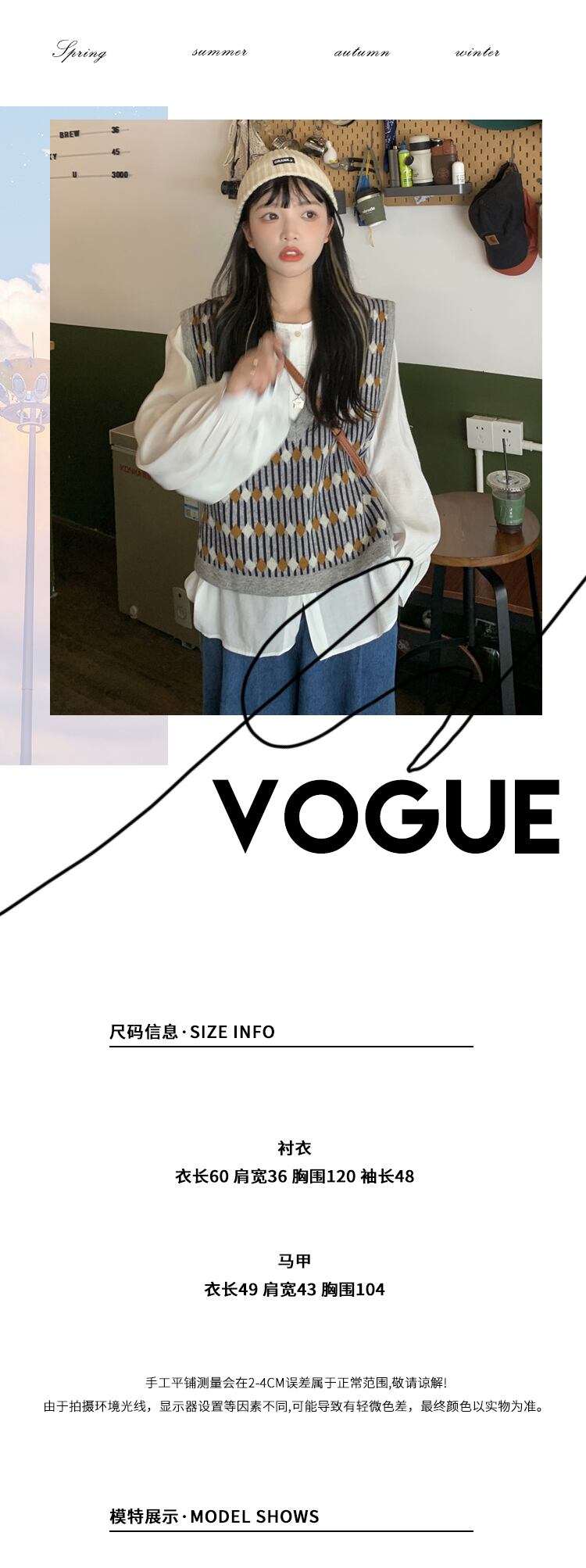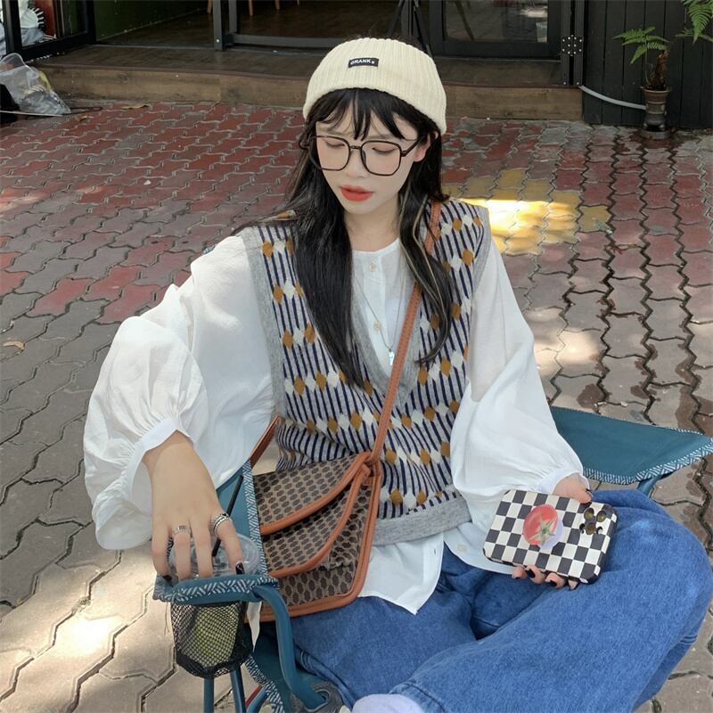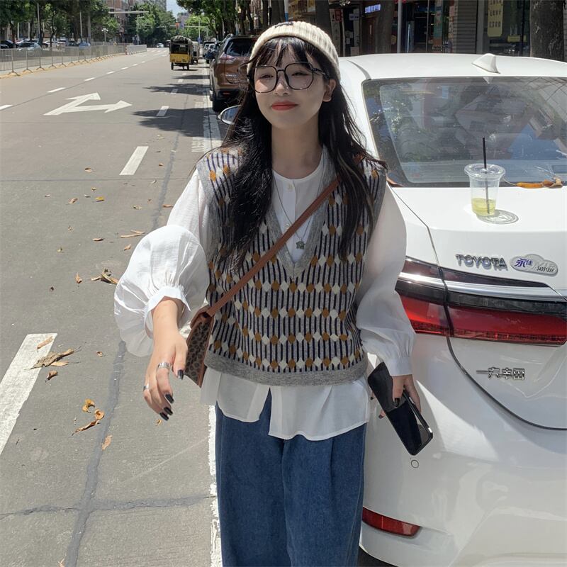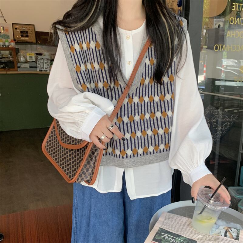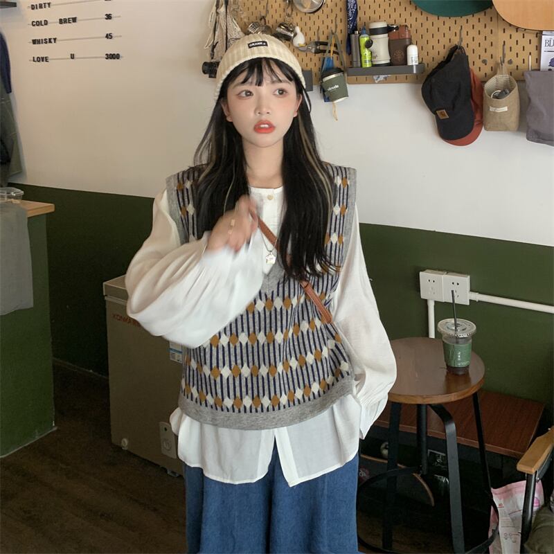 色:無地シャツ,パターン化されたベスト