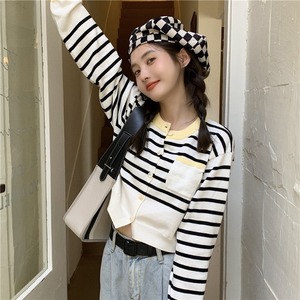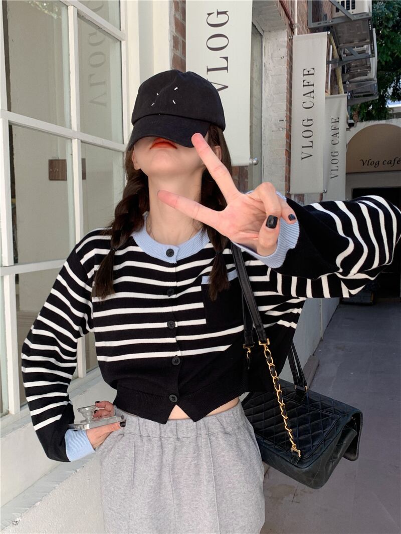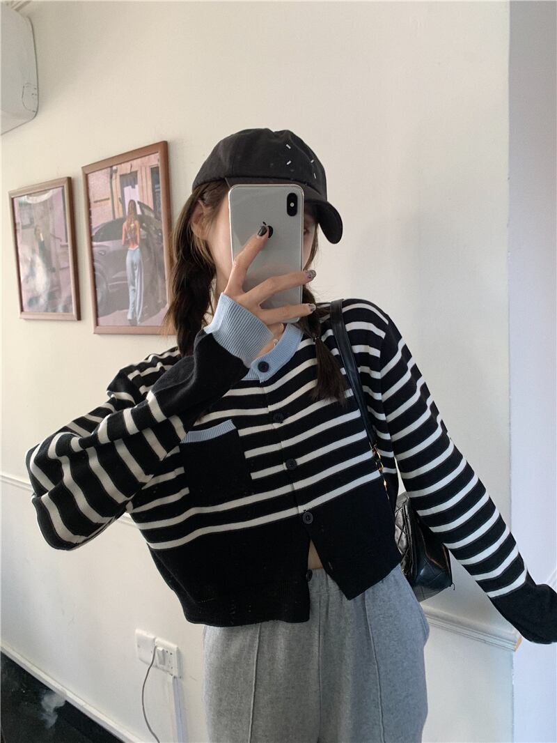 ショートルーズ長袖スリーブニットカーディガンオータムストライプジャケット トップス ロング 秋物 モンロー26176984869