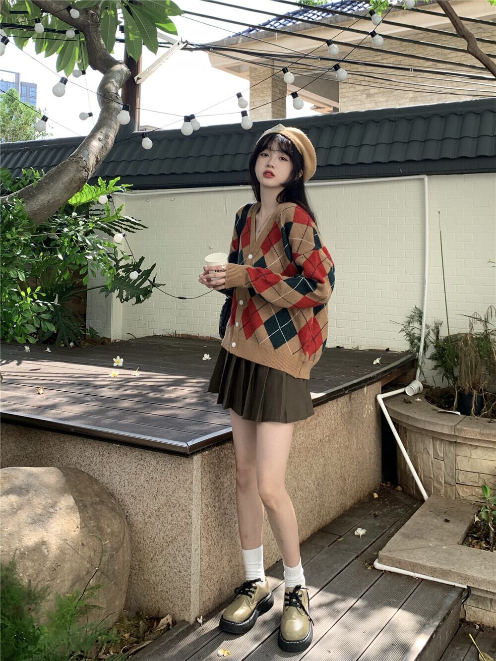 色:キャラメルダイヤモンドトップ,コーヒーカラーのプリーツスカート