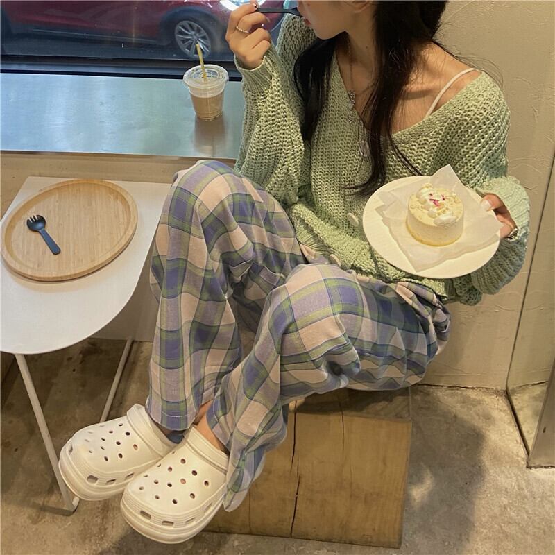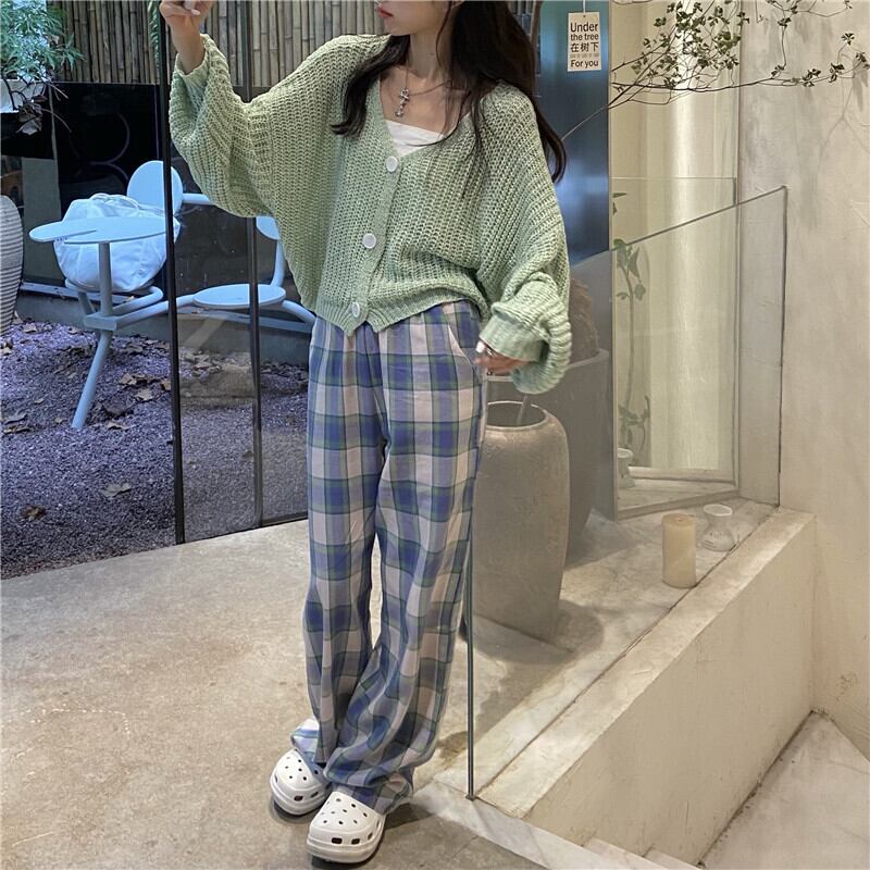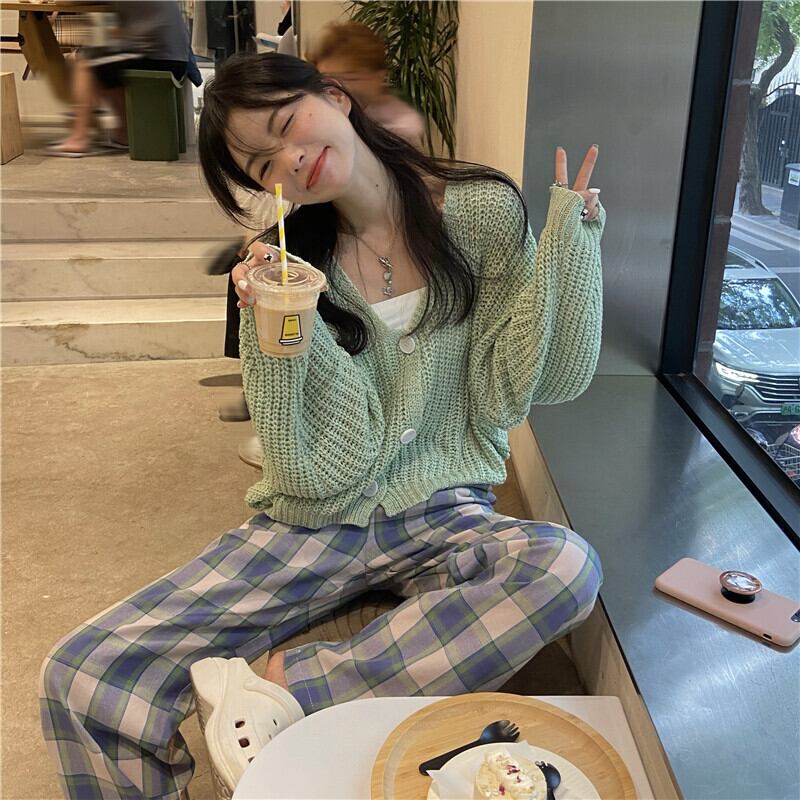 色:豆ペーストグリーンカーディガン,チェック柄パンツS,チェック柄パンツM