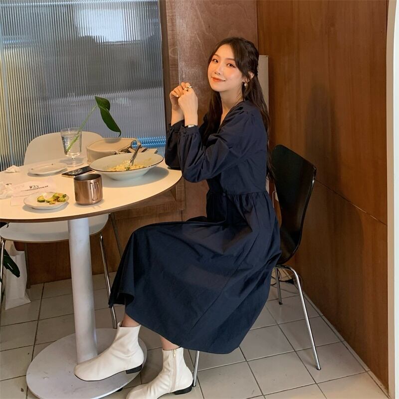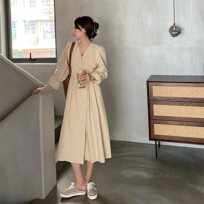 スタンダードVネックドレス オータムスリムロングスカート ウェスト レトロ 秋物 モンロー68904900946