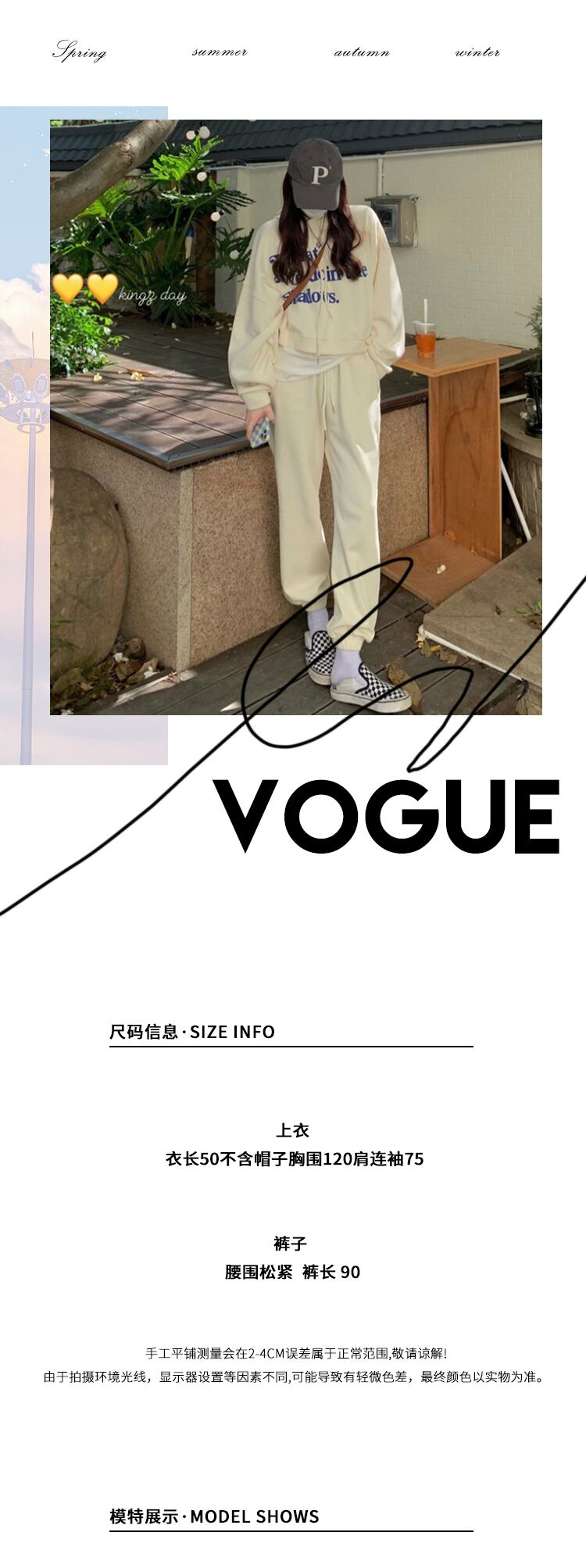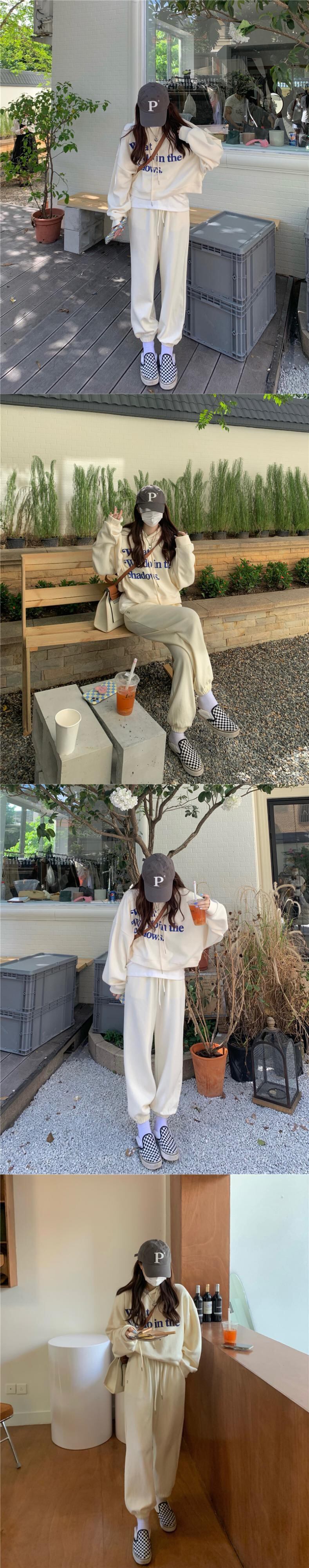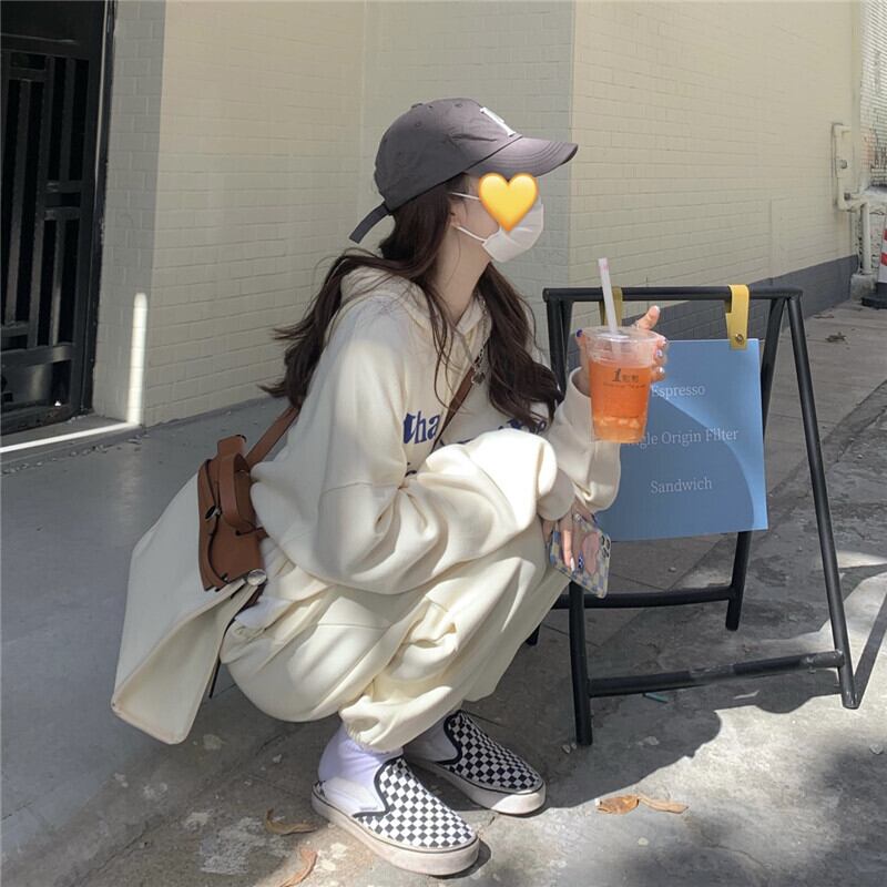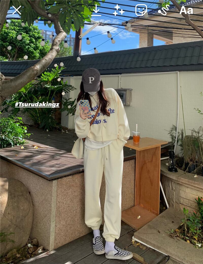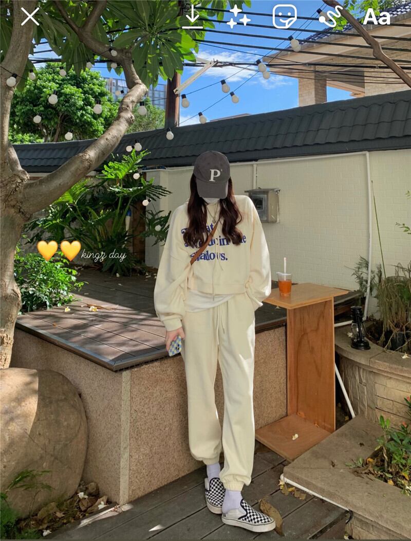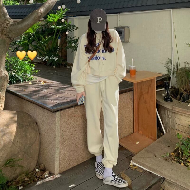 色:ベージュのセーター,ベージュのトラックパンツ