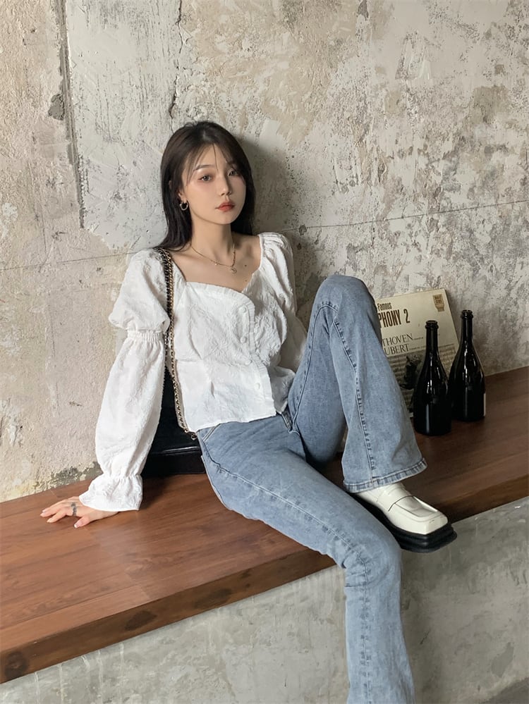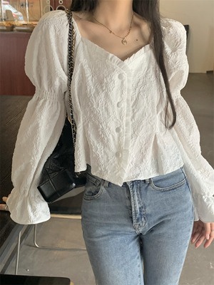 カラースリーブシャツ オータムショートトップス ロング ランタンスリーブ 秋物 スクウェア モンロー56556051160
