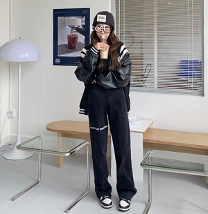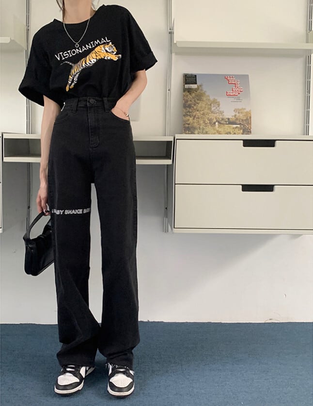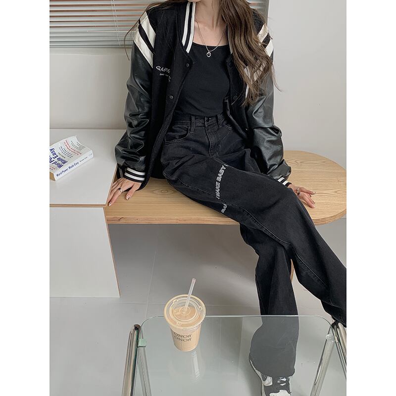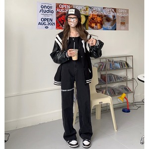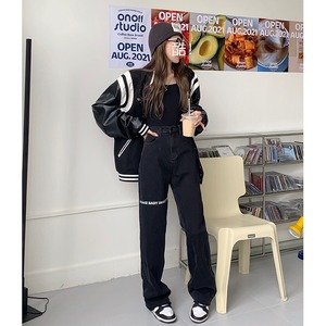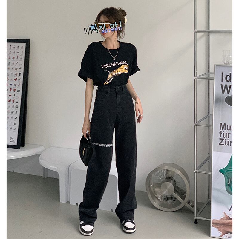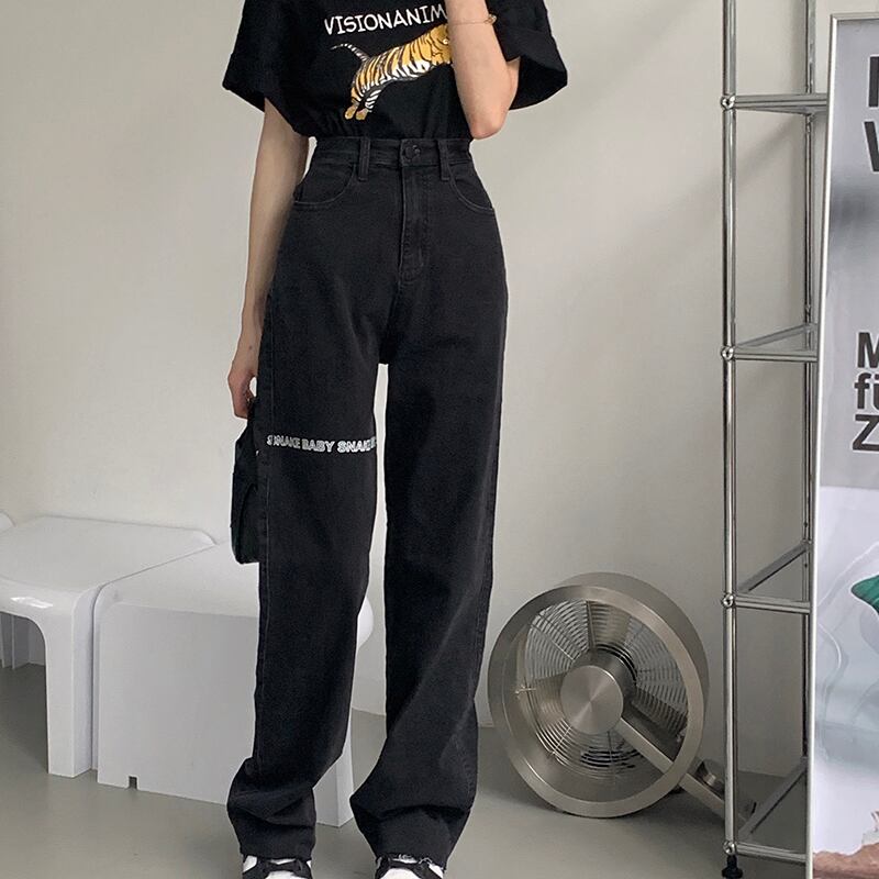 ブラックハイウェストウェストジーンズ レディーススプリングオータムルーズワイドレッグパンツ 春物 秋物 ワイドパンツ モンロー75371254828