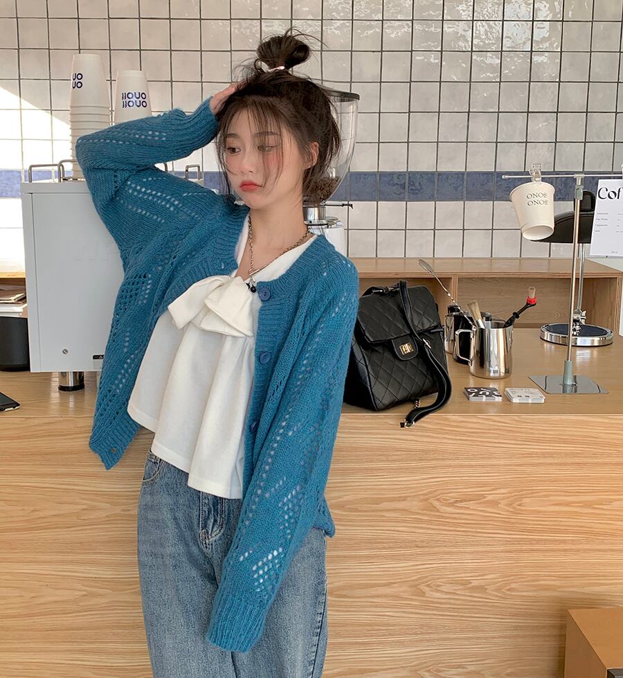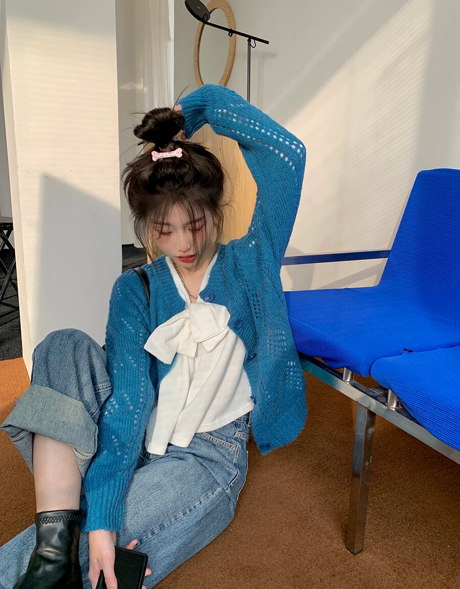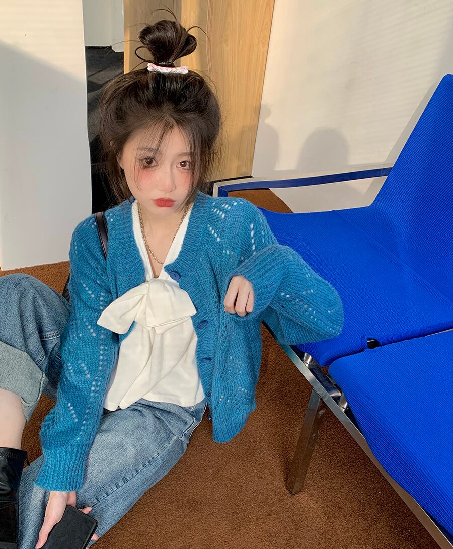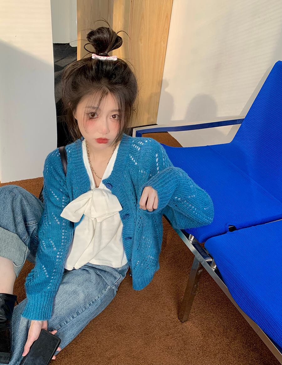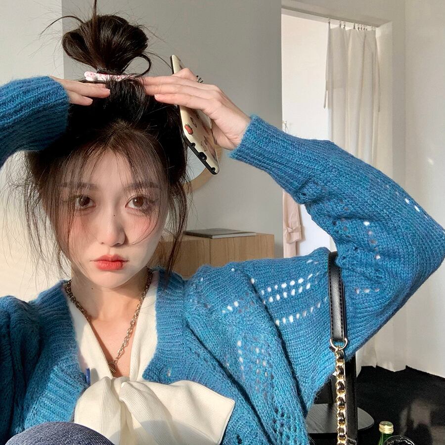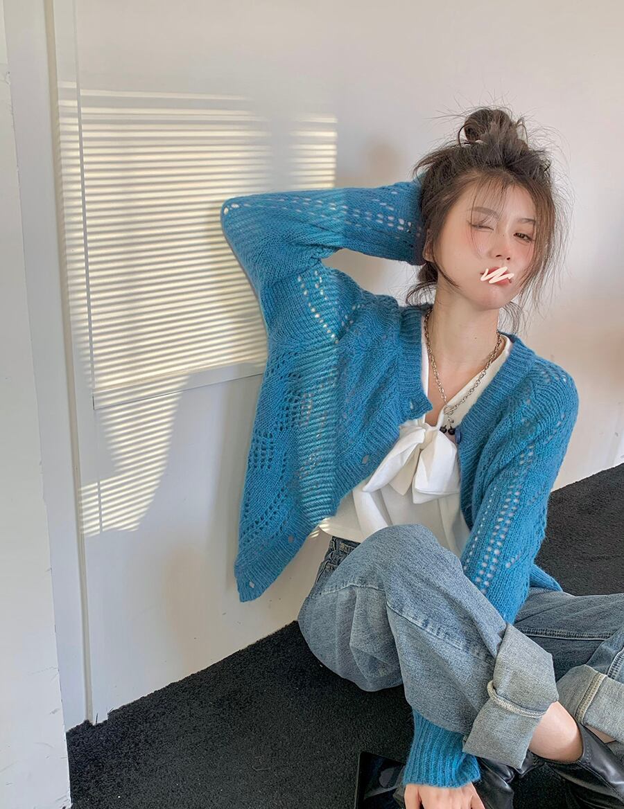ブルーニットカーディガンオータム薄手スタイルジャケット ロング 秋物 モンロー33783466368