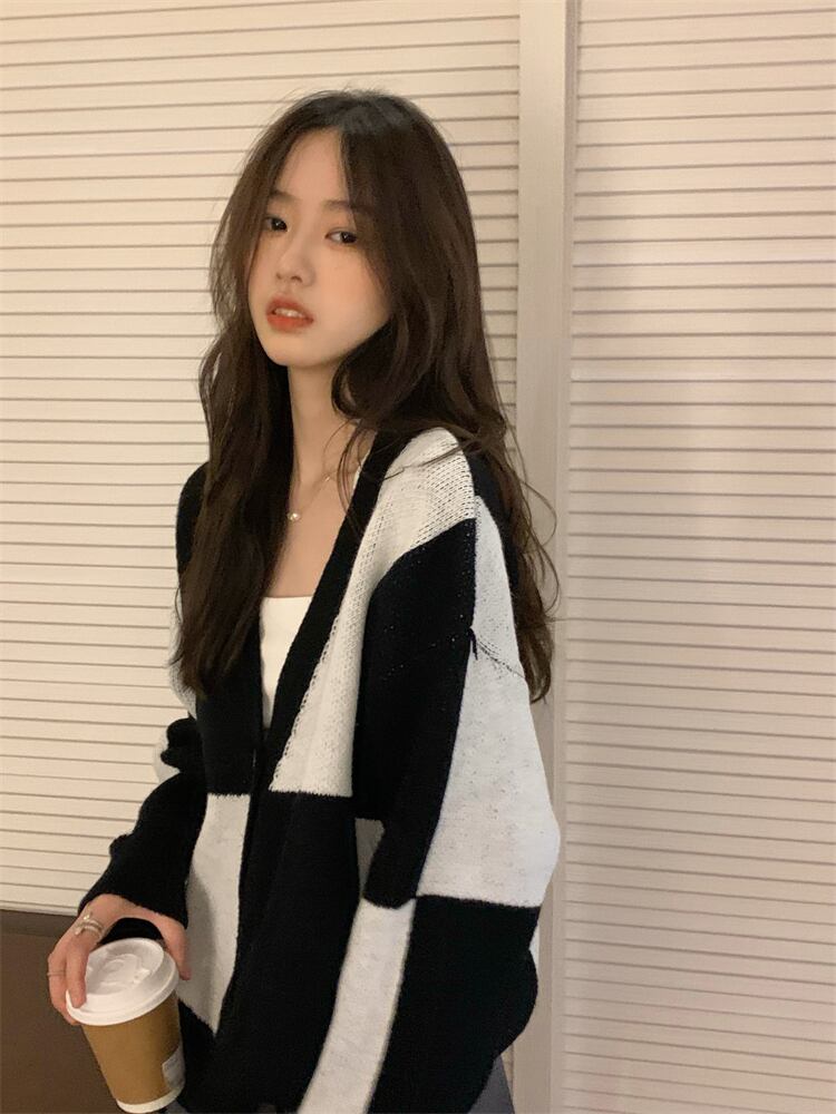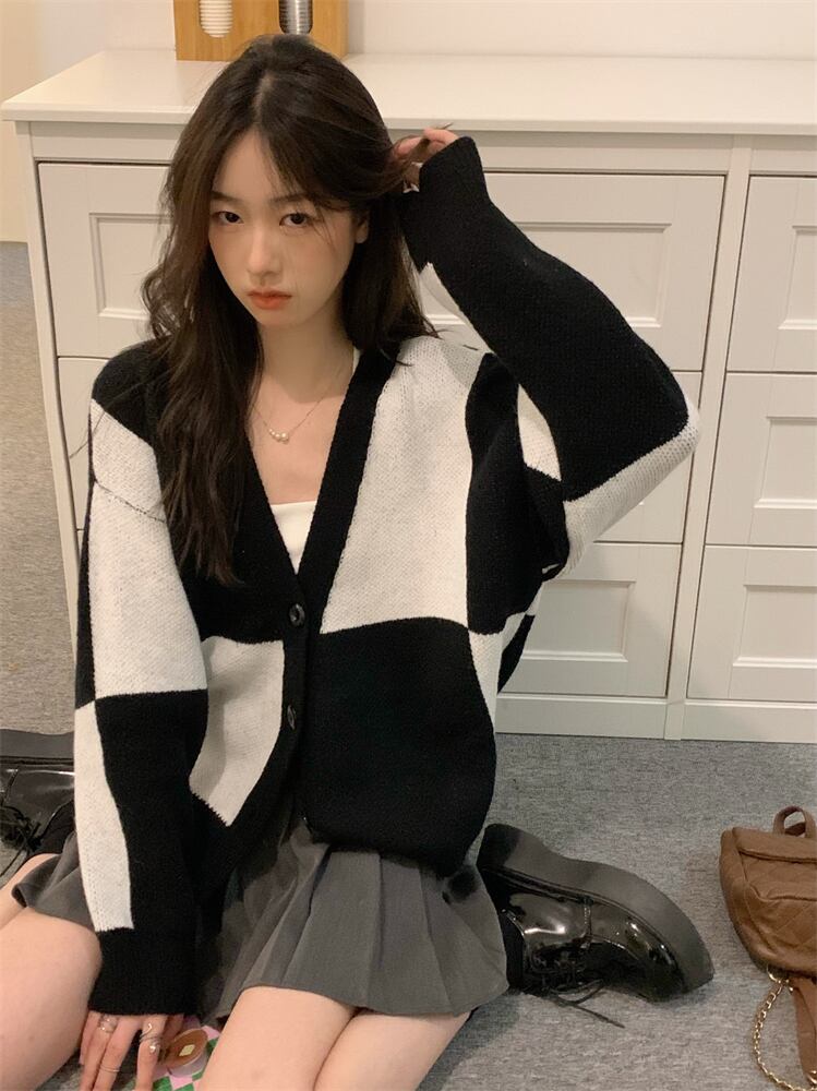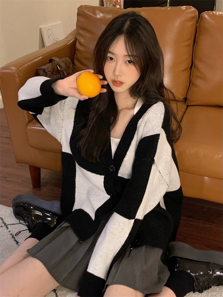 ルーズニットカーディガンオータムVネックブラックホワイトトップス ロング 秋物 モンロー36729567481