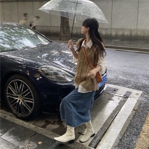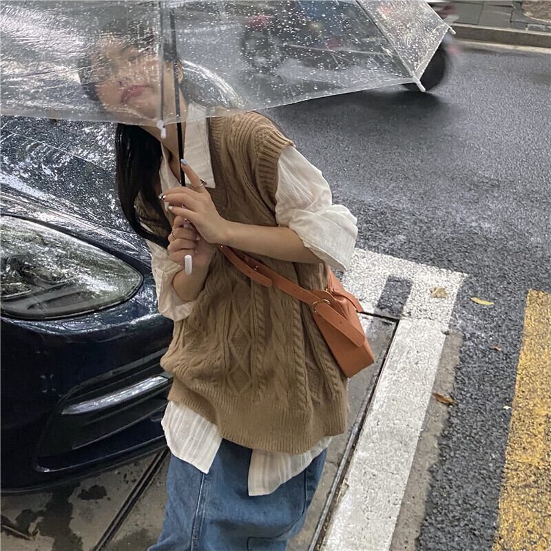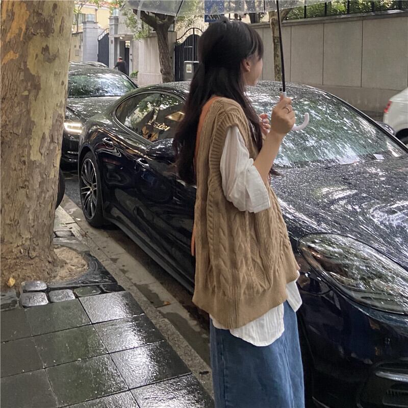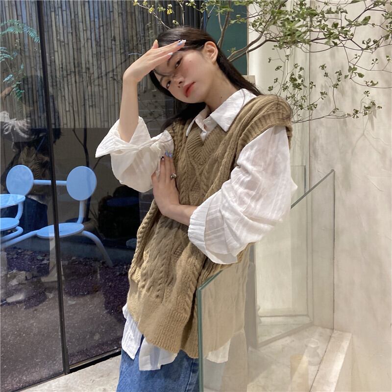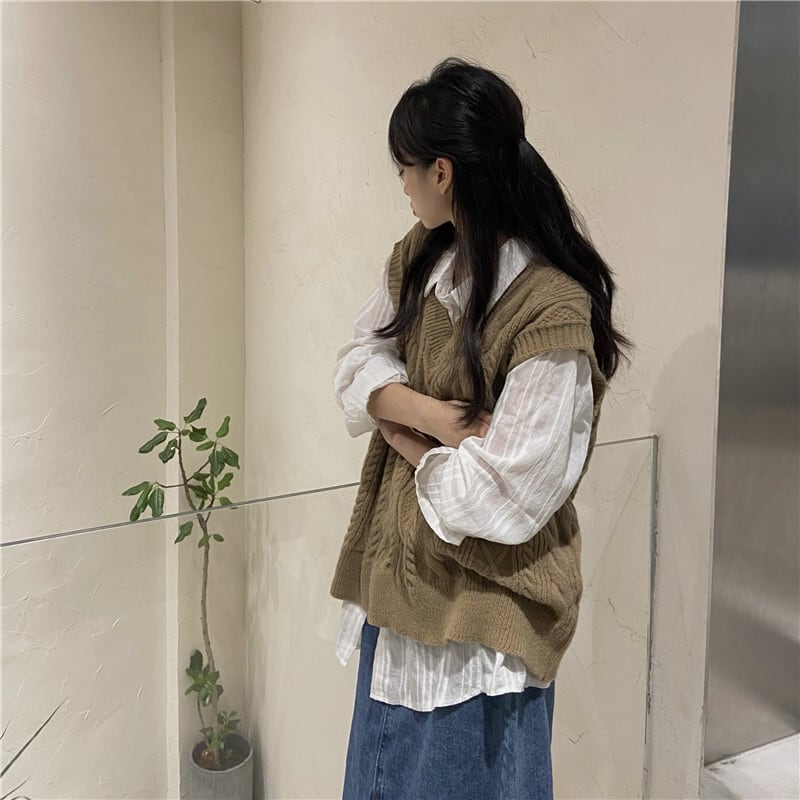 色:カーキVネックセーター,テクスチャード加工の白いシャツ