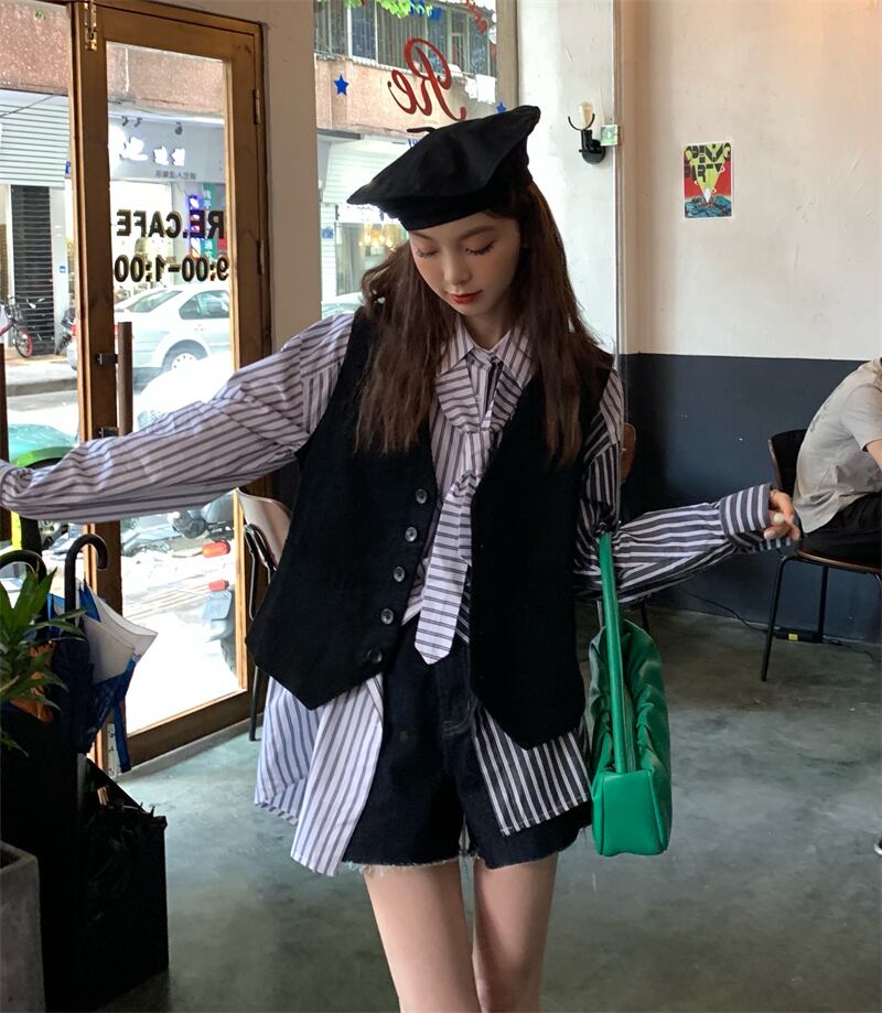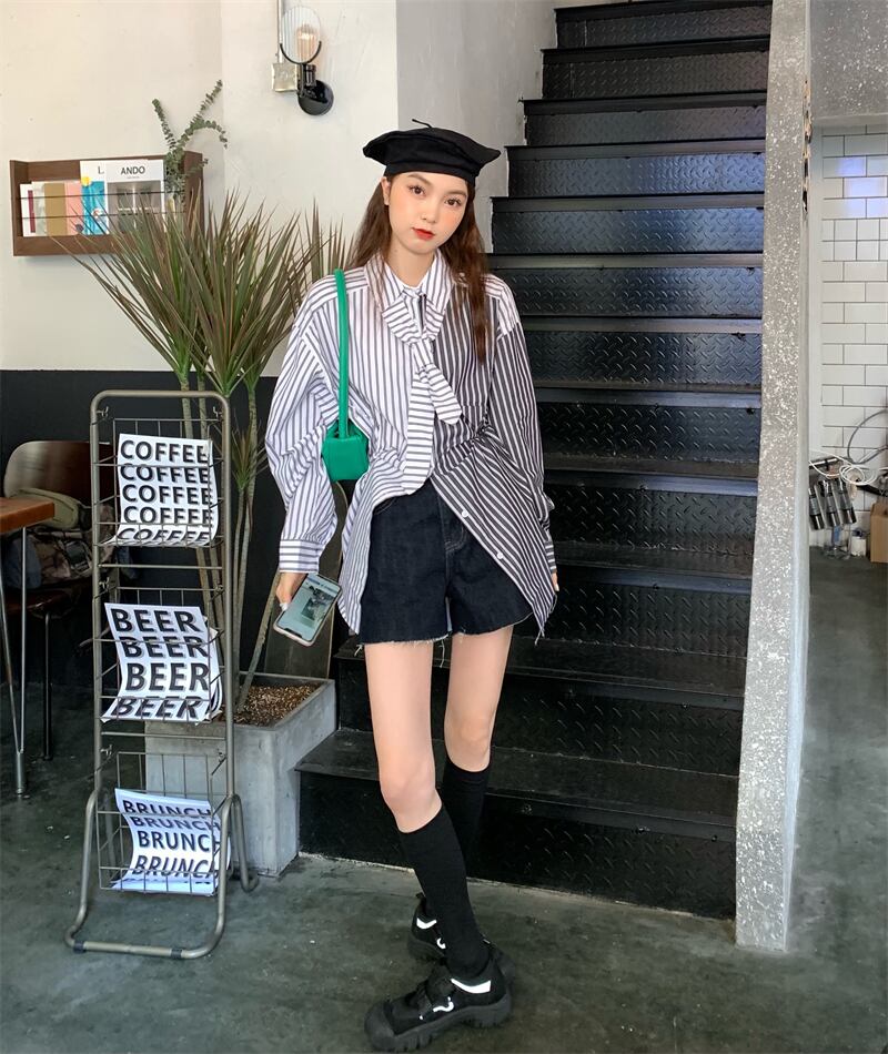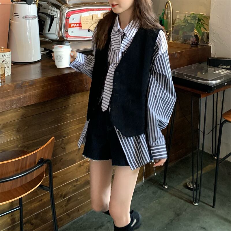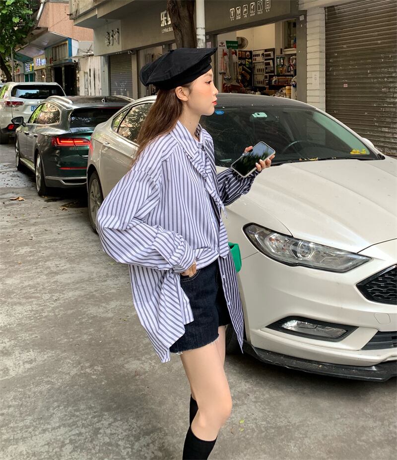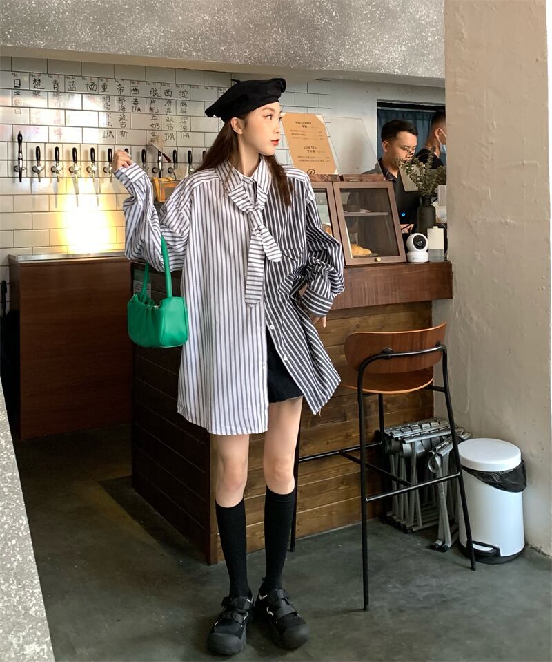 カラーストライプシャツ オータムルーズトップス ロング 秋物 ステッチ モンロー15596216426