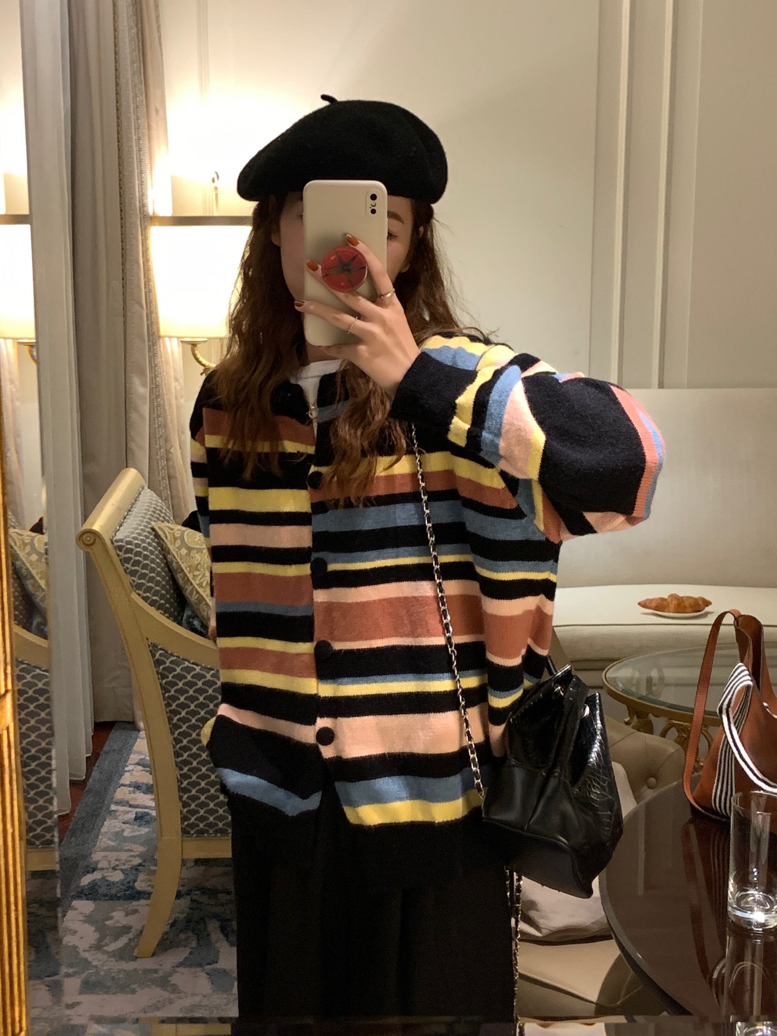 カラーストライプスタンダードニットカーディガンオータムルーズトップス コート ロング レトロ 秋物 モンロー68356381002