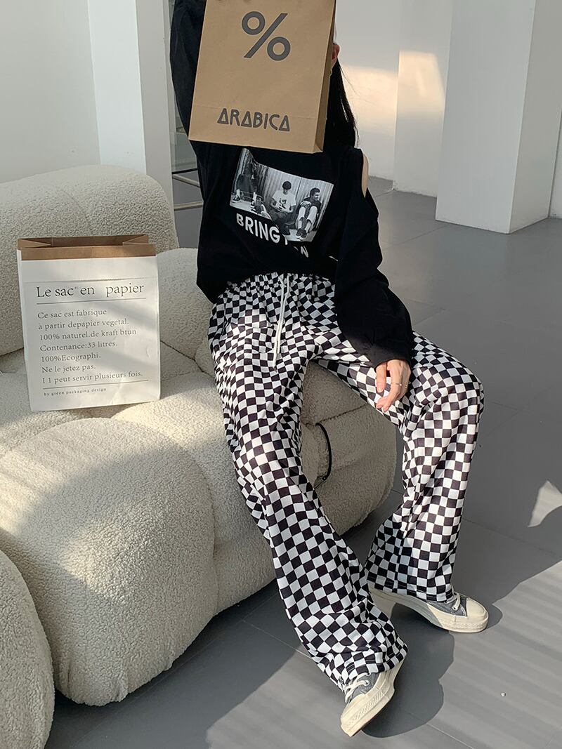 ブラックホワイト格子柄カジュアルパンツ スプリングオータムルーズスタンダード レトロ 春物 秋物 モンロー95894694761