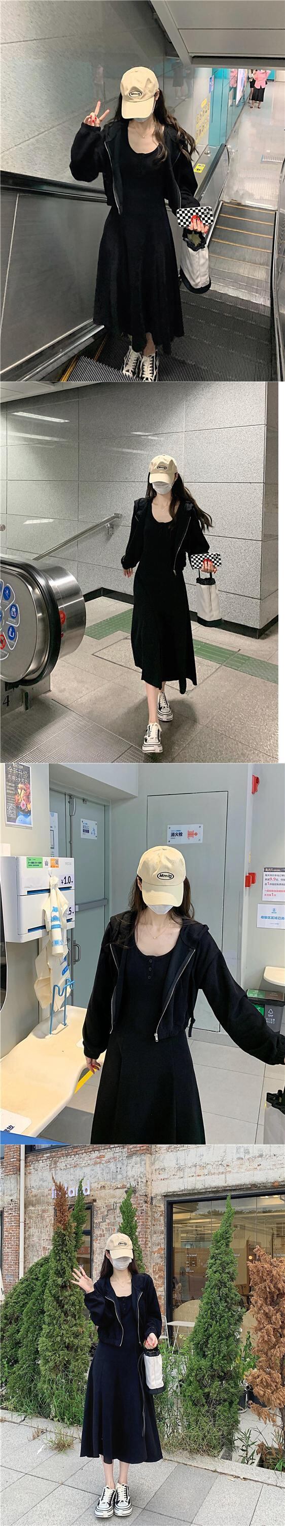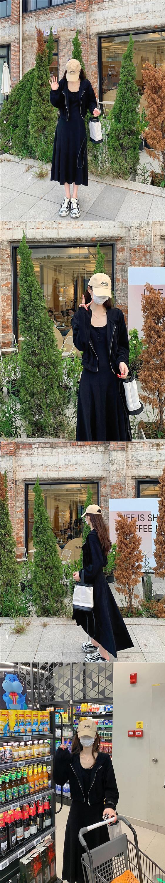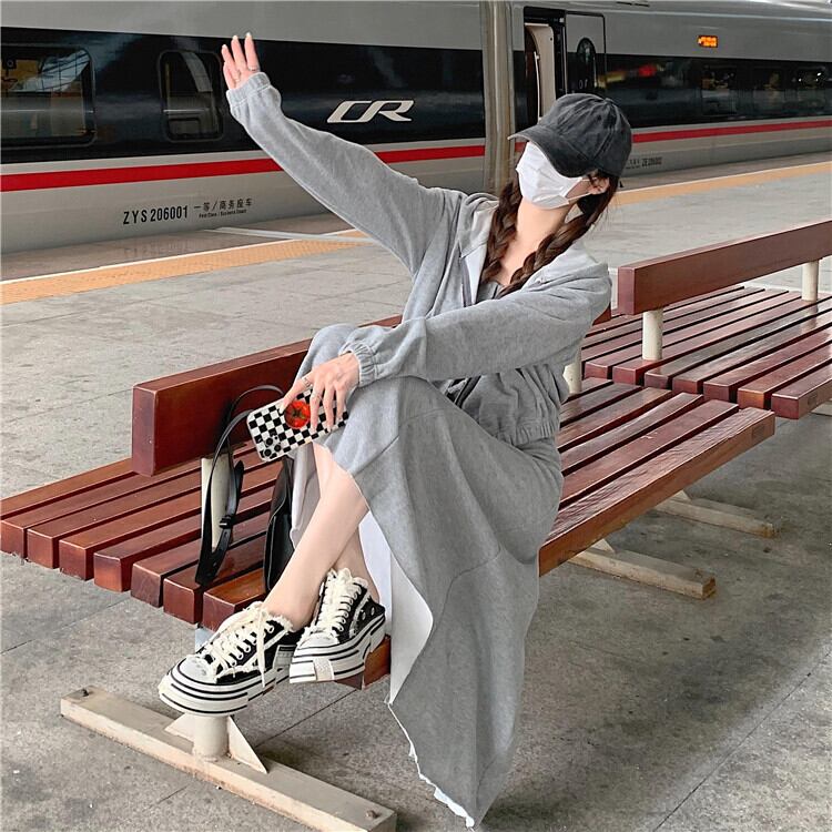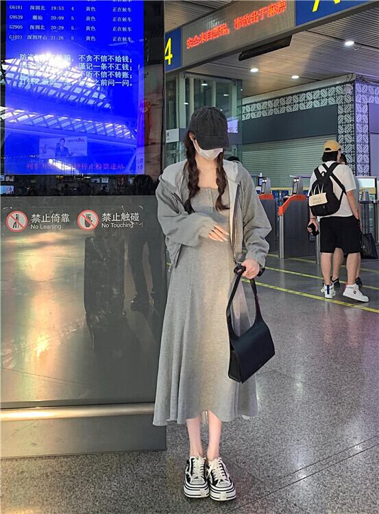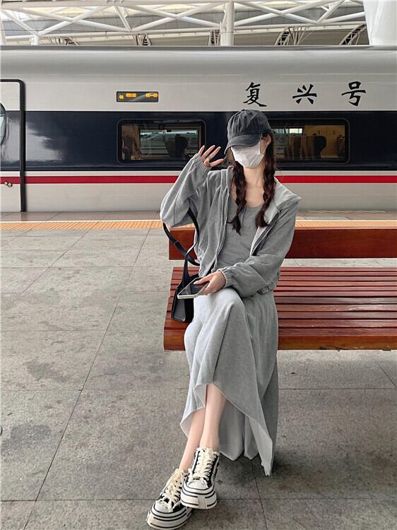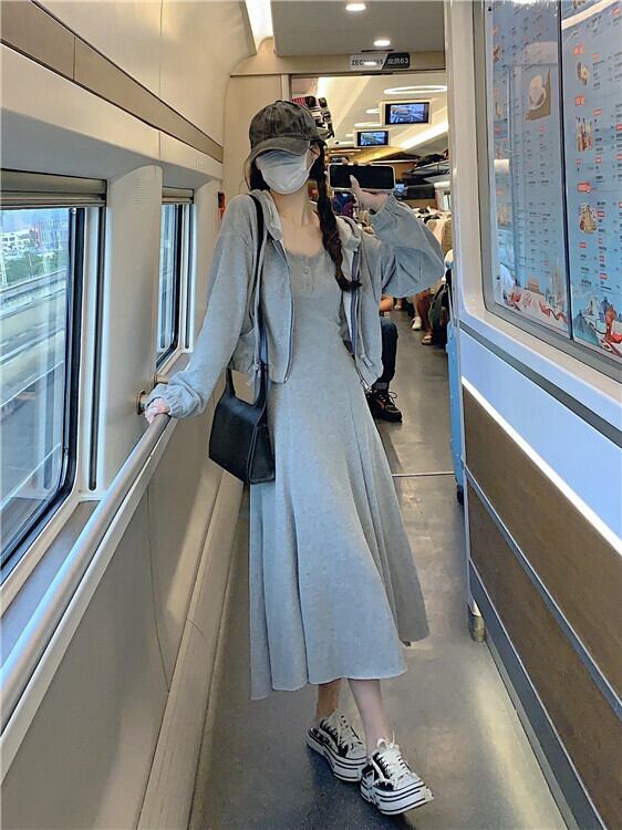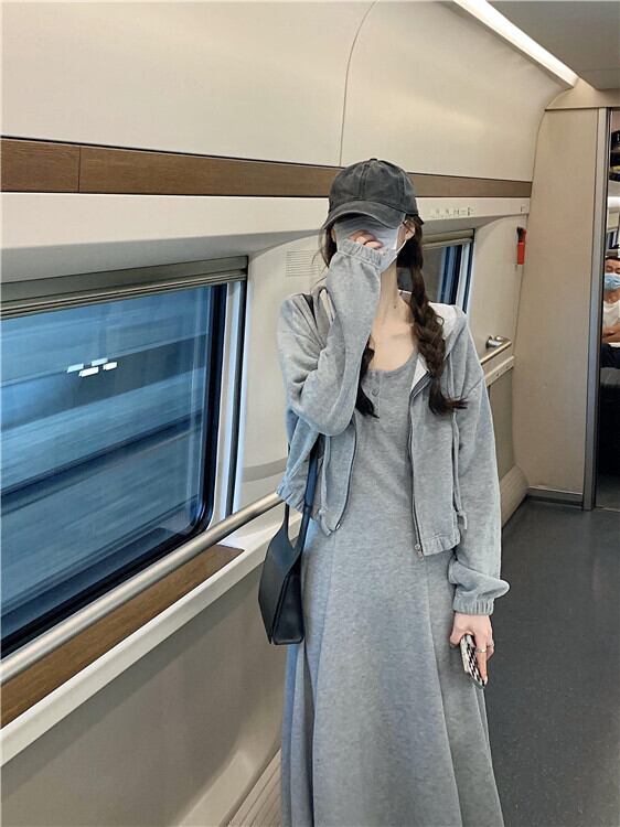 色:グレーのドレス,ブラックサスペンダースカート,グレーのセーターコート,ブラックスウェットシャツ